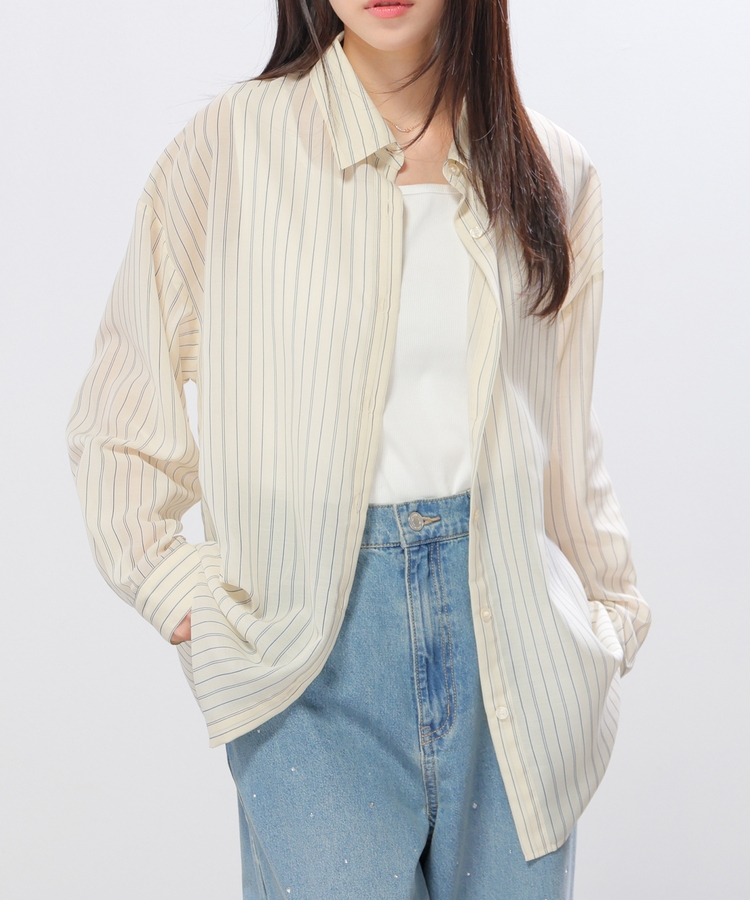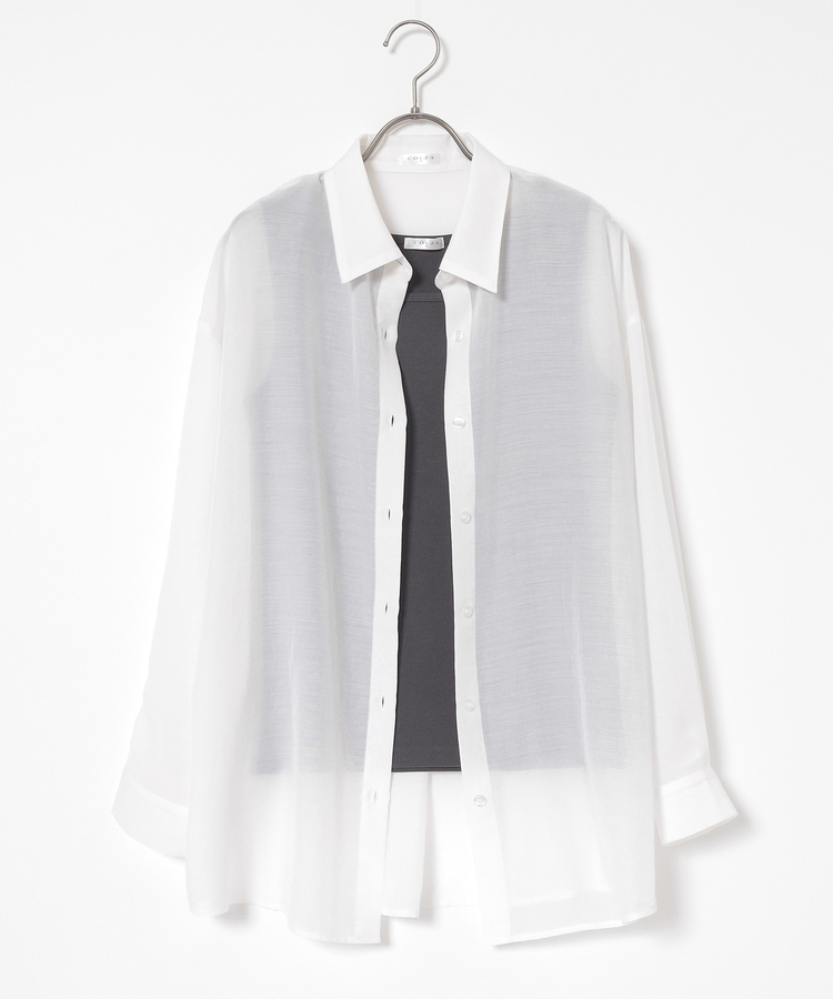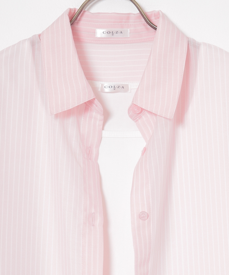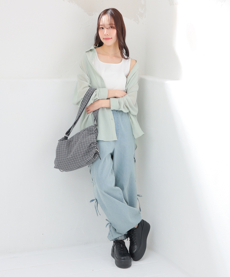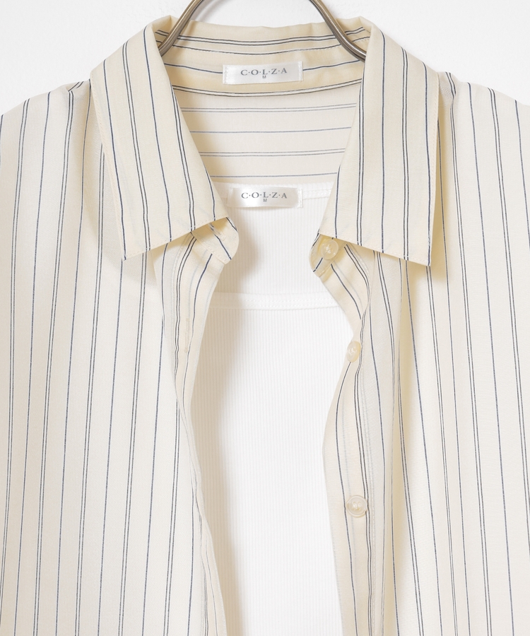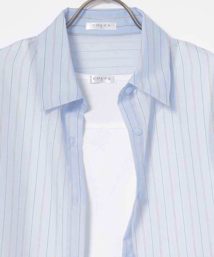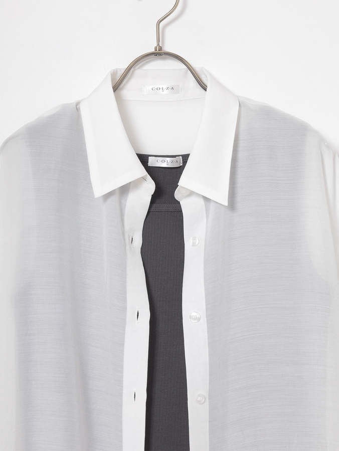 さっと重ね着すれば簡単にトレンドスタイルが完成する、シアーシャツ×タンクトップのセット。