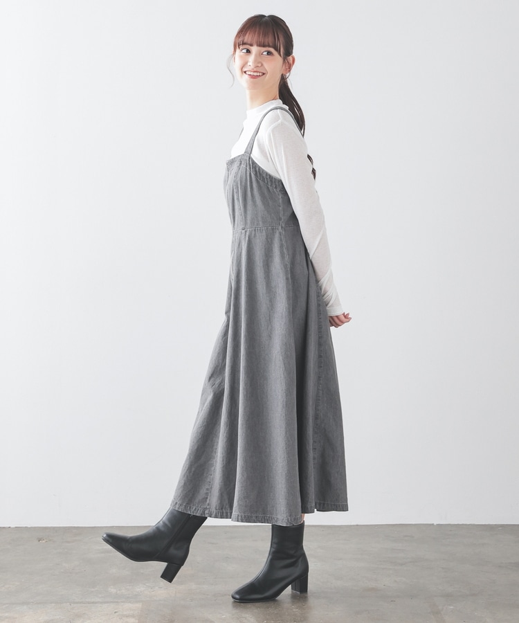 高めの切り替え位置から広がるAラインシルエットとロング丈で、スタイルアップ効果もあり大人っぽい雰囲気に。