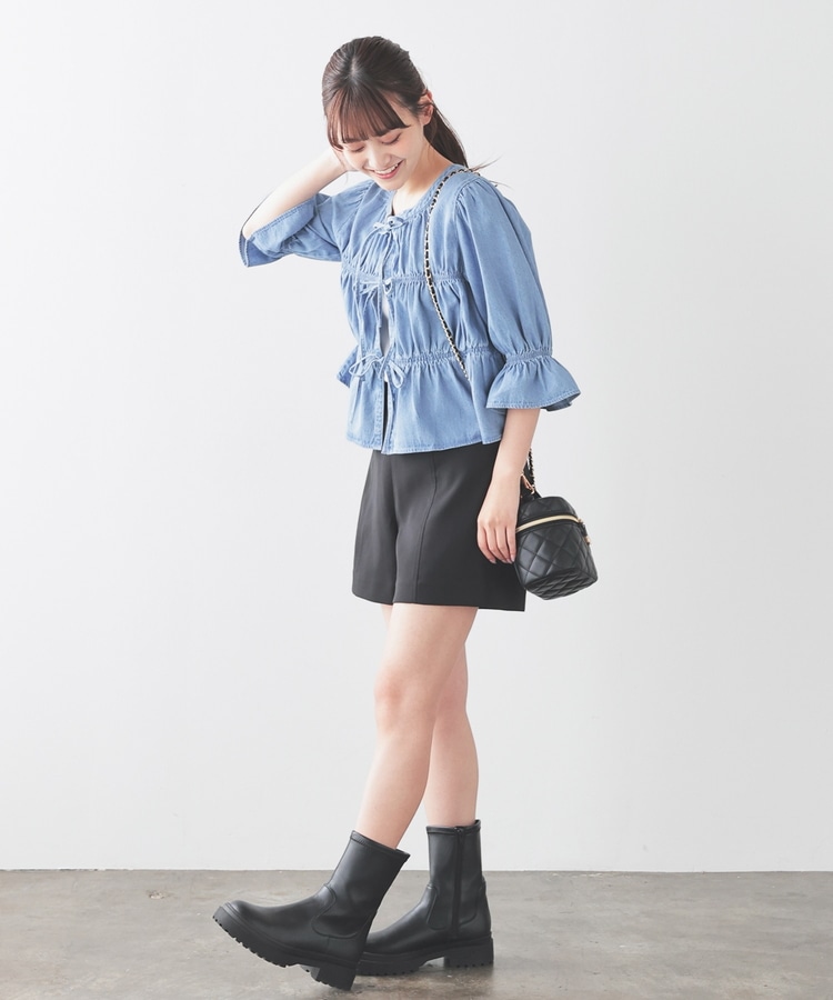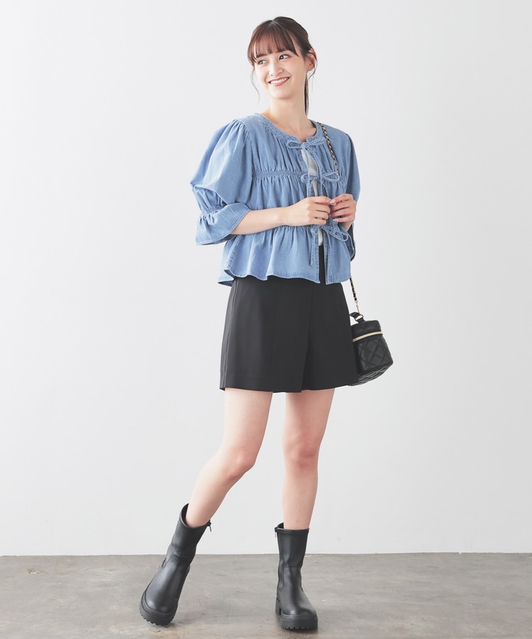 ハイウエストやボリューム感のあるボトムスと合わせてもバランスよく着られ、どんなボトムスとも好相性。