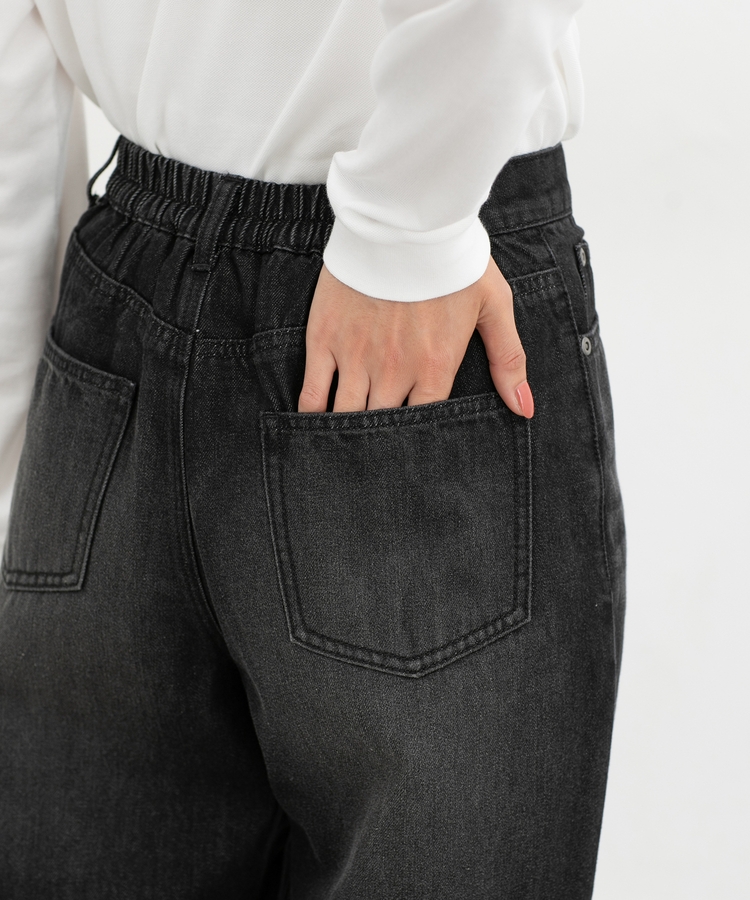 水の使用量を削減し、レーザーによるダメージ加工で薬品を使用せず、環境に配慮して作られた、柔らかめで洗濯後も乾きやすい綿混デニム素材。