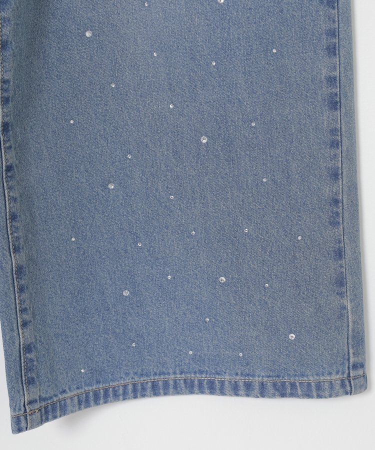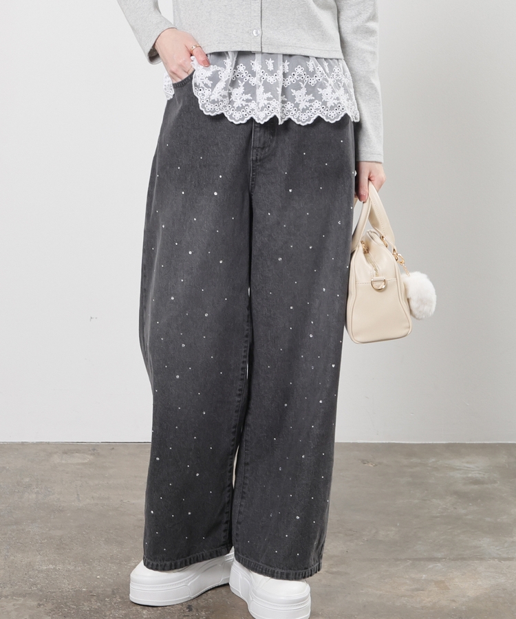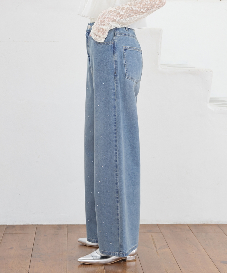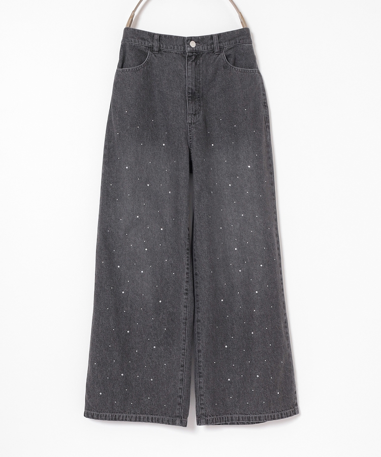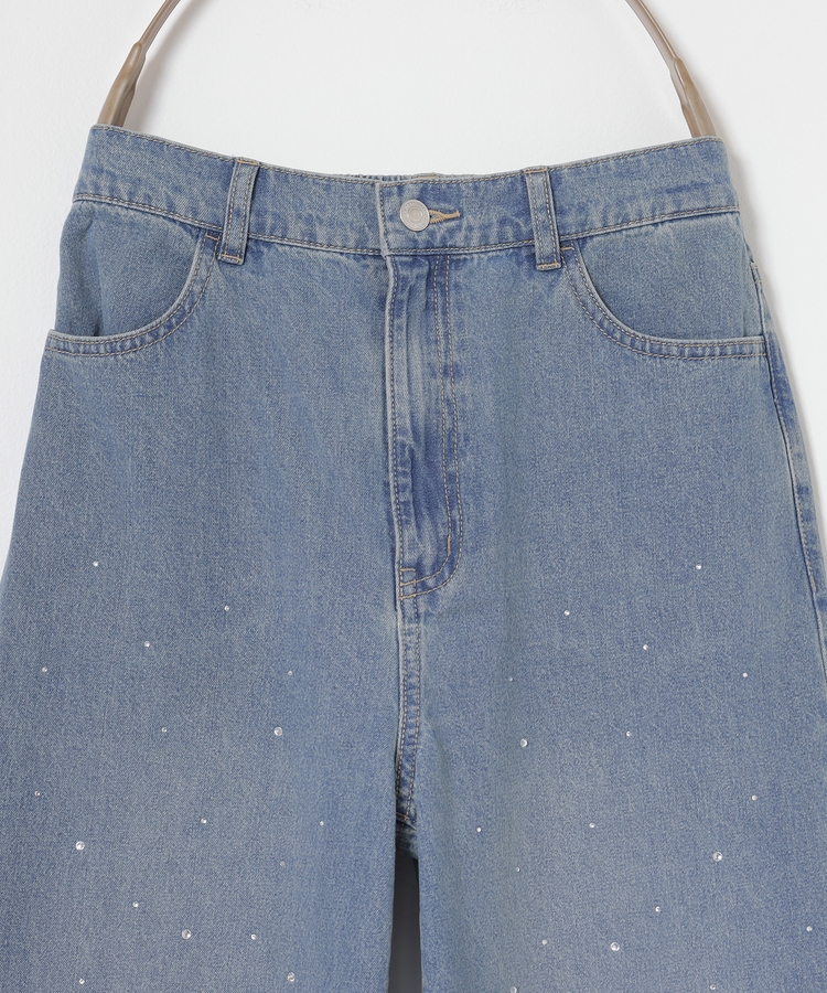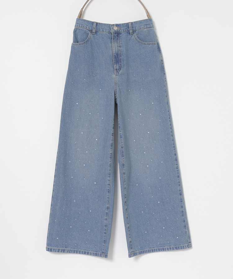 広がりすぎないワイドシルエットのデニムに、きらきらのラインストーンをちりばめた旬なデザイン。