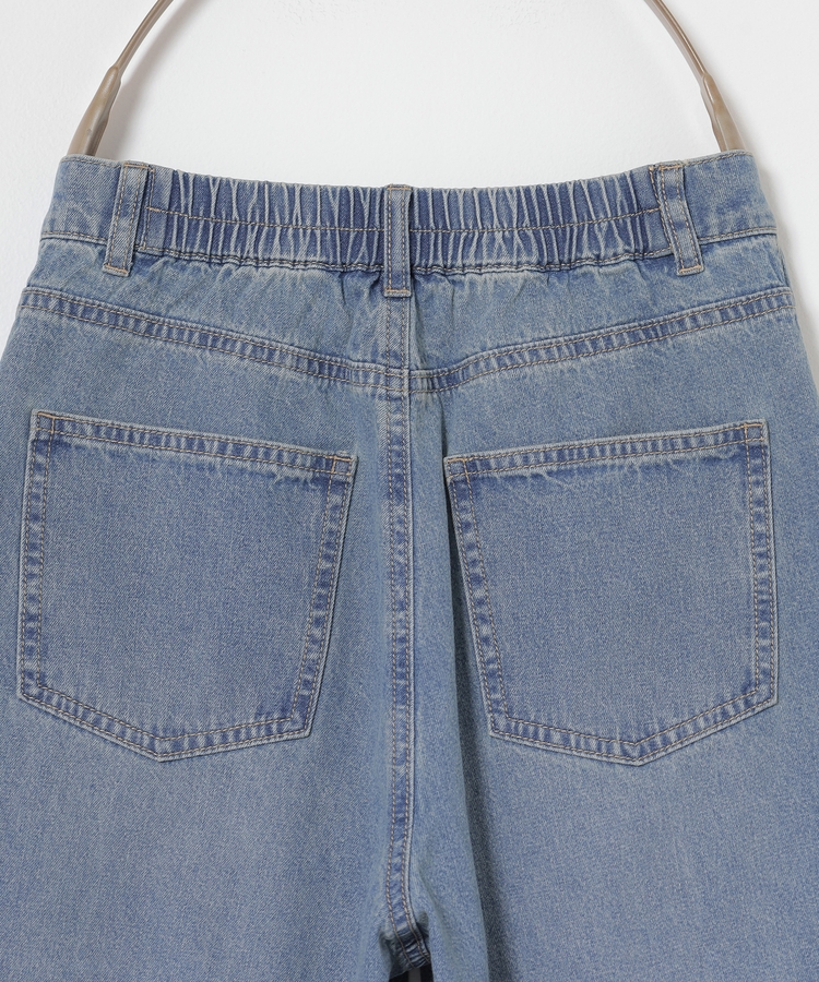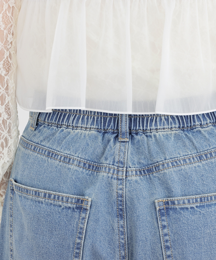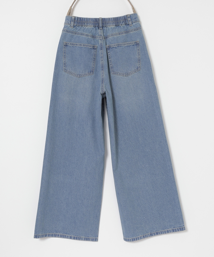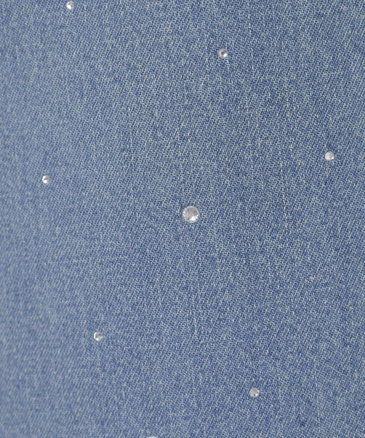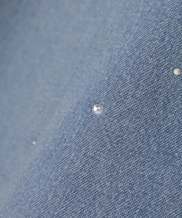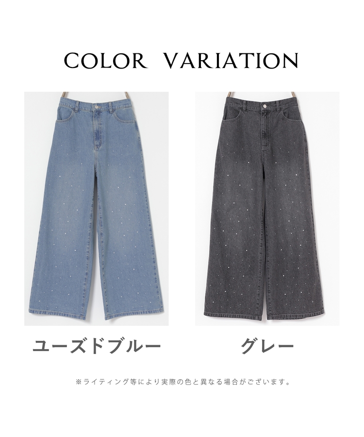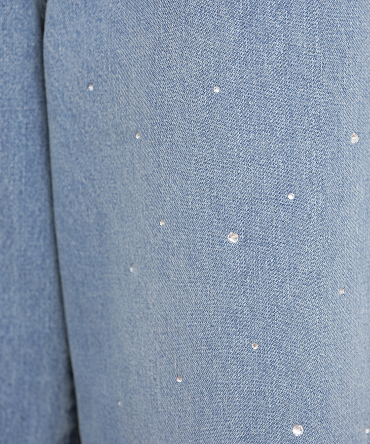 広がりすぎないワイドシルエットのデニムに、きらきらのラインストーンをちりばめた旬なデザイン。