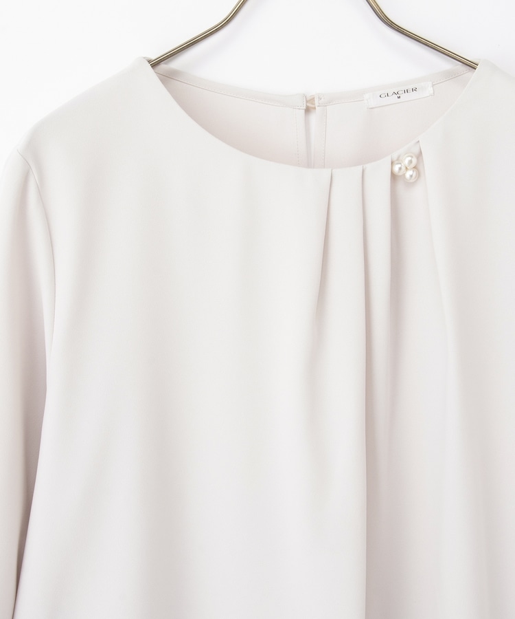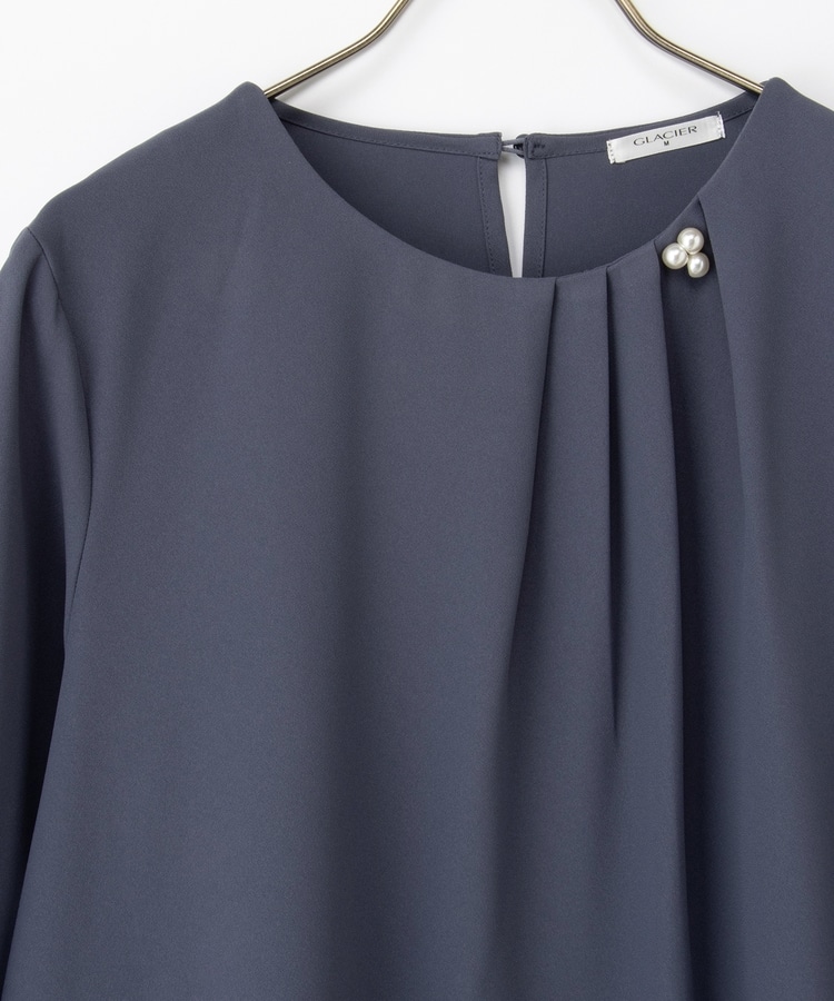 アシンメトリーな衿元タックにパール風ビーズを添えた上品で華やかなデザイン。