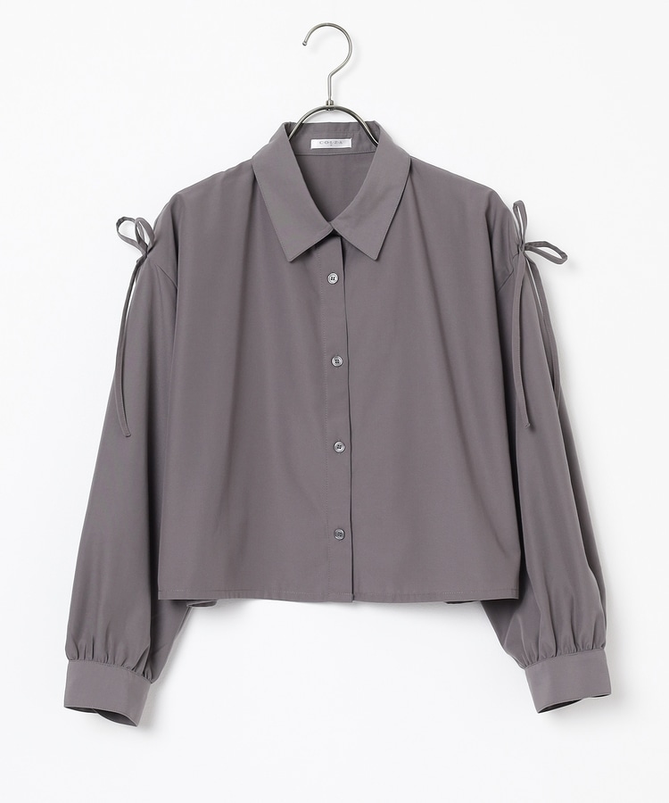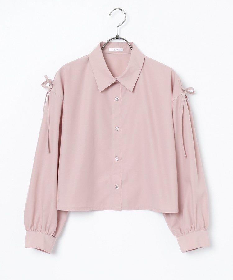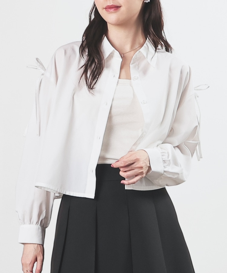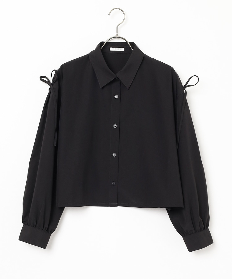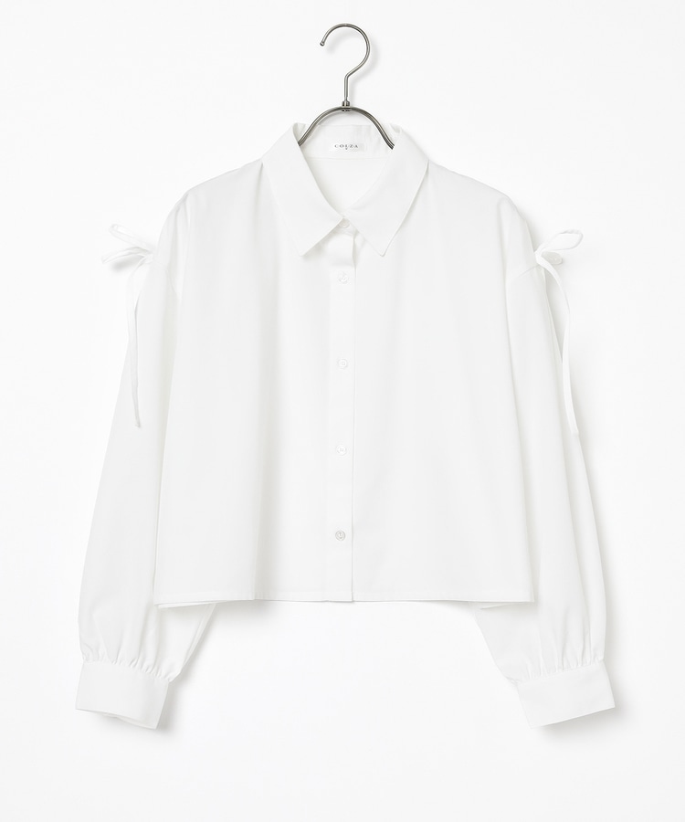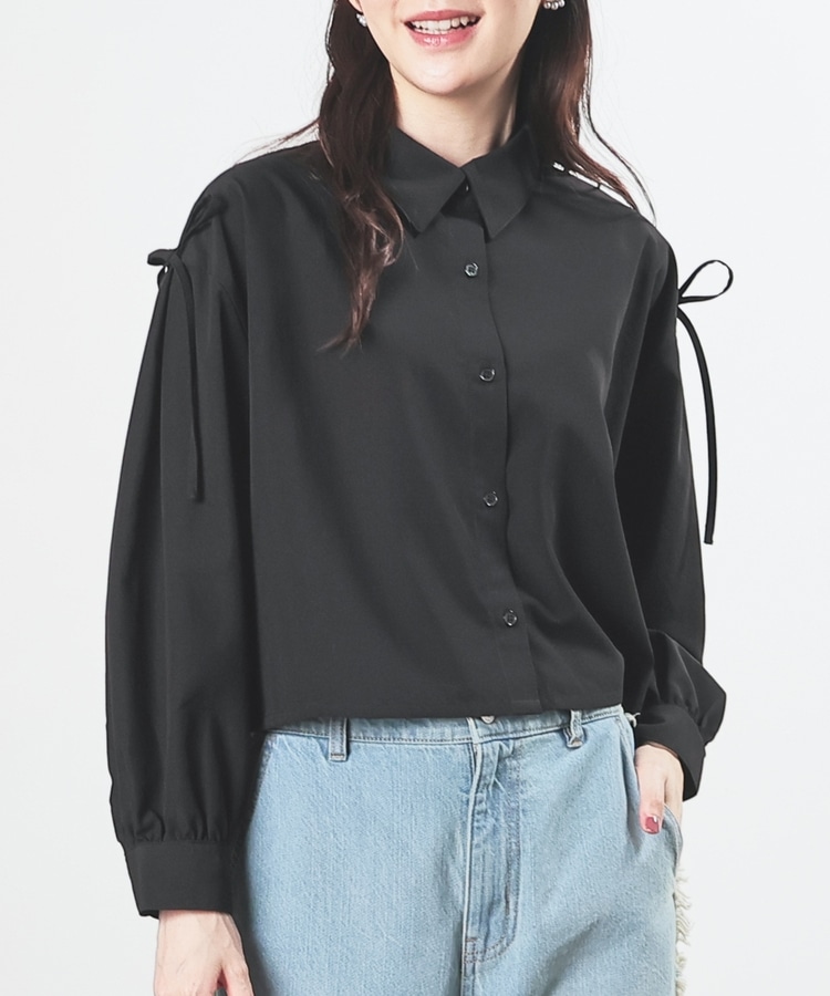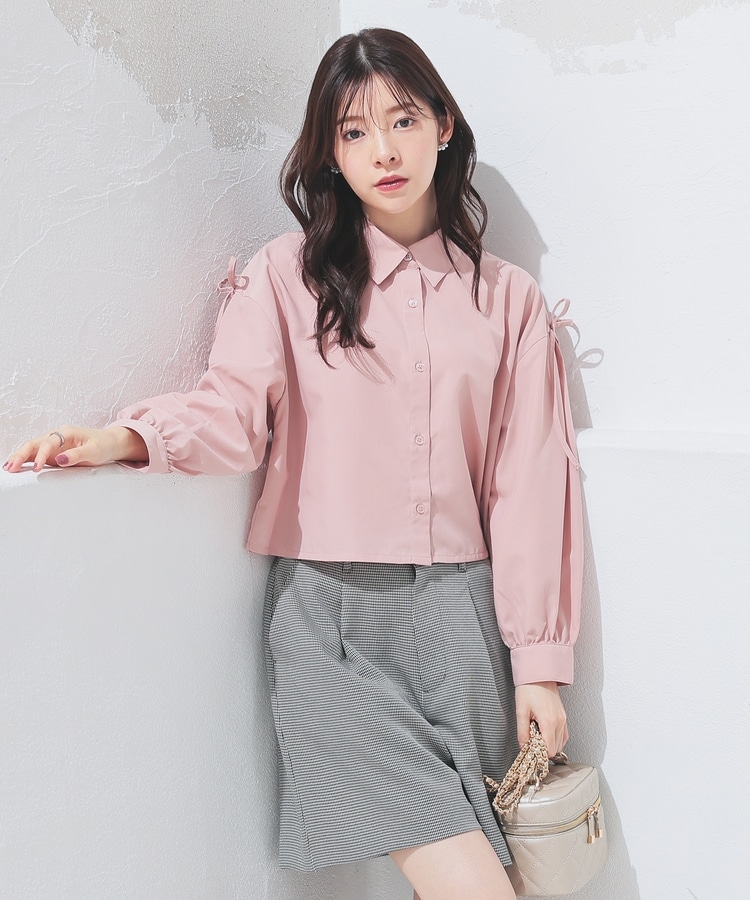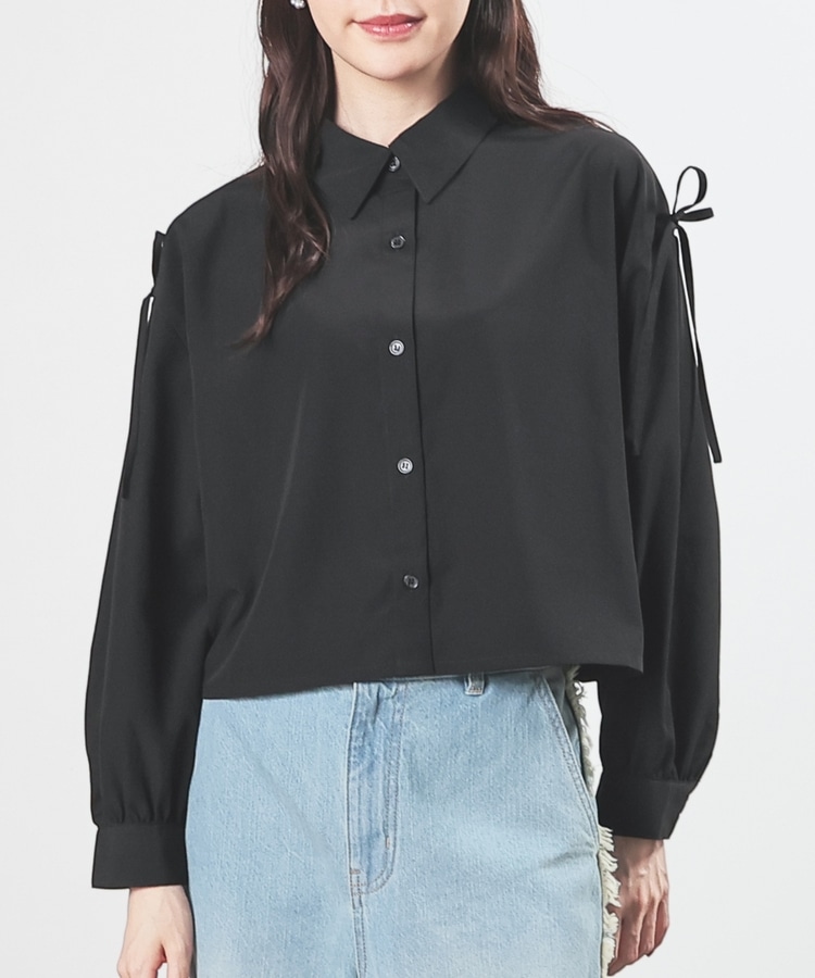 シンプルなレギュラーカラーに肩のリボンがキュートなデザイン。