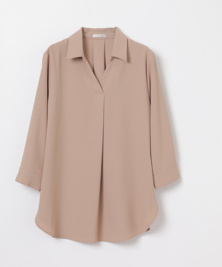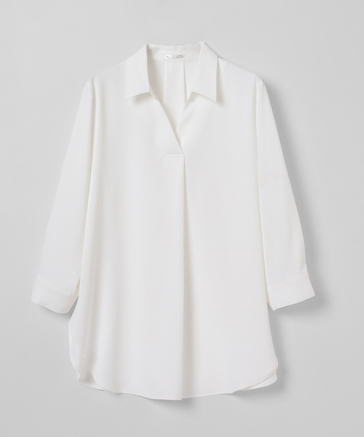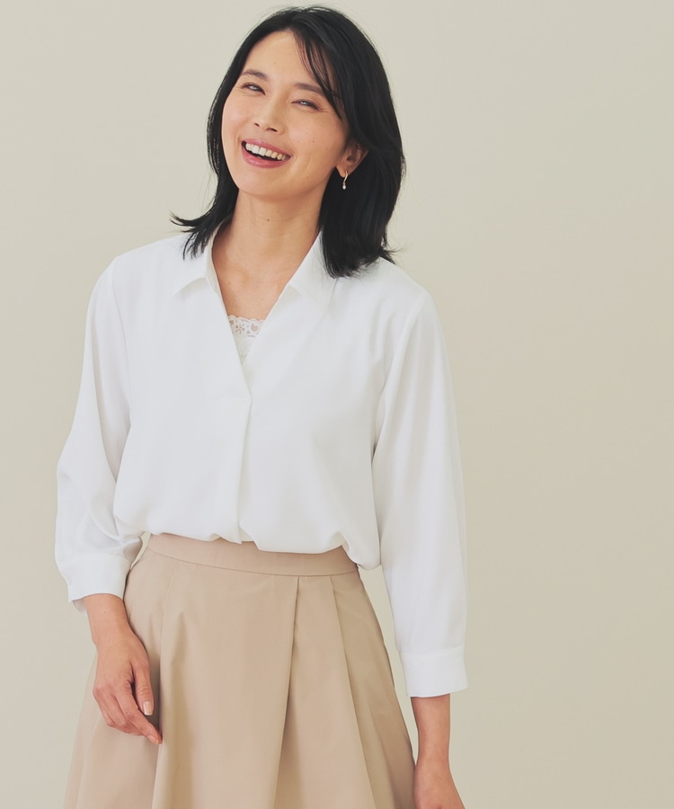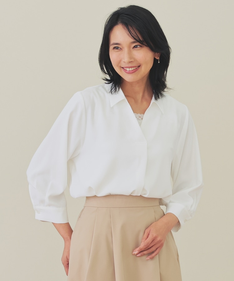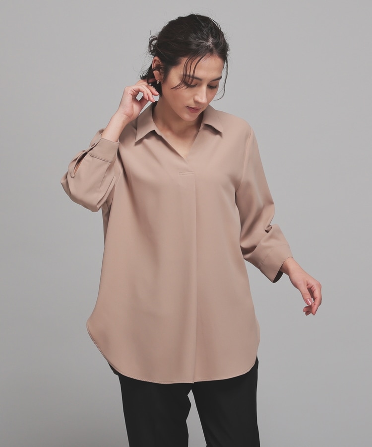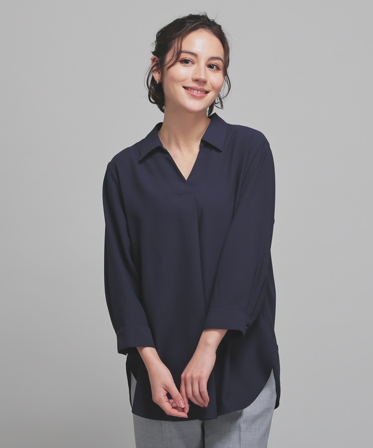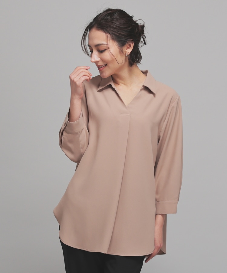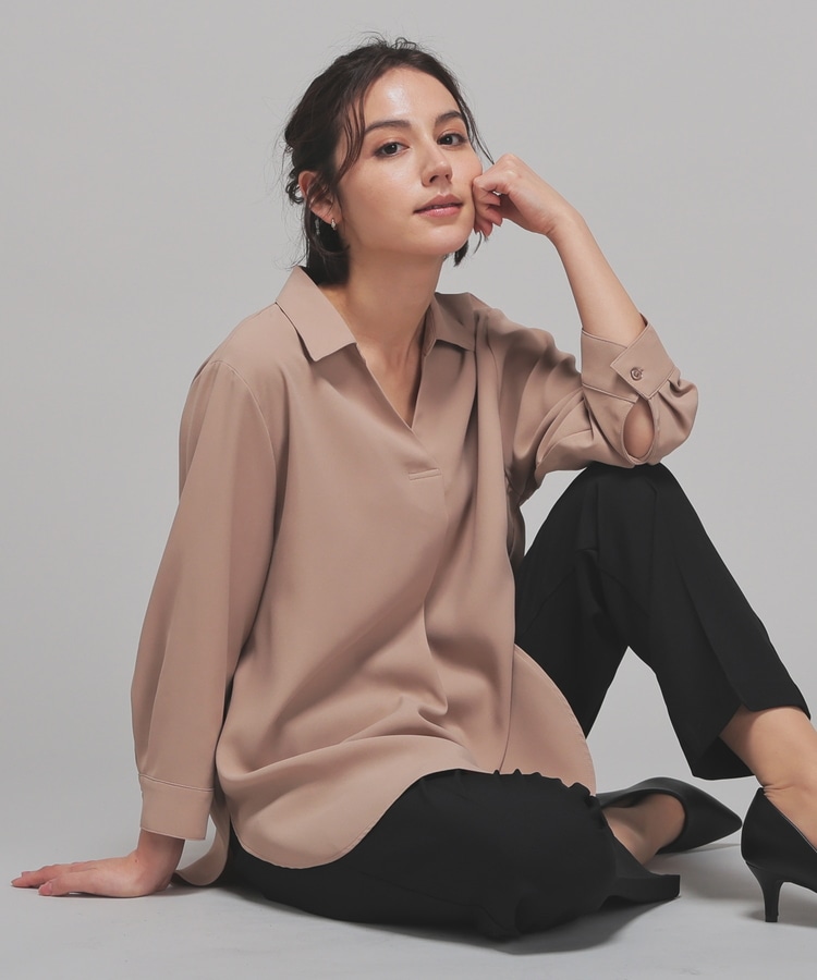 首元をすっきり見せるスキッパーで、シンプルながらさらっと着るだけでコーデ映えする、大人な抜け感のあるデザイン。
