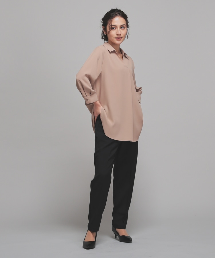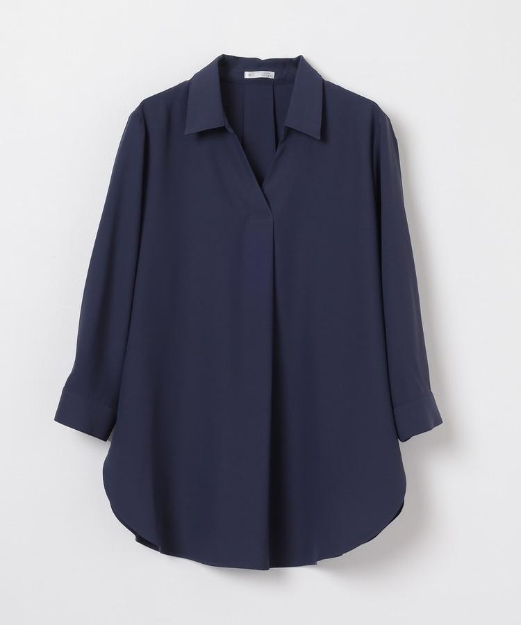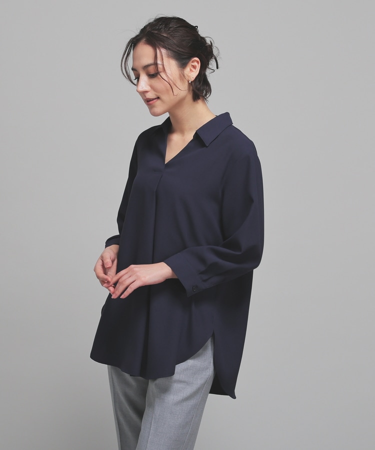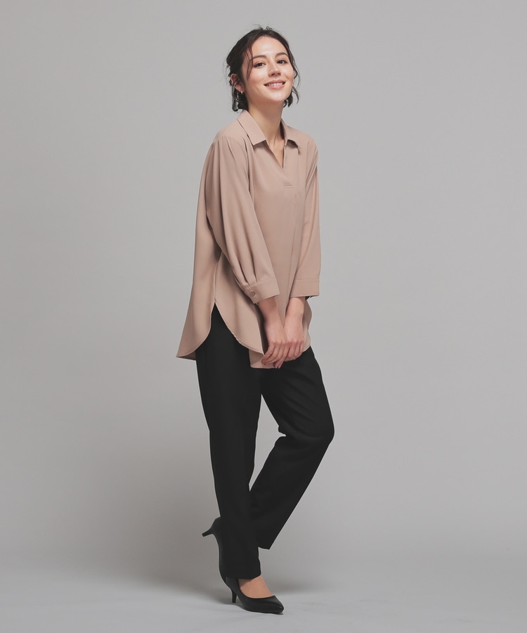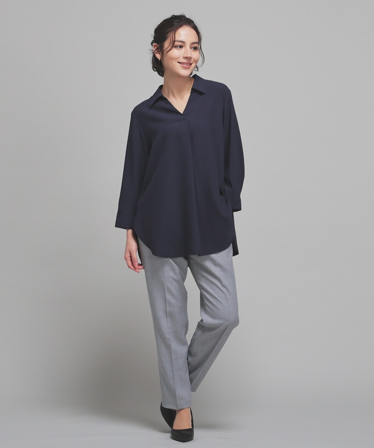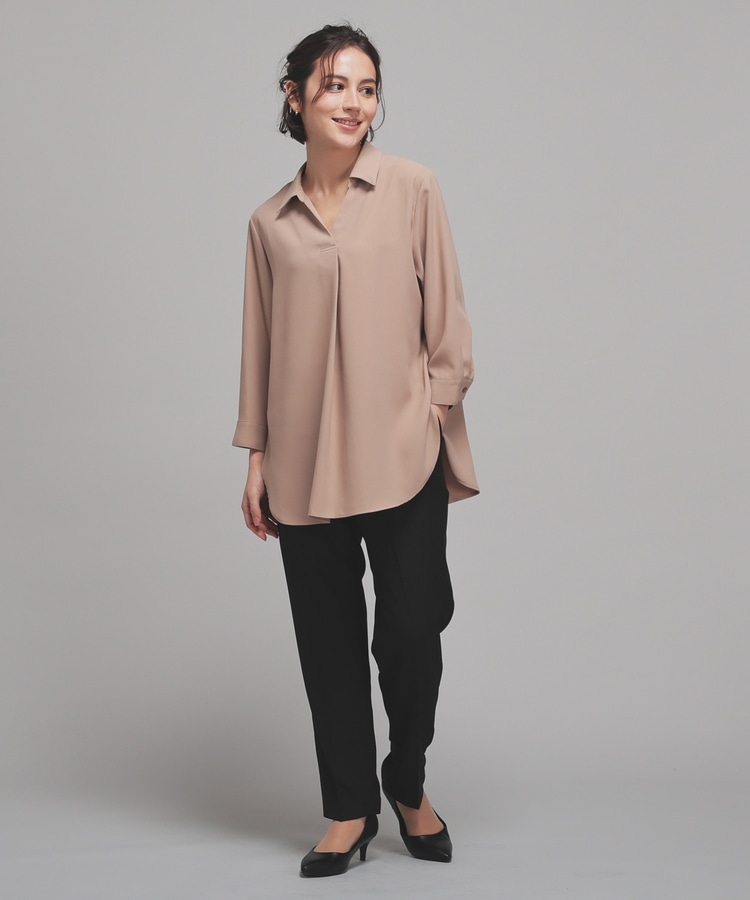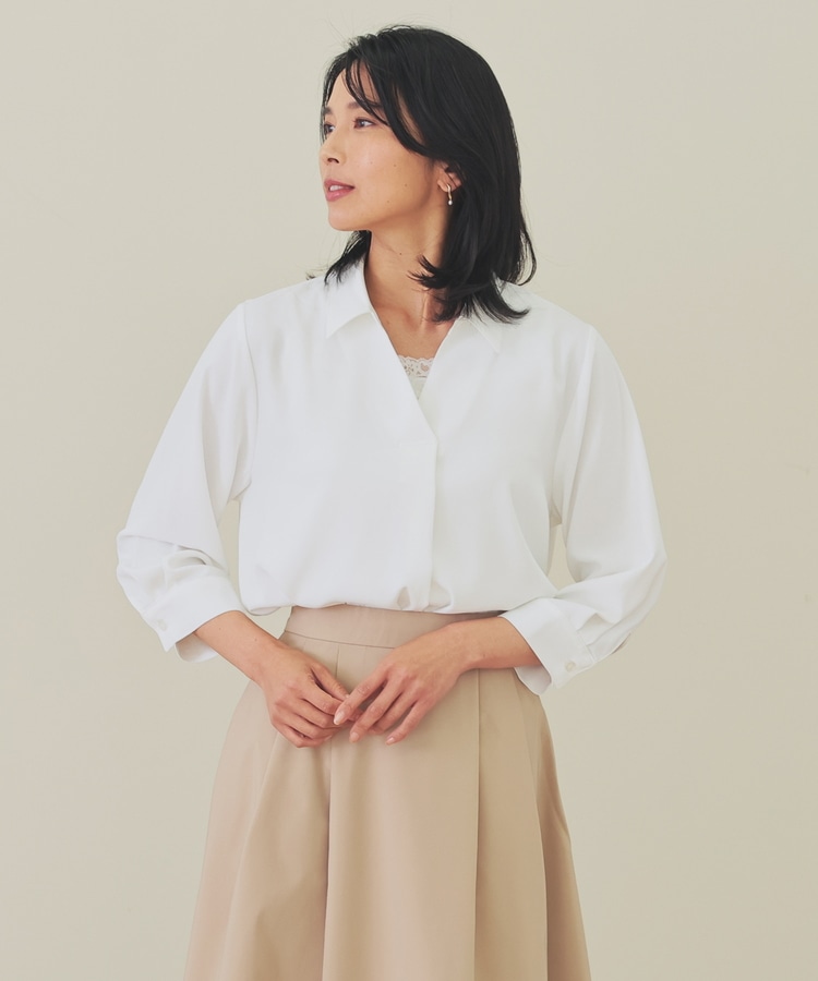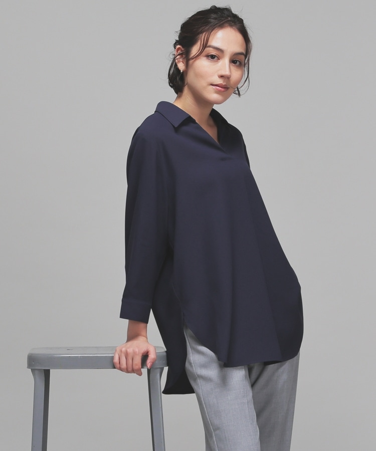 首元をすっきり見せるスキッパーで、シンプルながらさらっと着るだけでコーデ映えする、大人な抜け感のあるデザイン。