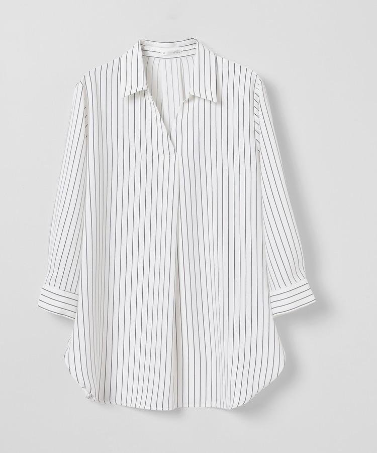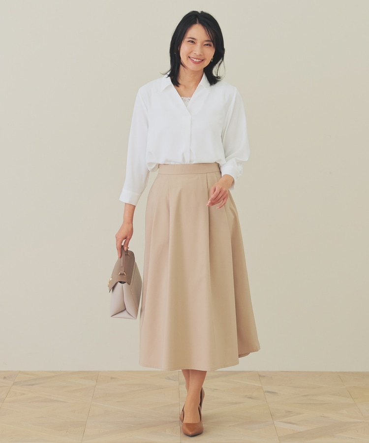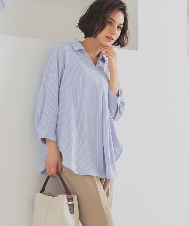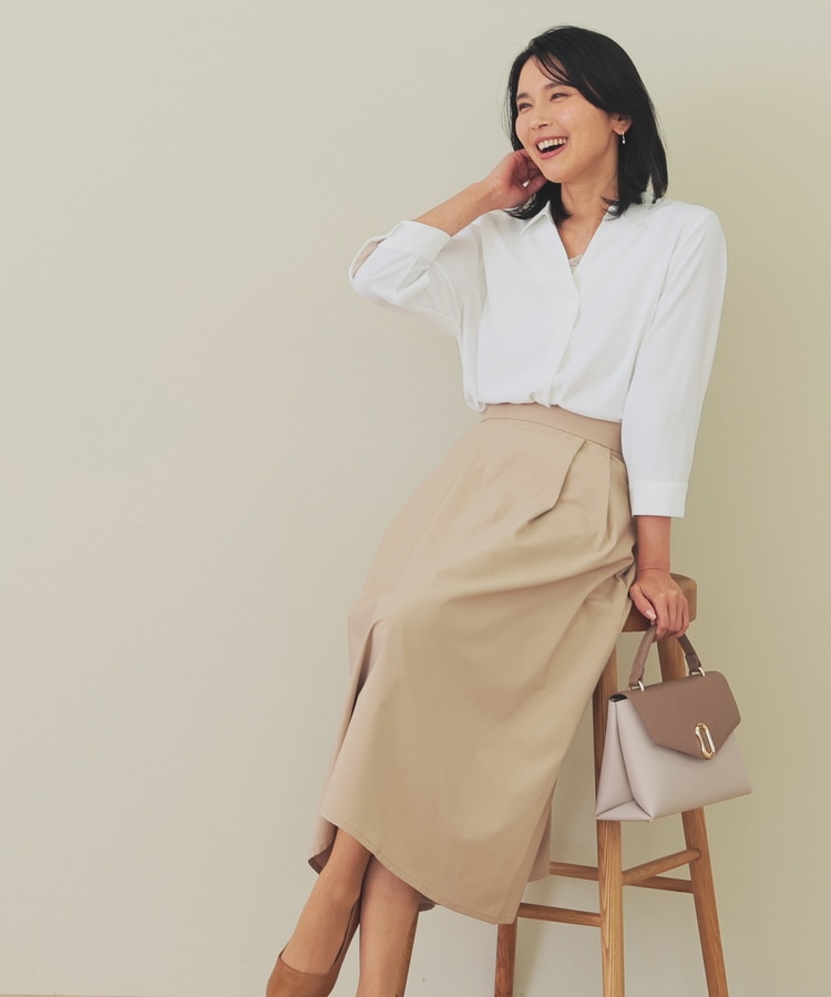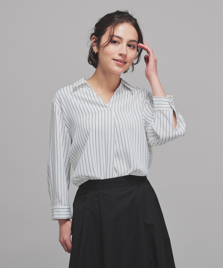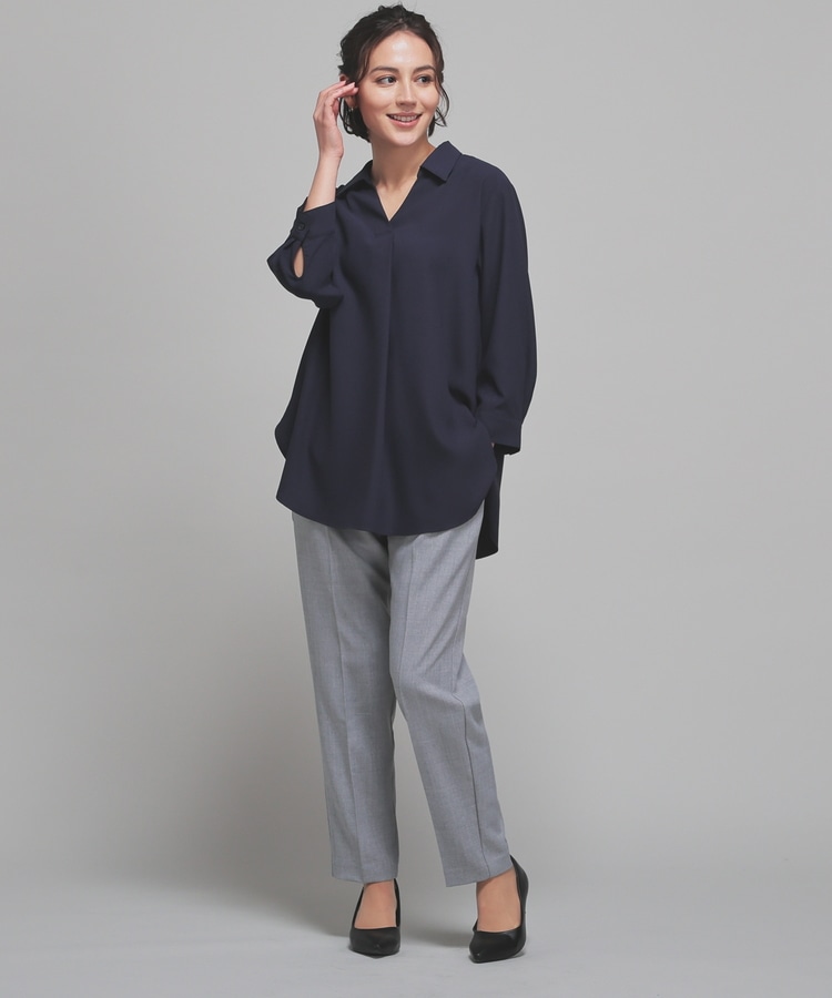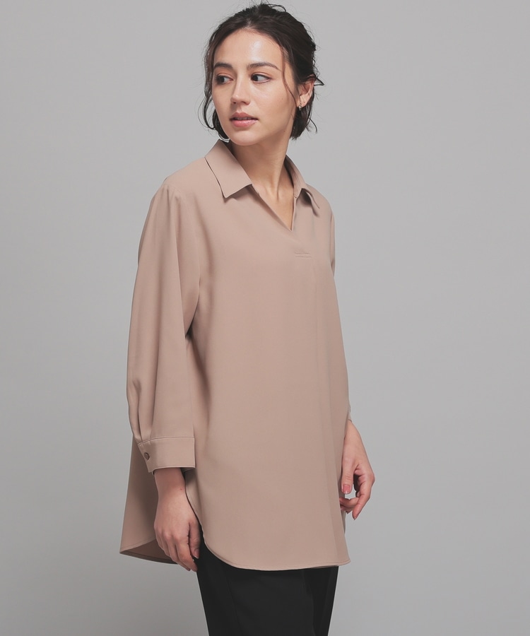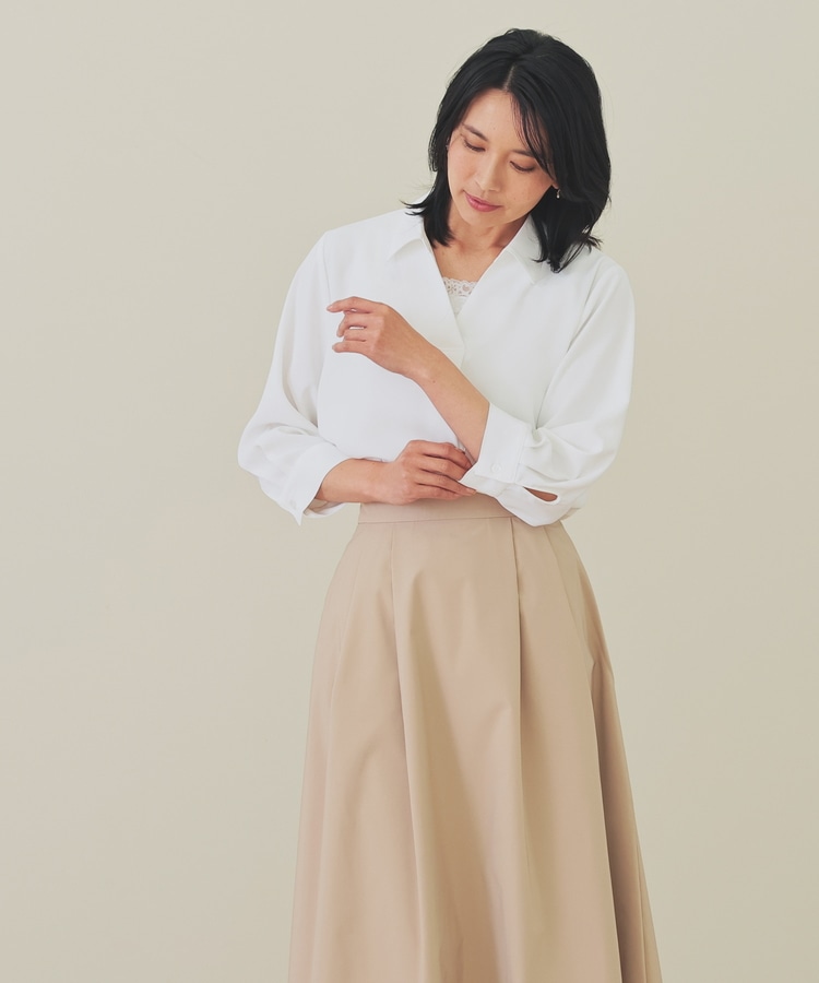 首元をすっきり見せるスキッパーで、シンプルながらさらっと着るだけでコーデ映えする、大人な抜け感のあるデザイン。