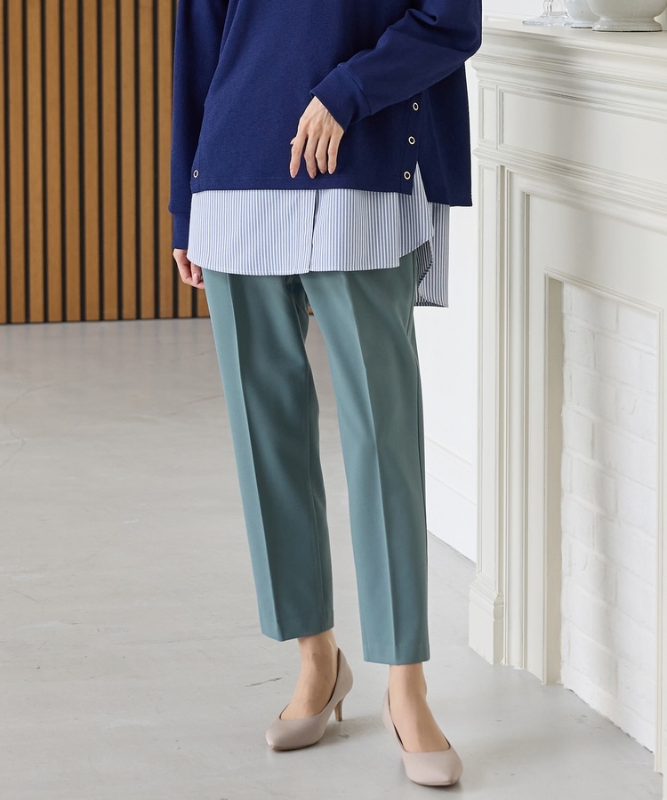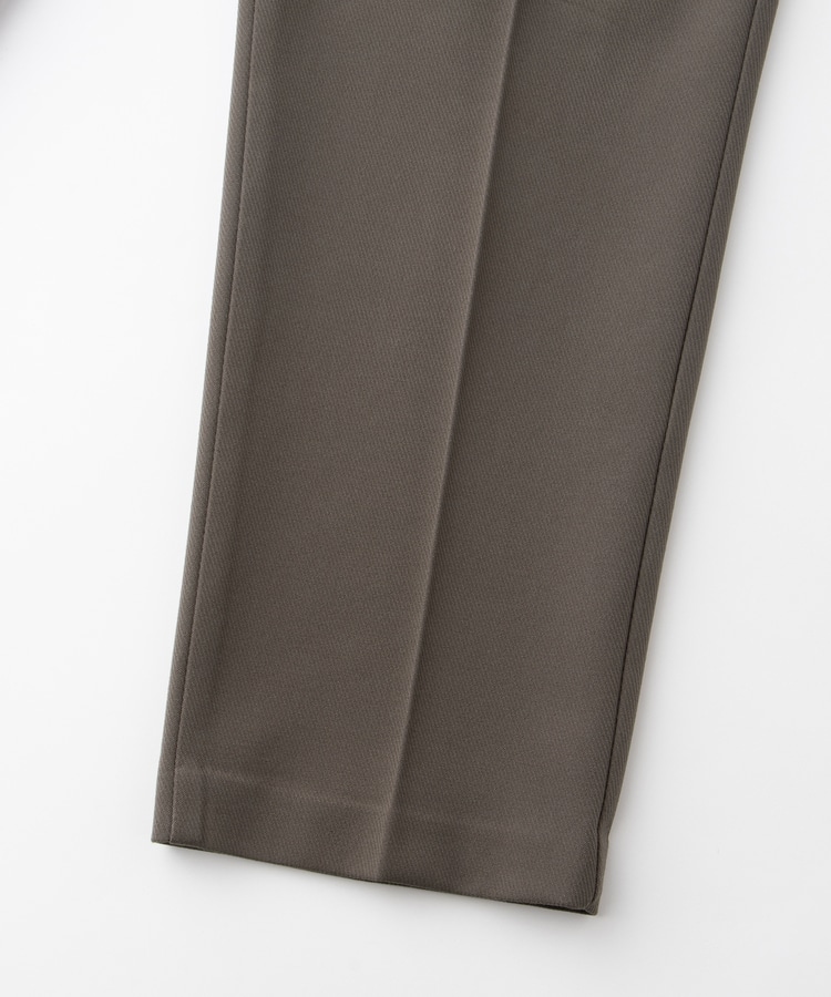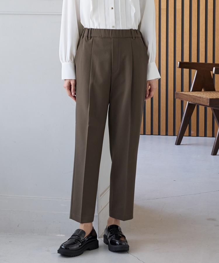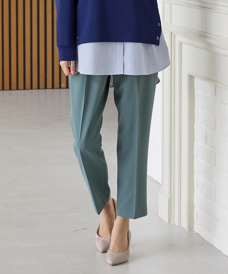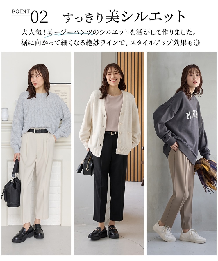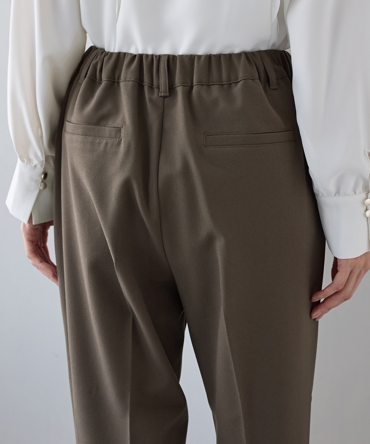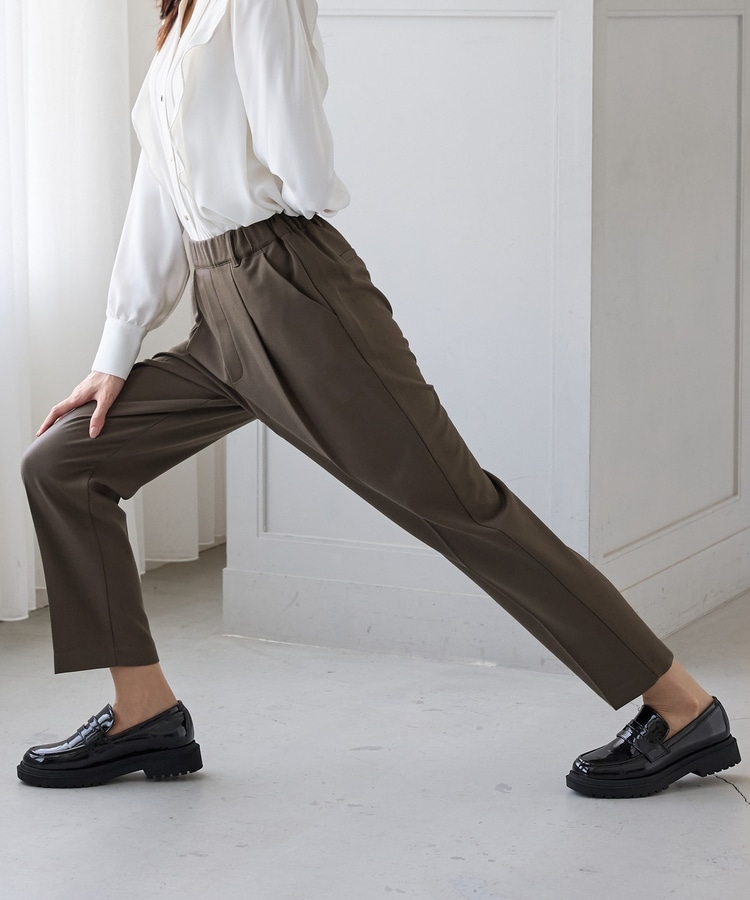 バックのフェイクポケットでヒップを高く見せ、きちんと感のあるセンタープレスと、腰回りのラインにこだわった、裾に向かって細くなる美しいシルエットで美脚効果も抜群。