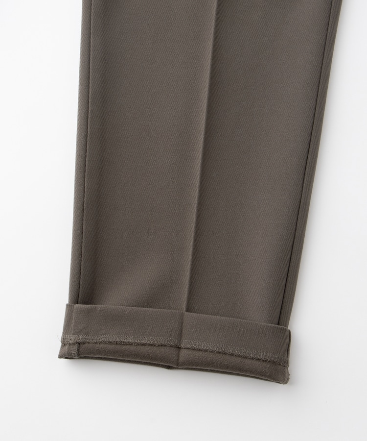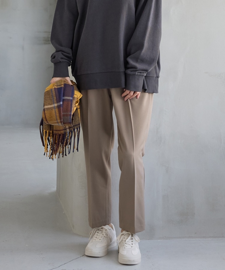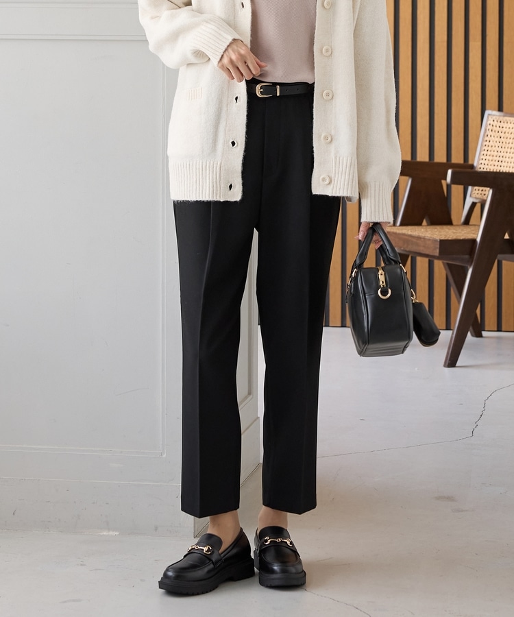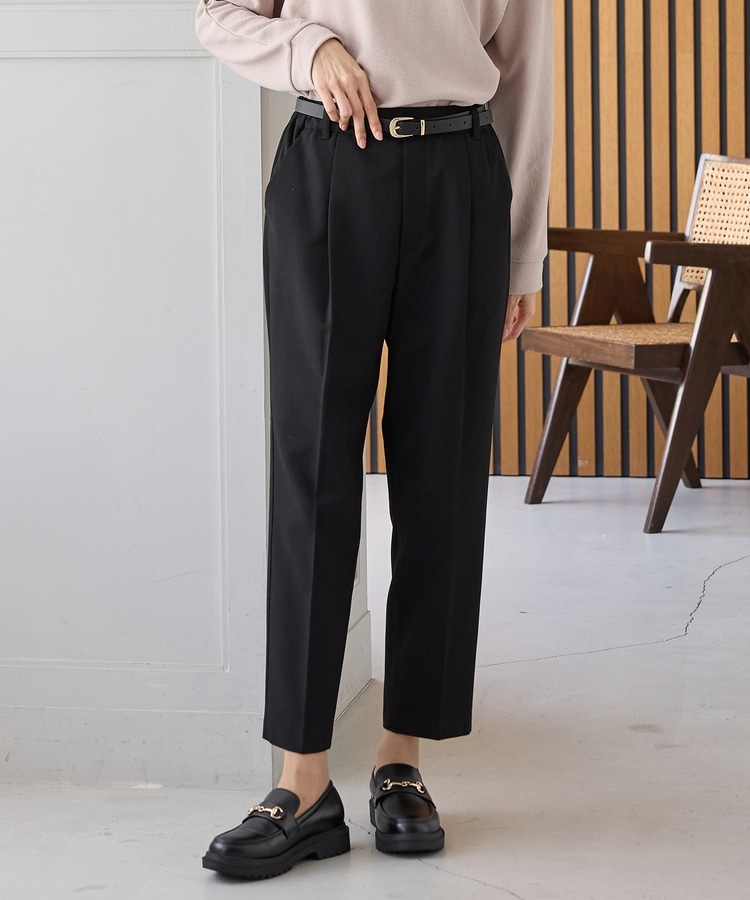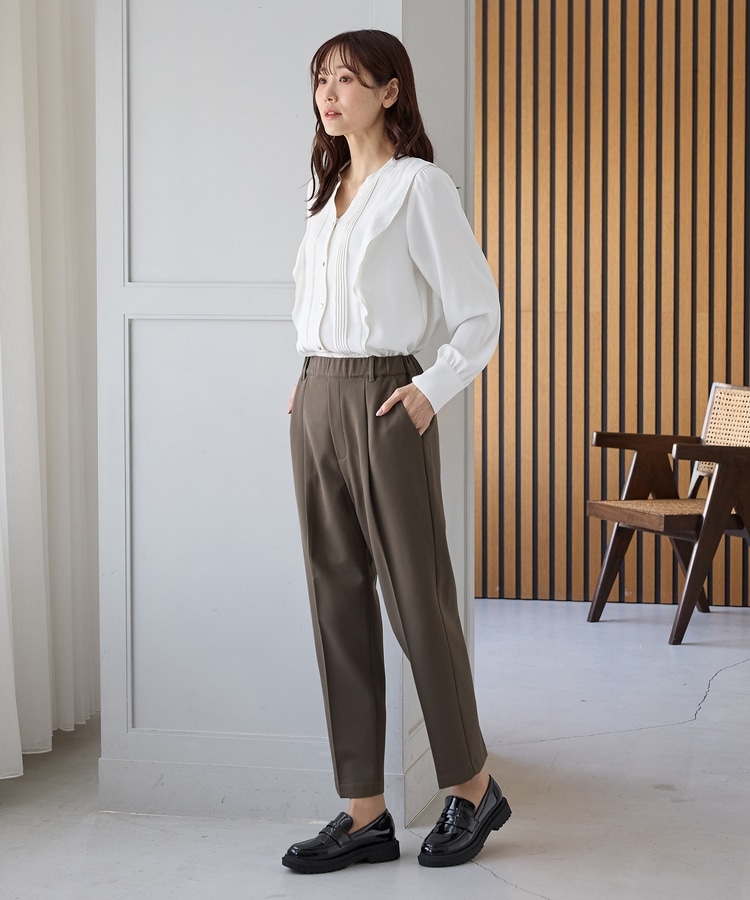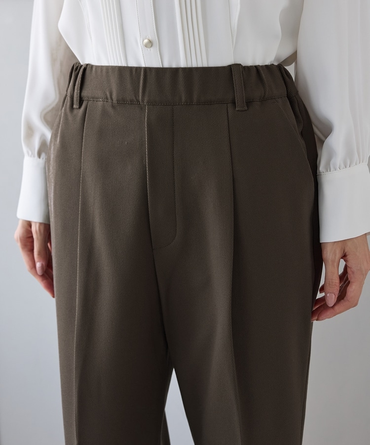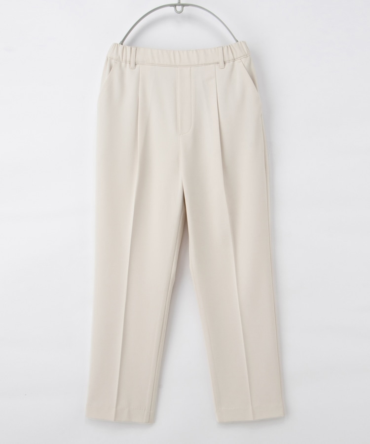 バックのフェイクポケットでヒップを高く見せ、きちんと感のあるセンタープレスと、腰回りのラインにこだわった、裾に向かって細くなる美しいシルエットで美脚効果も抜群。