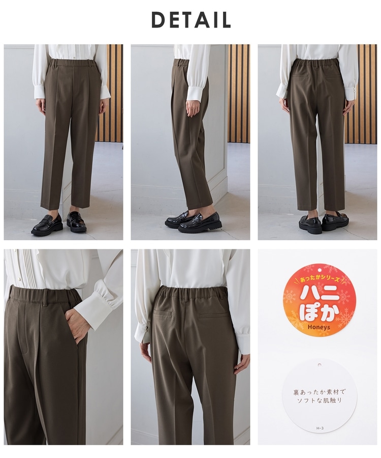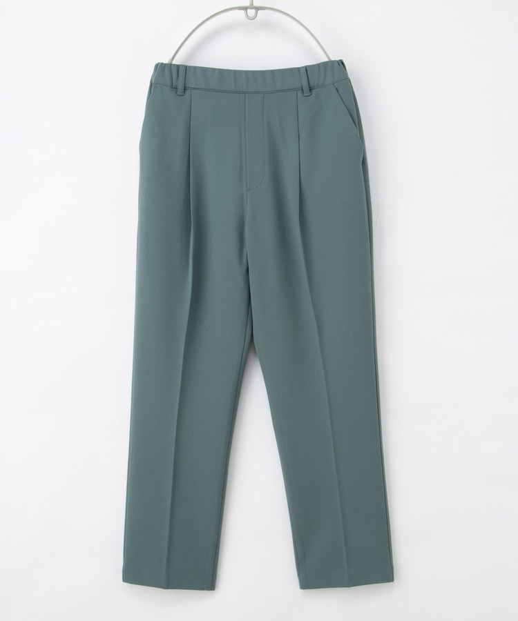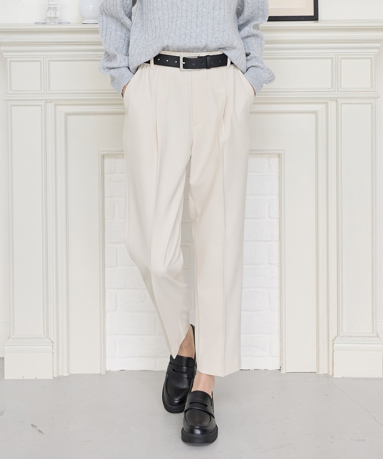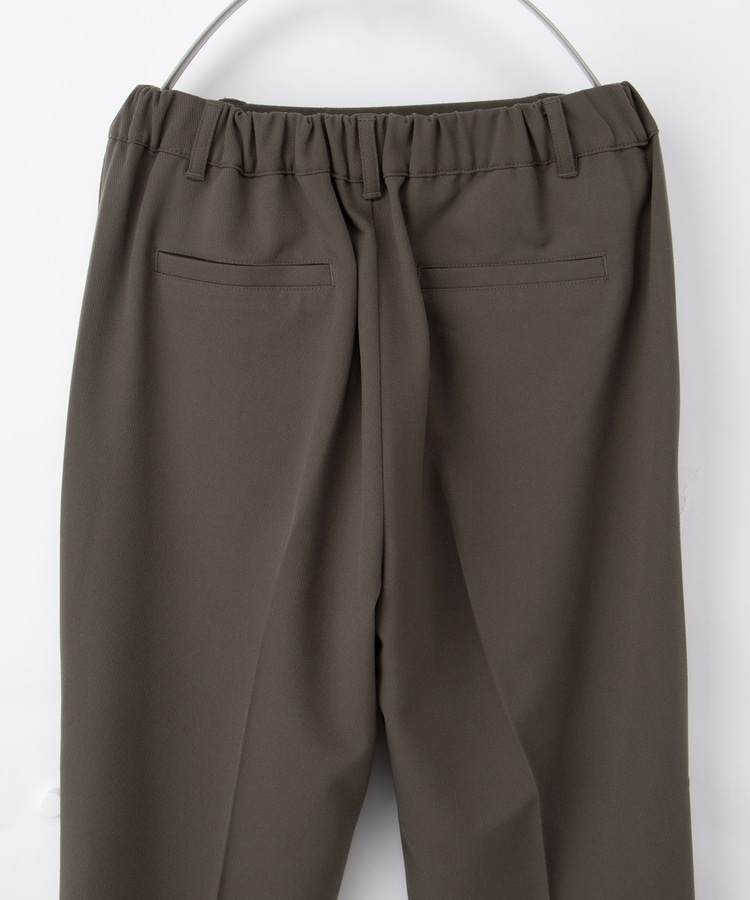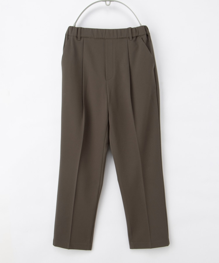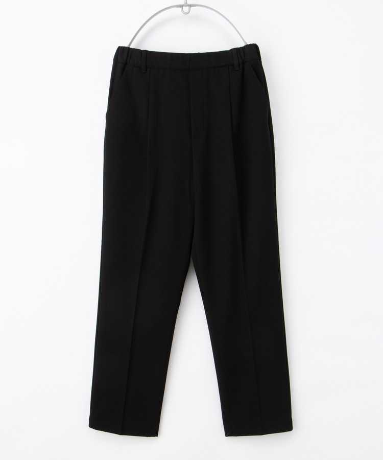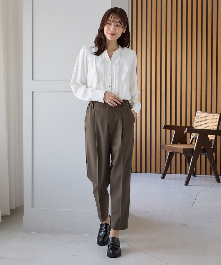 バックのフェイクポケットでヒップを高く見せ、きちんと感のあるセンタープレスと、腰回りのラインにこだわった、裾に向かって細くなる美しいシルエットで美脚効果も抜群。