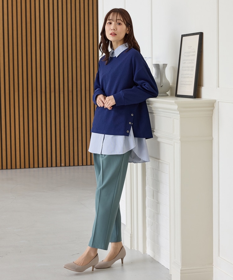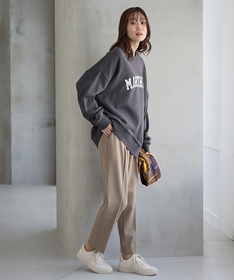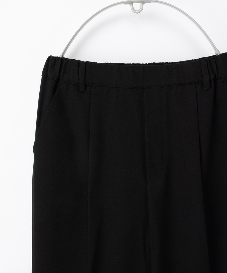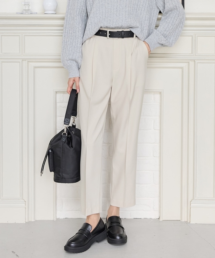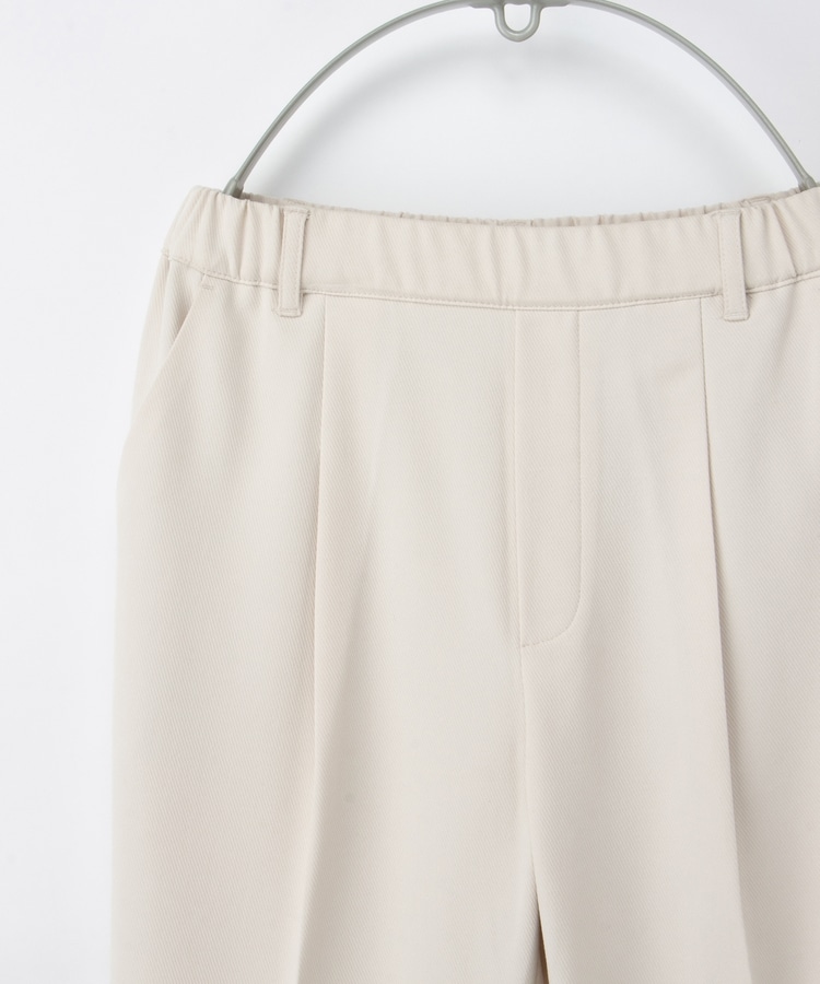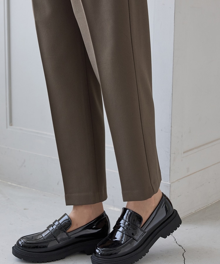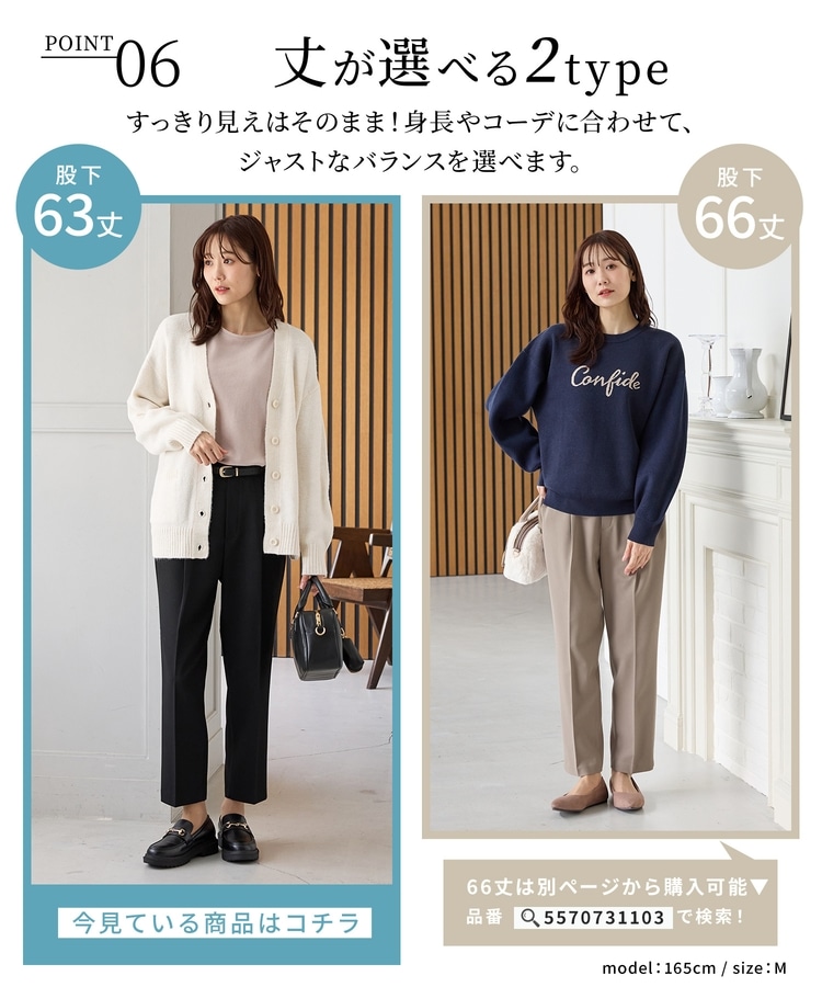 バックのフェイクポケットでヒップを高く見せ、きちんと感のあるセンタープレスと、腰回りのラインにこだわった、裾に向かって細くなる美しいシルエットで美脚効果も抜群。
