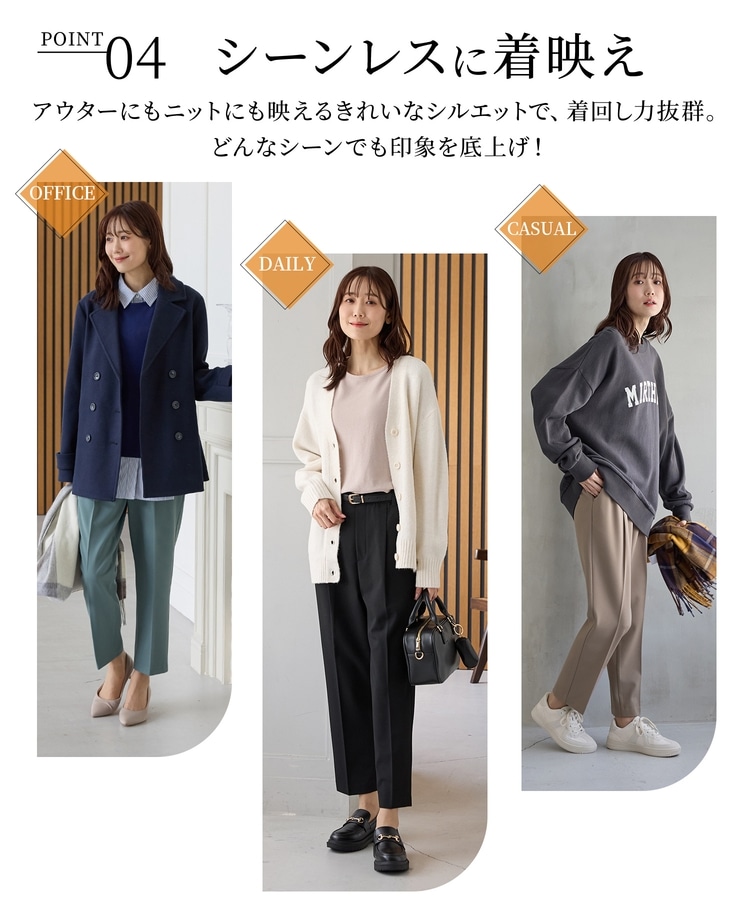 きれいめオフィススタイルにも、オフのカジュアルスタイルにも合わせやすく、幅広い着回しに毎日大活躍。