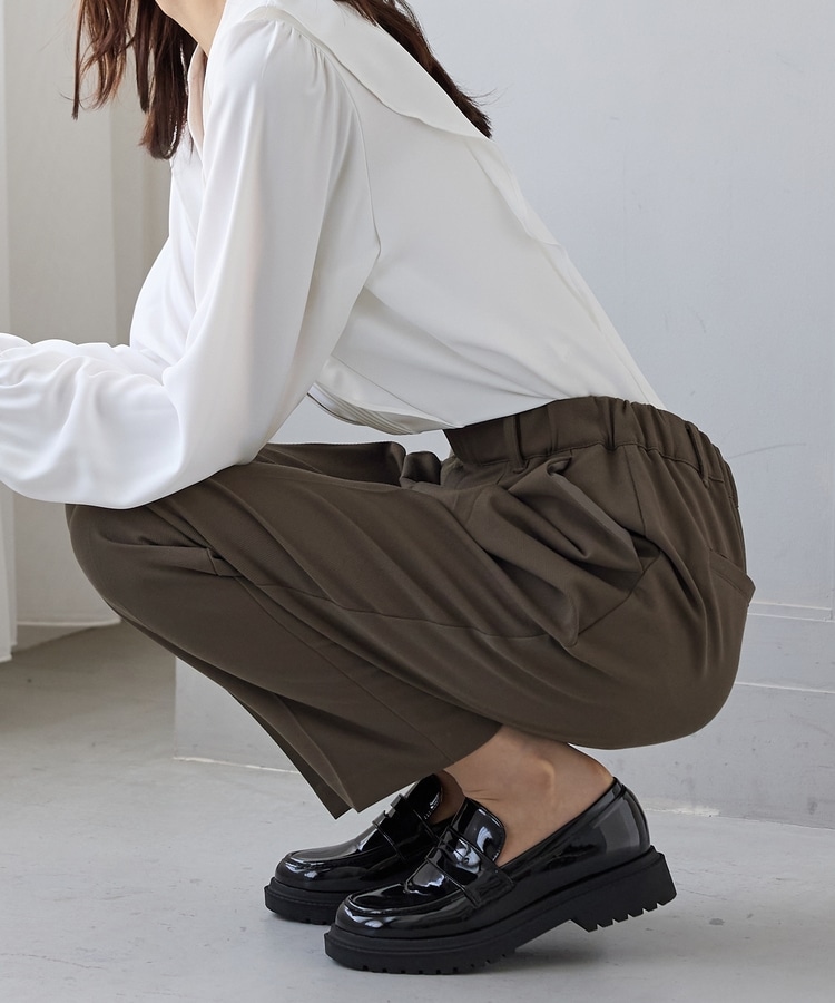 フロントのタックで作る、程よいゆる感が気になる腰回りをカバー。