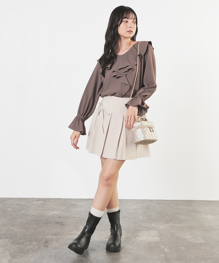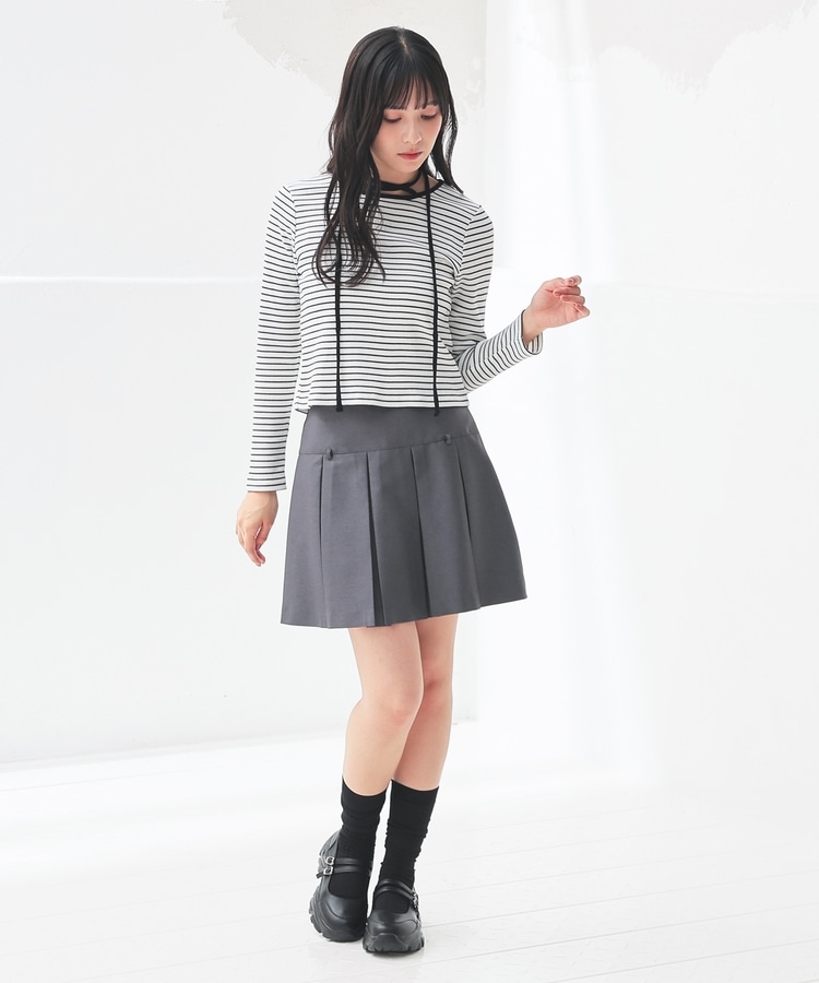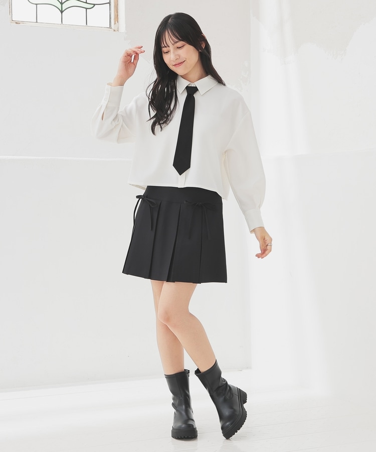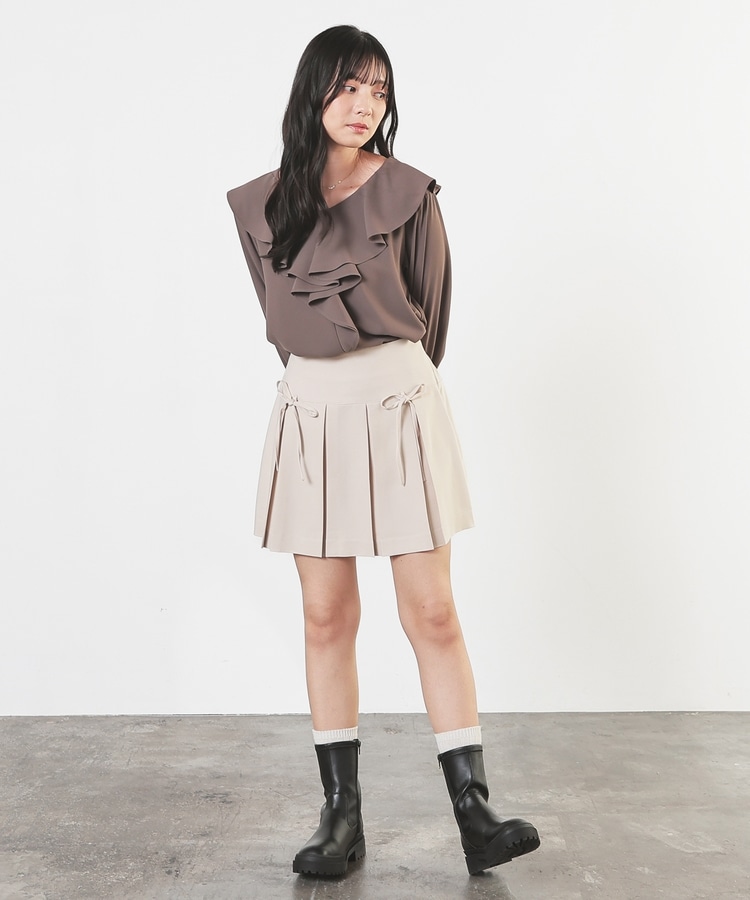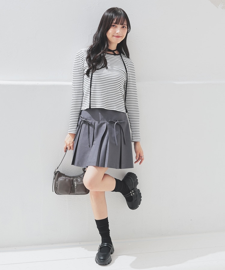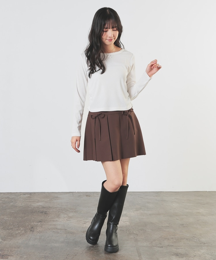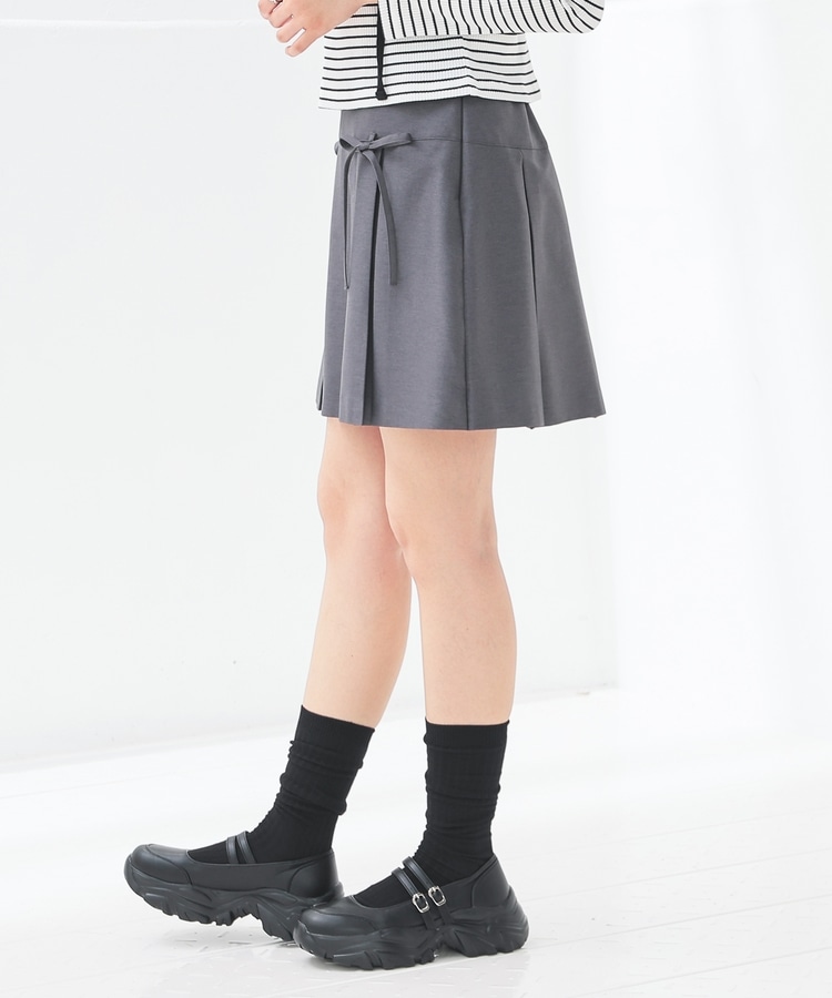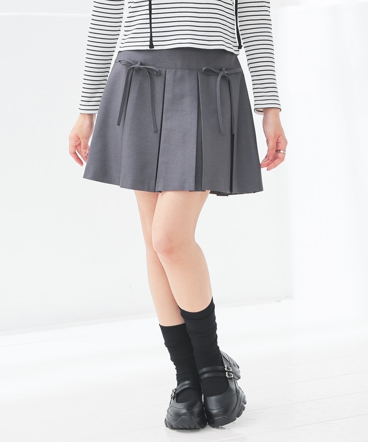 フロント両サイドにリボンを付けて、定番のミニプリーツをトレンドライクにアップデート。