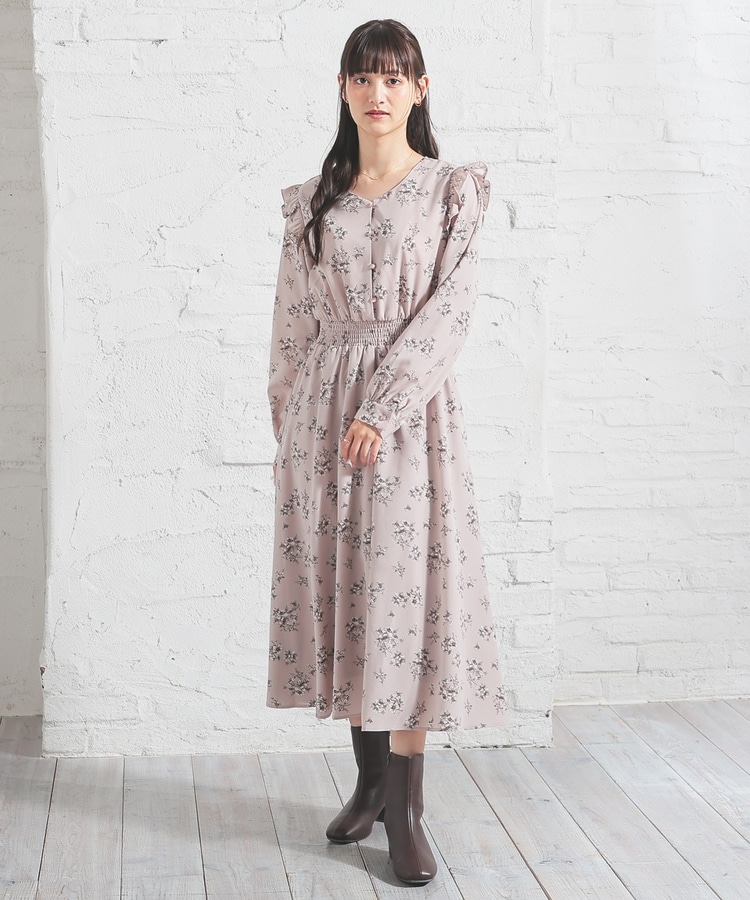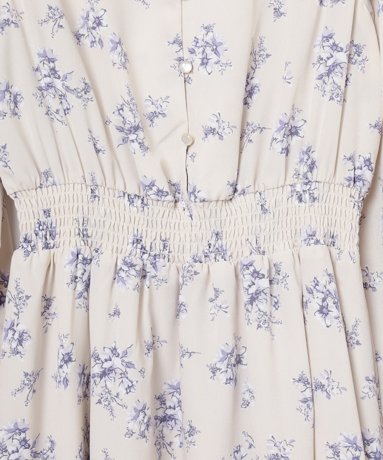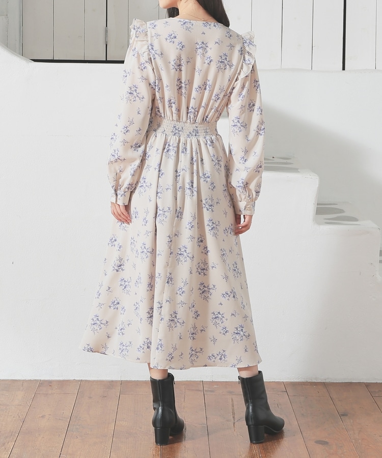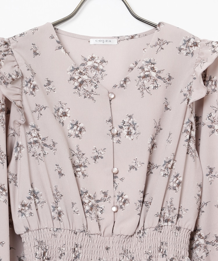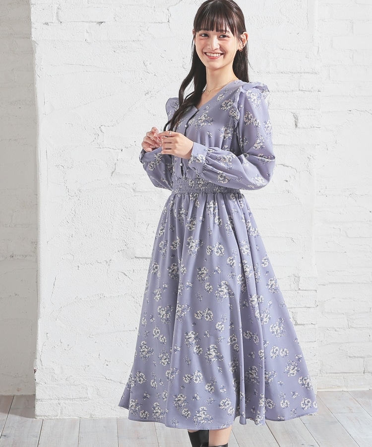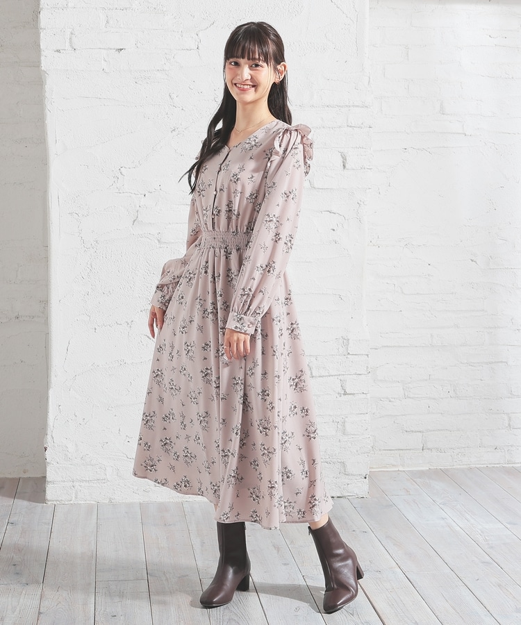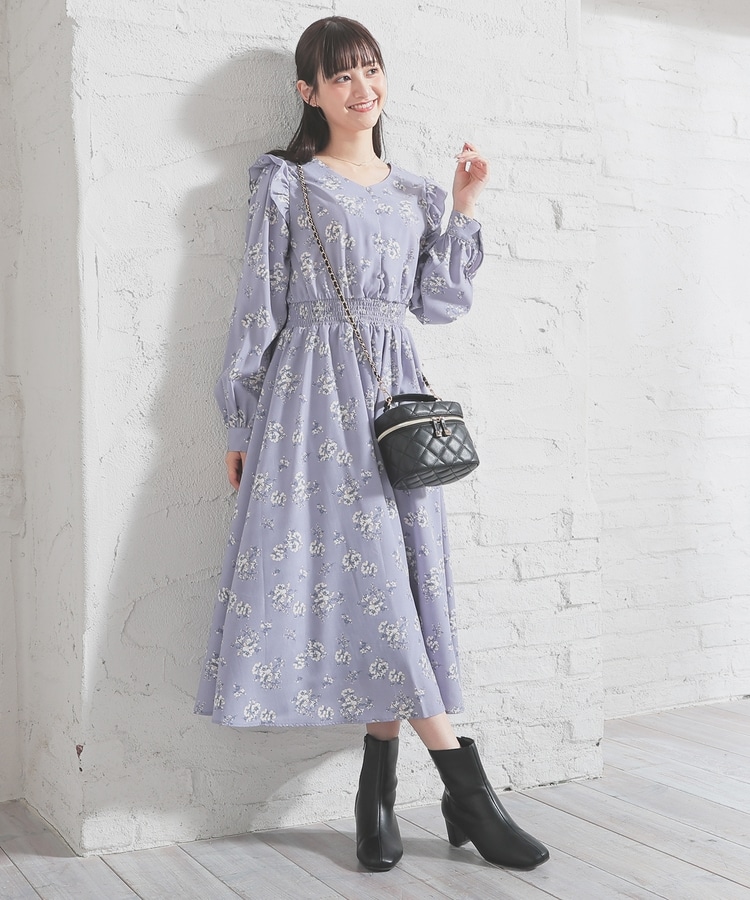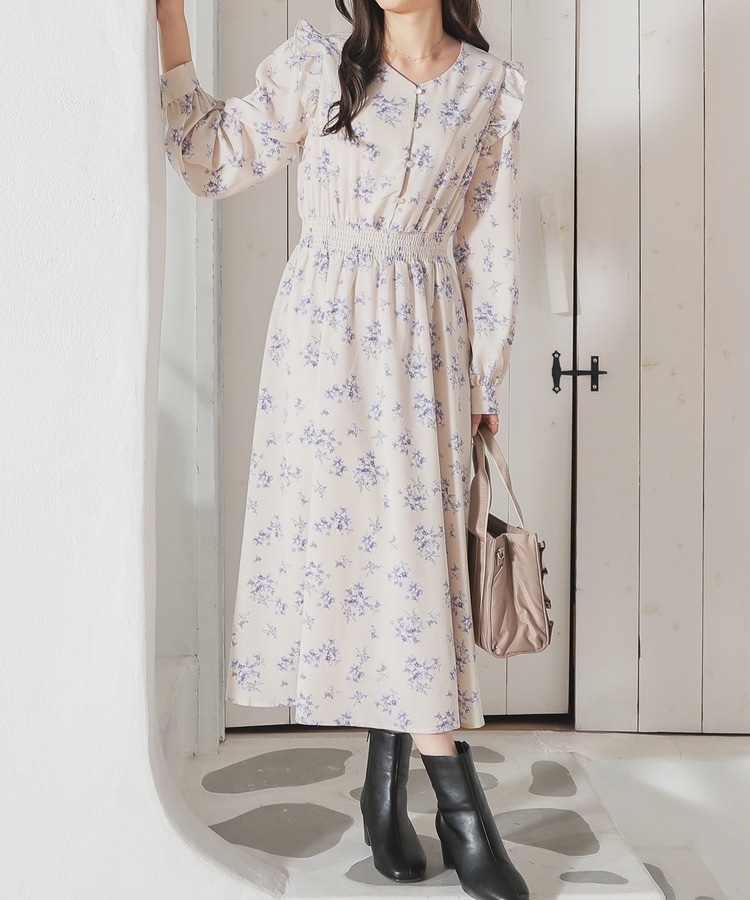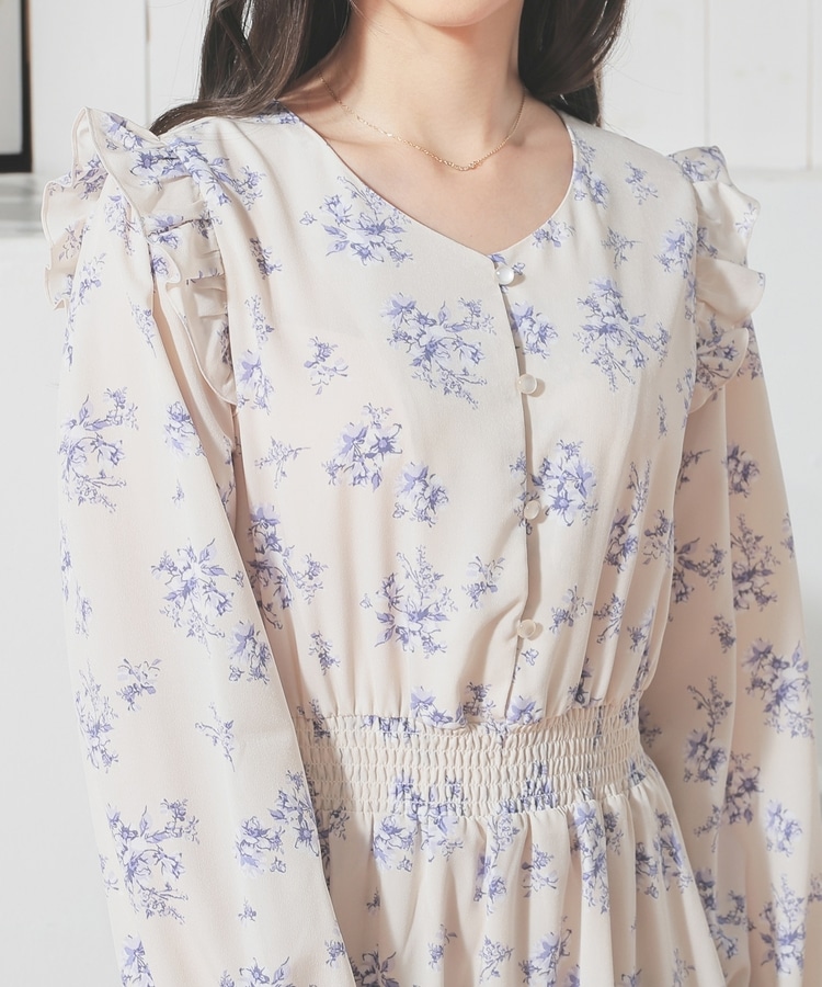 ウエストをシャーリングで絞ったメリハリシルエットに、肩フリルやふんわり袖、花柄とフェミニンムードたっぷりなデザイン。