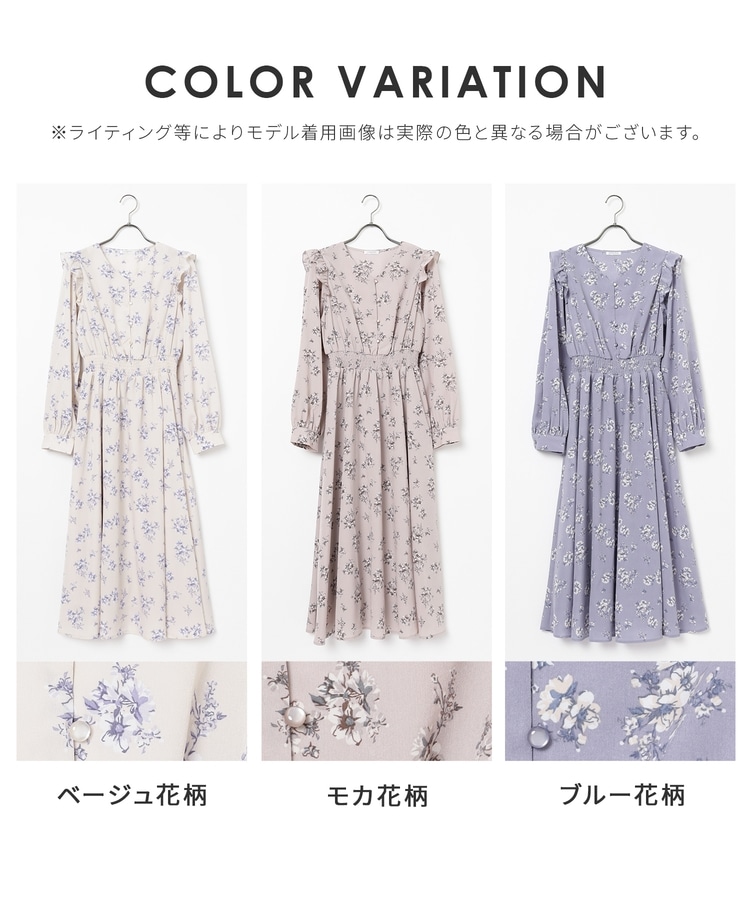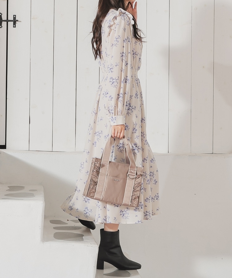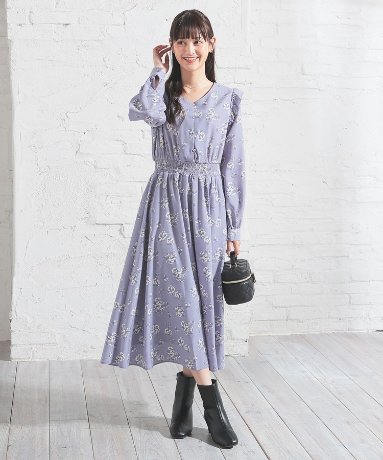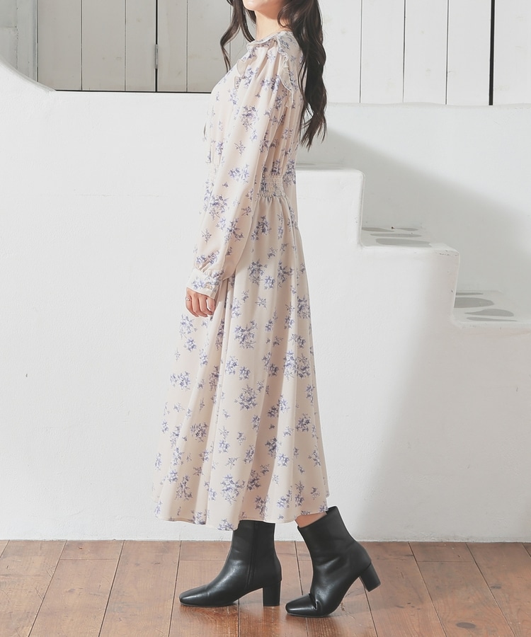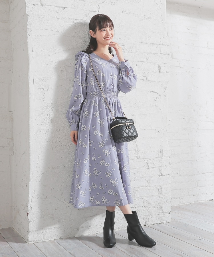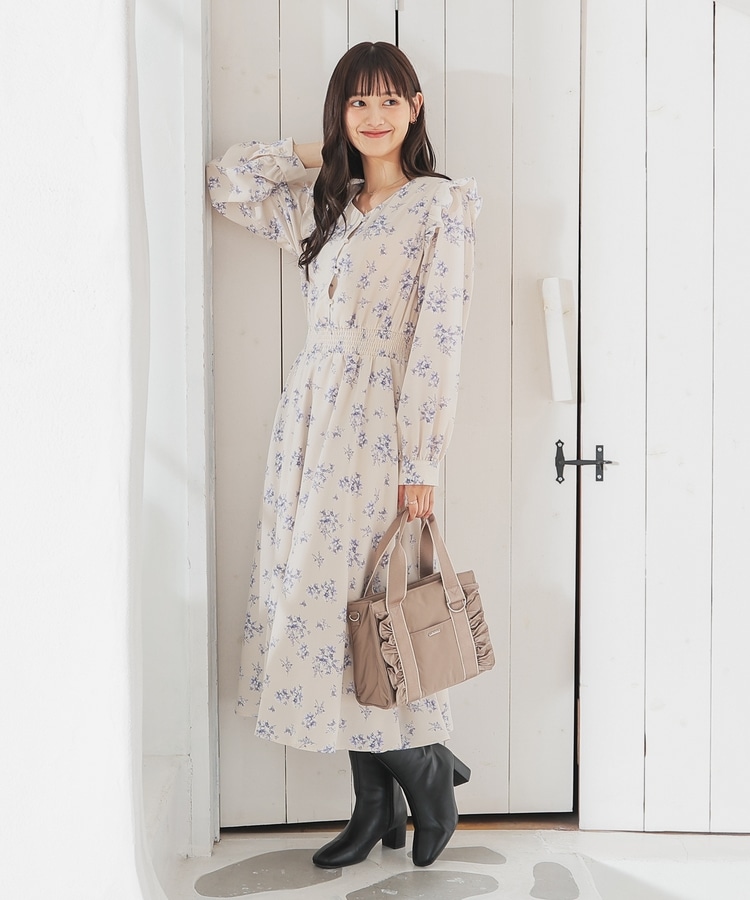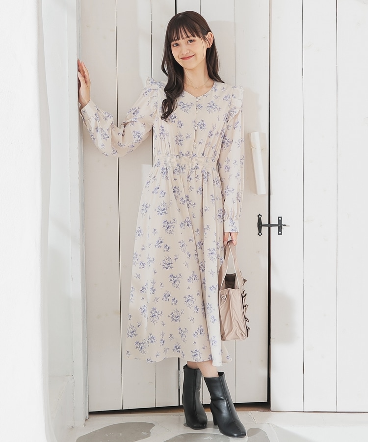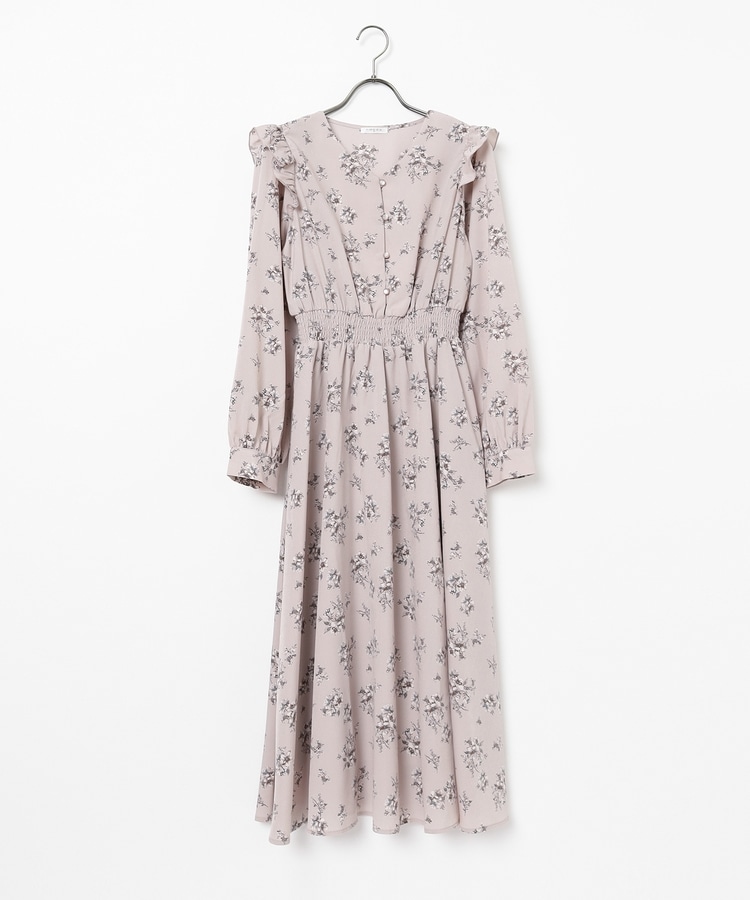 ウエストをシャーリングで絞ったメリハリシルエットに、肩フリルやふんわり袖、花柄とフェミニンムードたっぷりなデザイン。