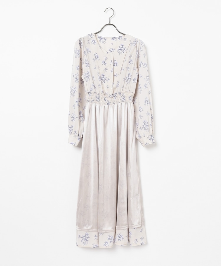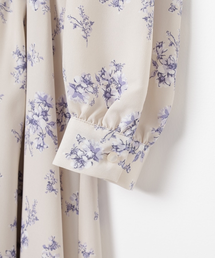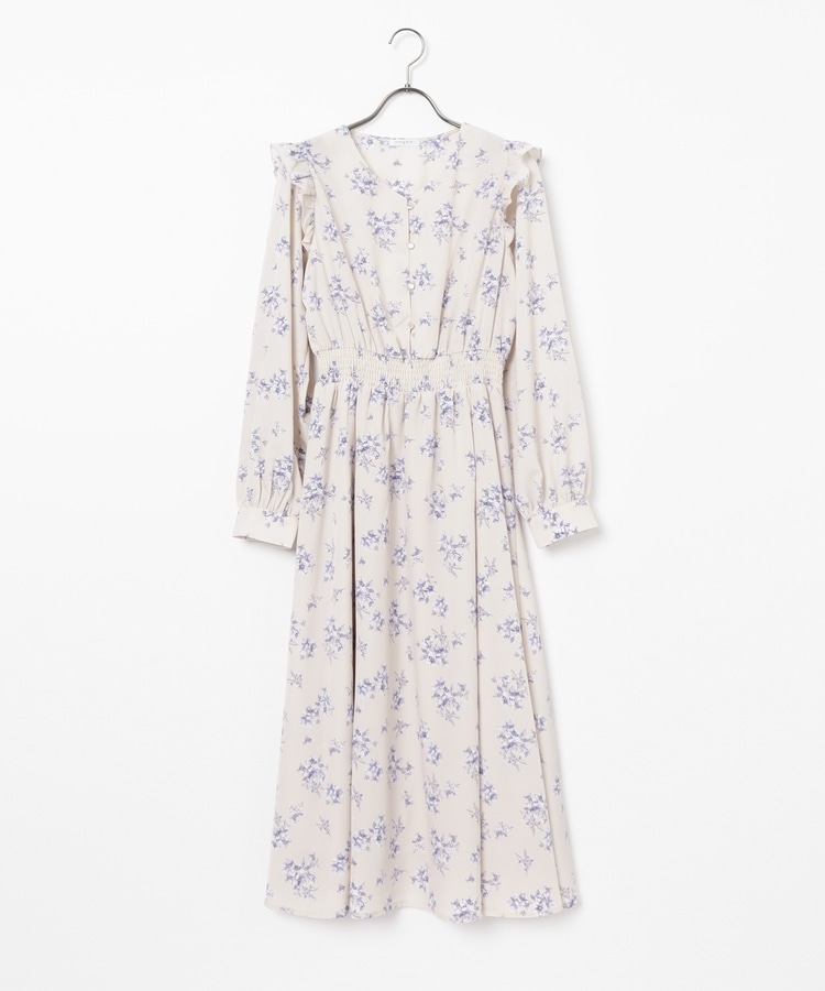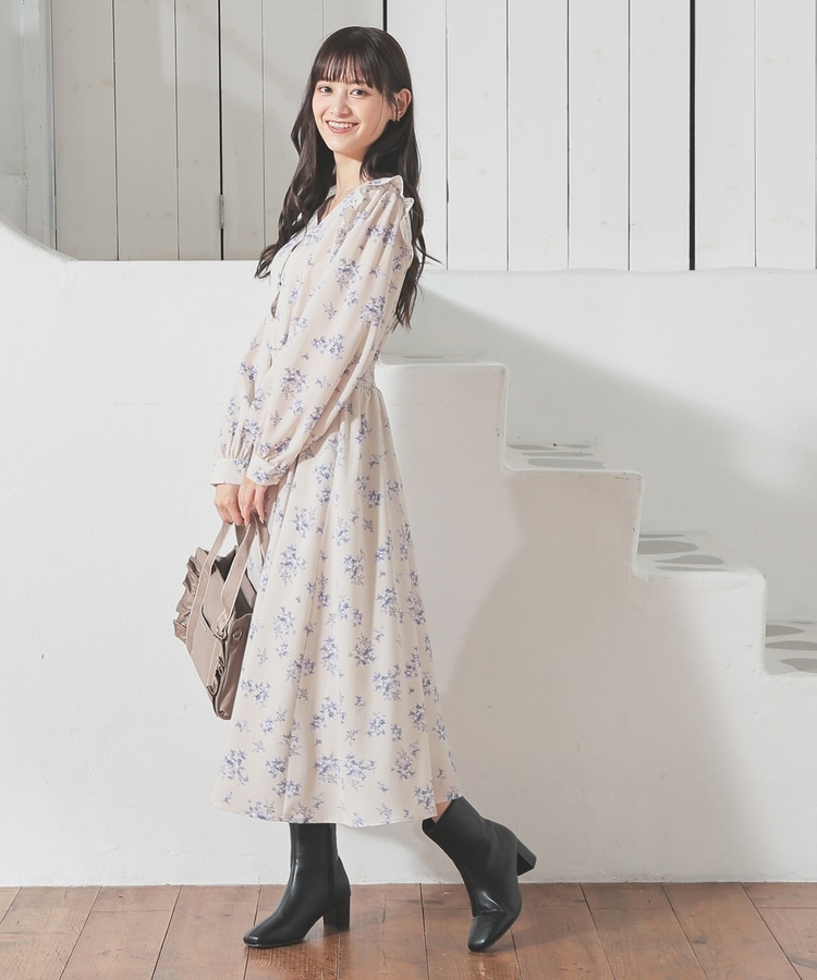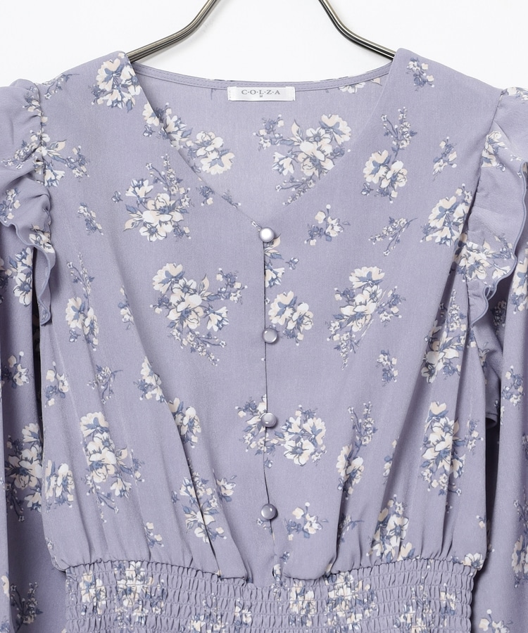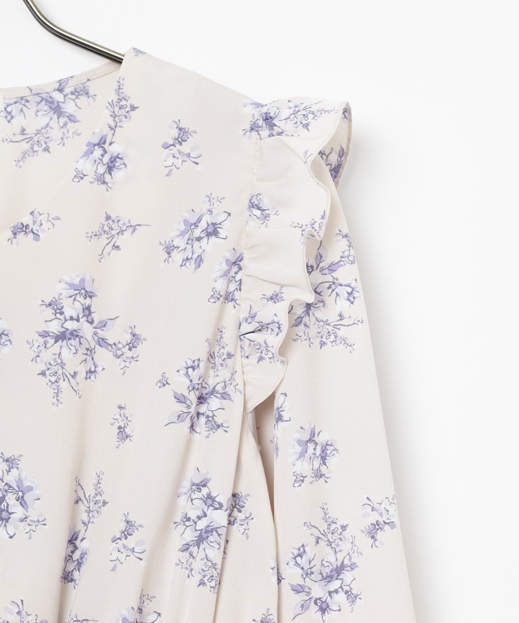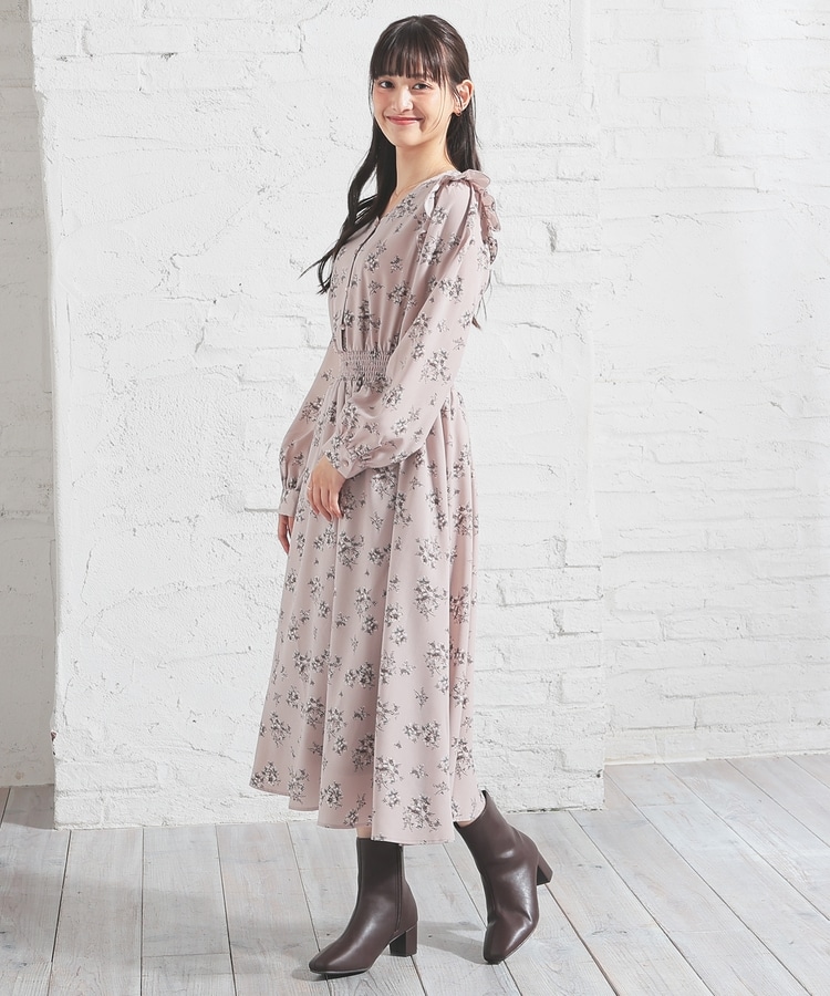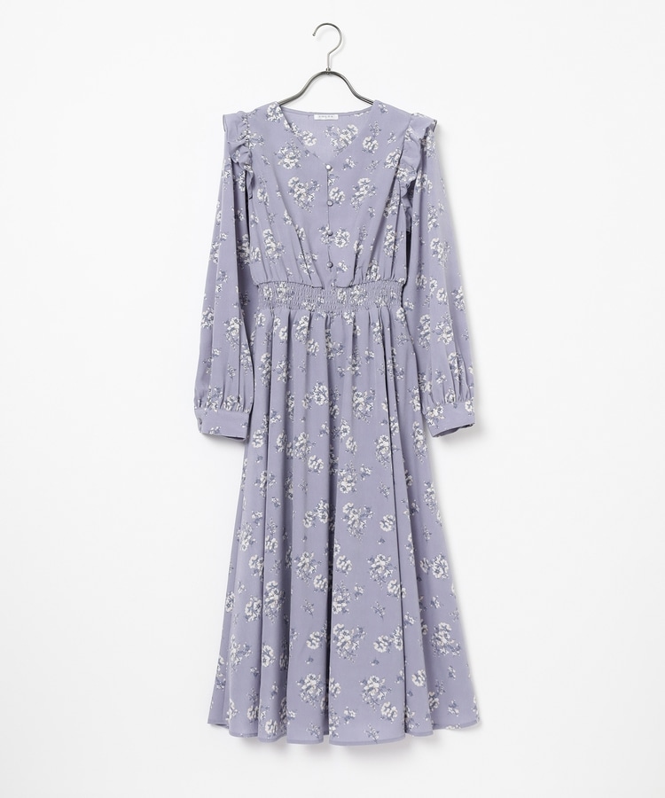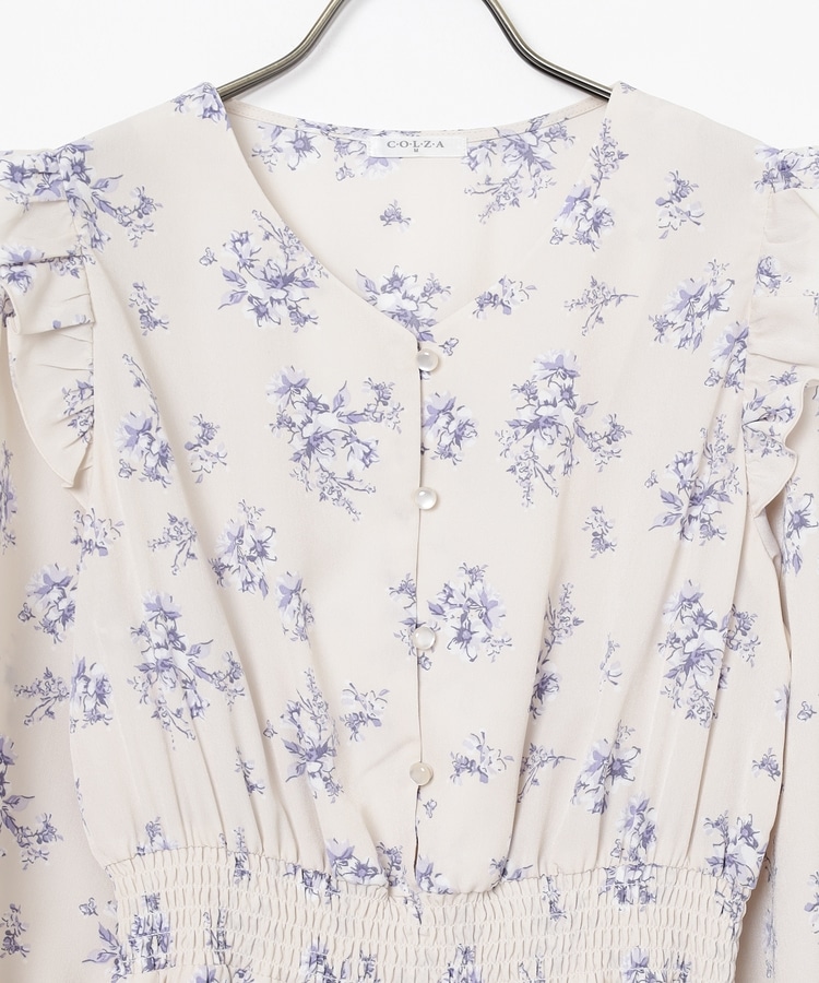ウエストをシャーリングで絞ったメリハリシルエットに、肩フリルやふんわり袖、花柄とフェミニンムードたっぷりなデザイン。