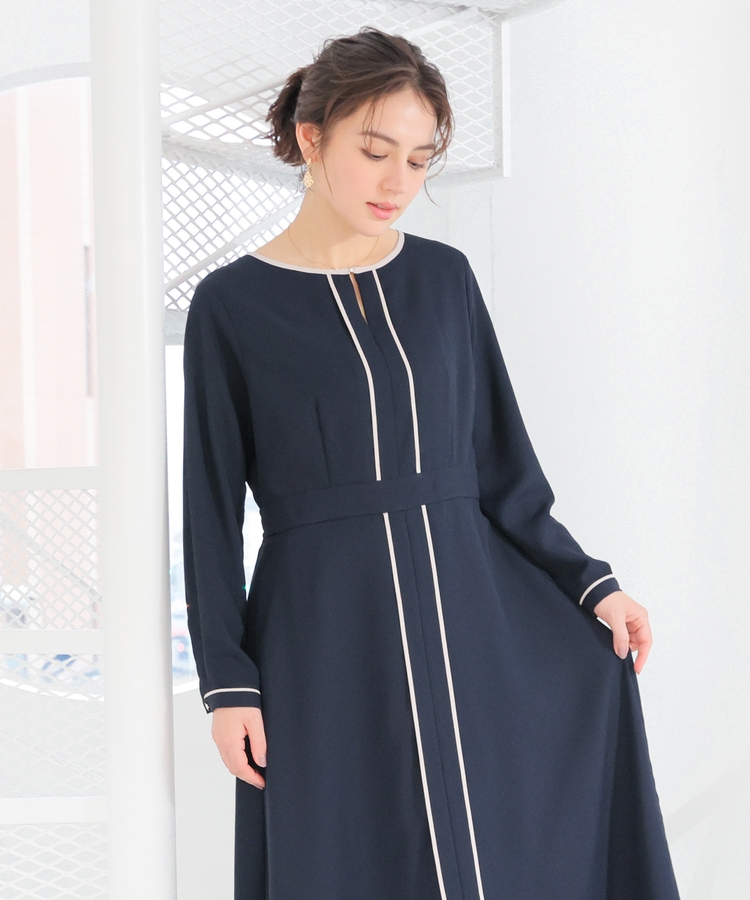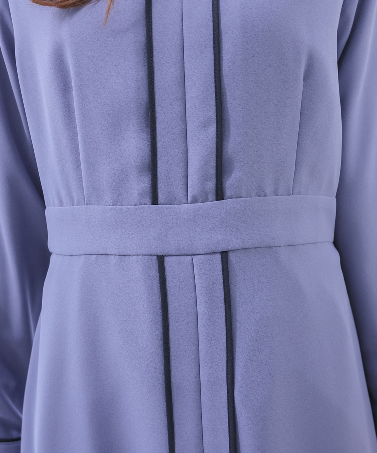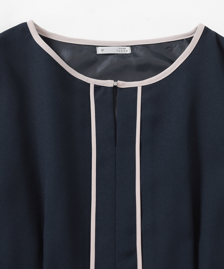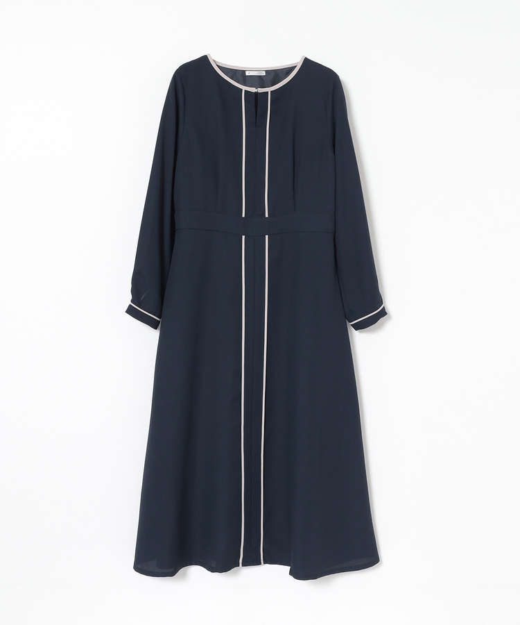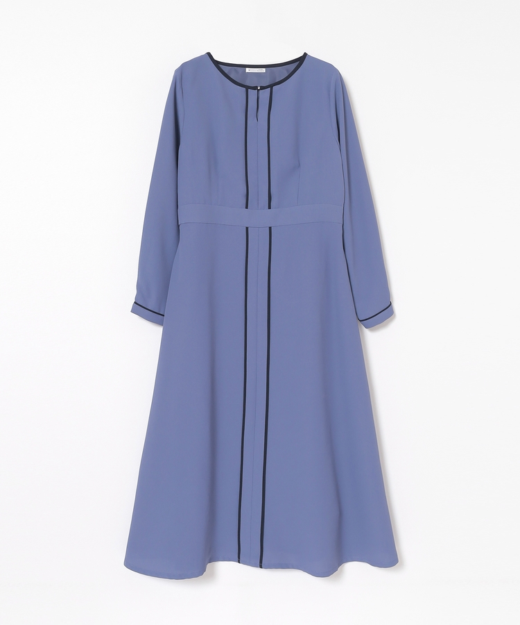 きれいなフレアシルエットとクルーネックのシンプルなデザインに配色パイピングをプラスして、すっきりとした印象に。