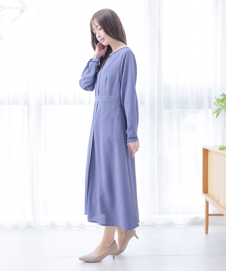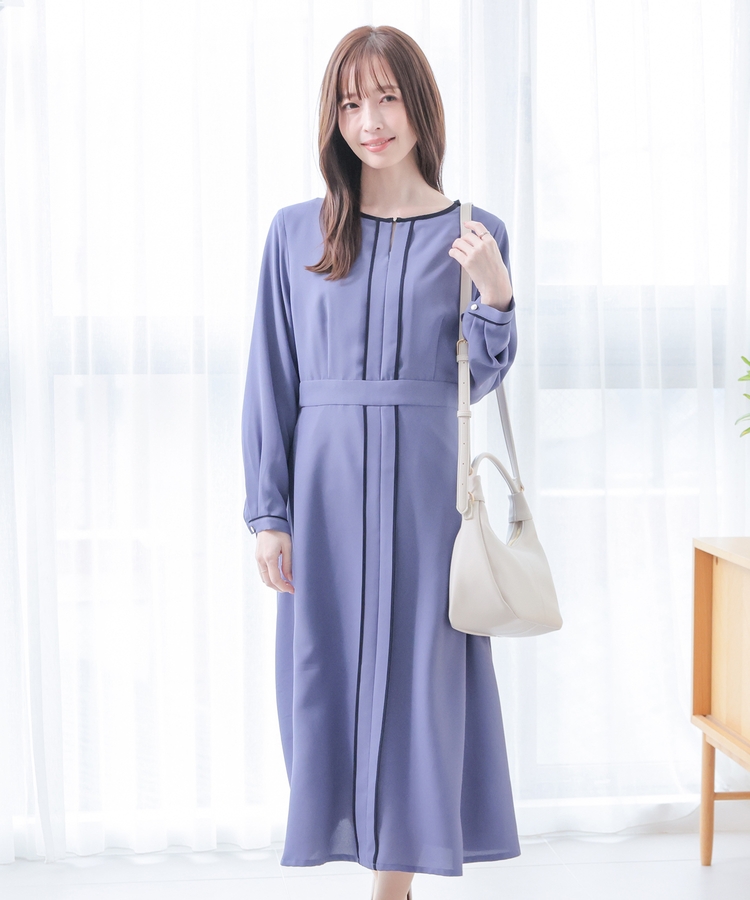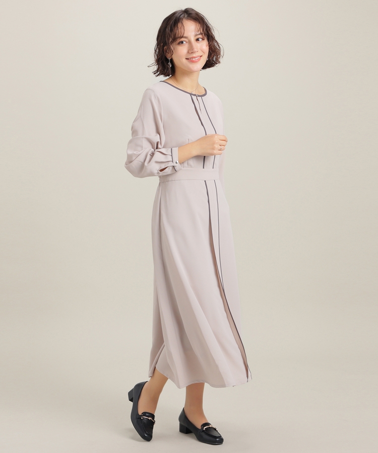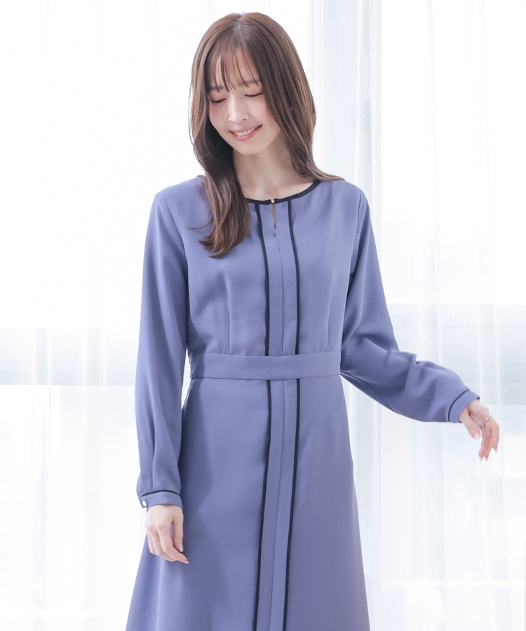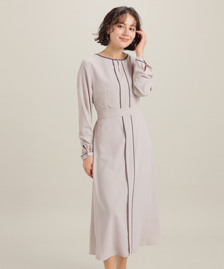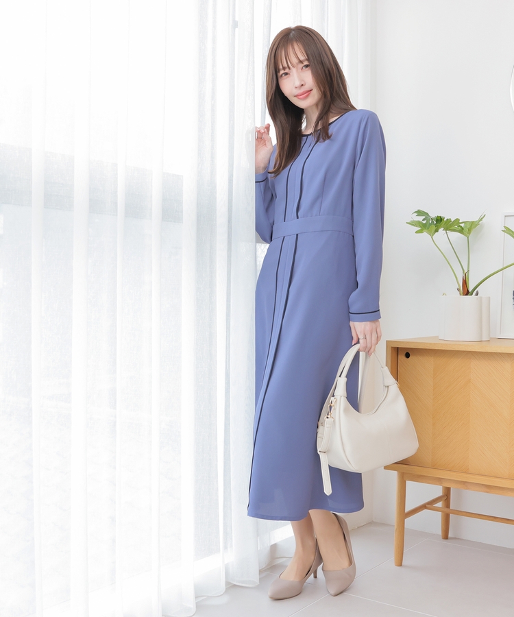 きれいなフレアシルエットとクルーネックのシンプルなデザインに配色パイピングをプラスして、すっきりとした印象に。