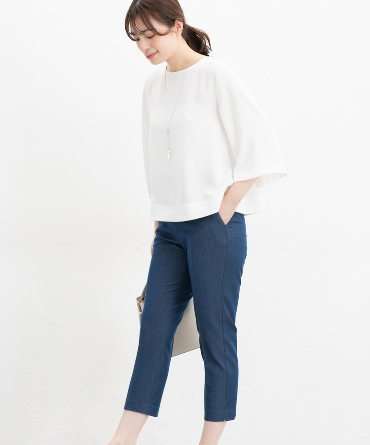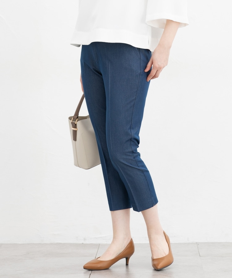 デニム風ながらきれいなシルエットで、ブラウスと合わせたきれいめスタイルからTシャツと合わせたカジュアルスタイルまで、幅広い着回しに活躍。