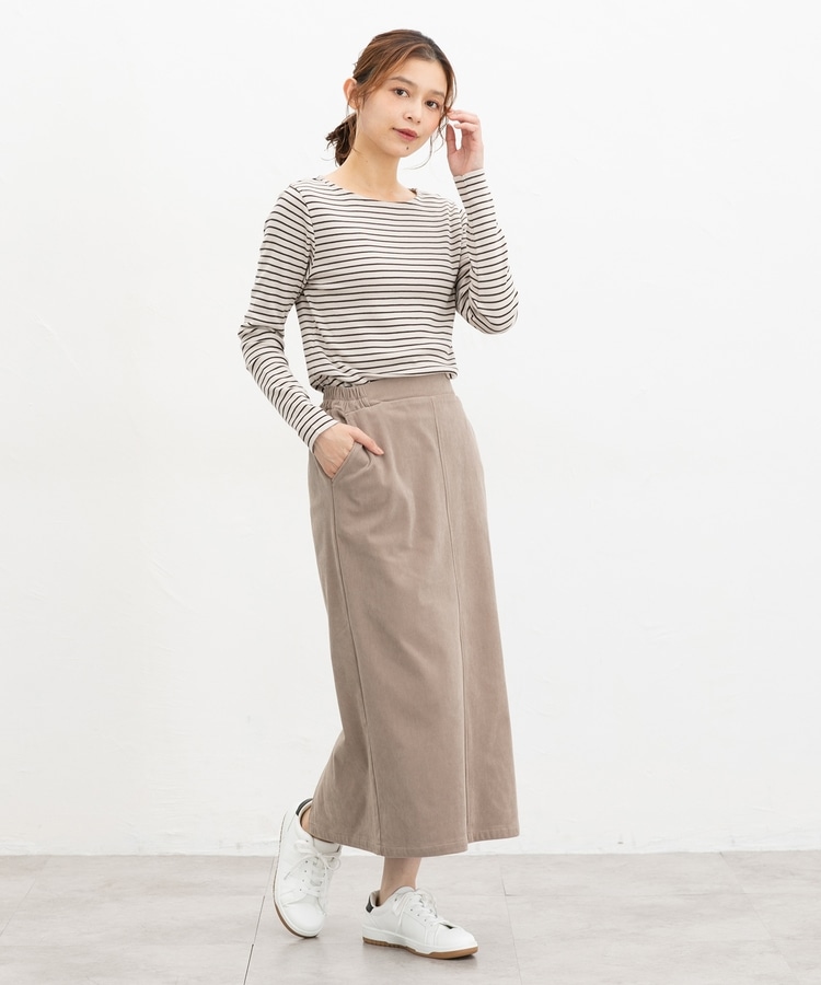 ボーダートップスやニットなどと合わせたカジュアルスタイルがおすすめ。