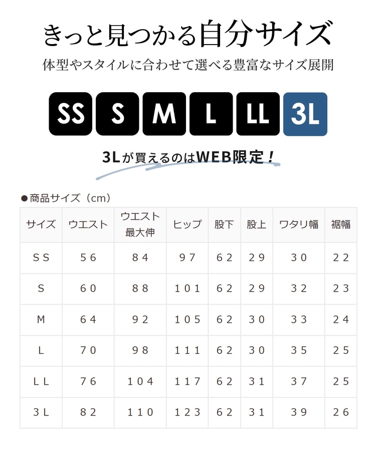 自分にぴったりが見つかる、SS〜3Lまで揃った豊富なサイズ展開。