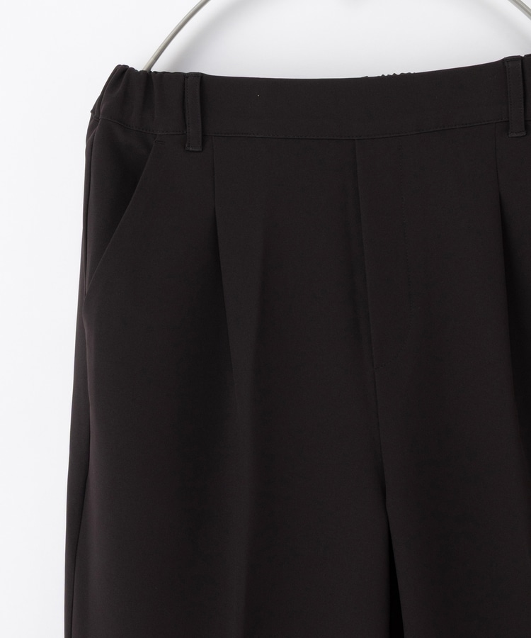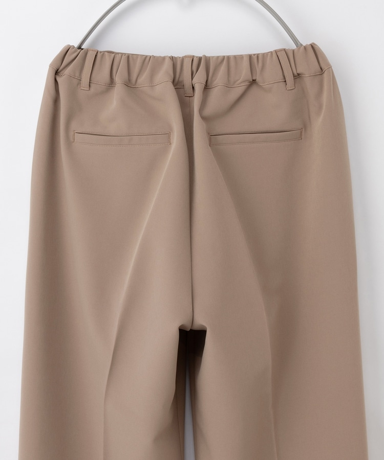 環境に優しい再生ポリエステルを使用した、『ストレッチ』の利いた落ち感素材とウエストゴムでストレスフリーなはき心地。