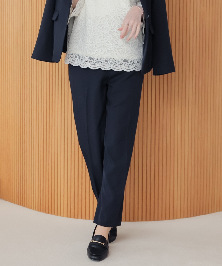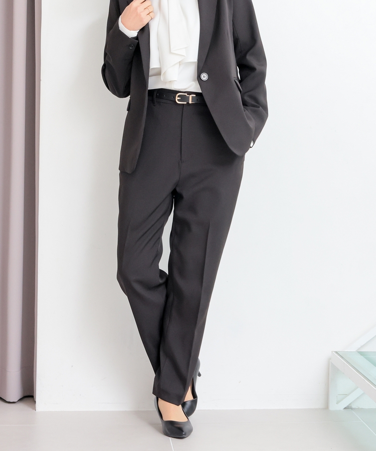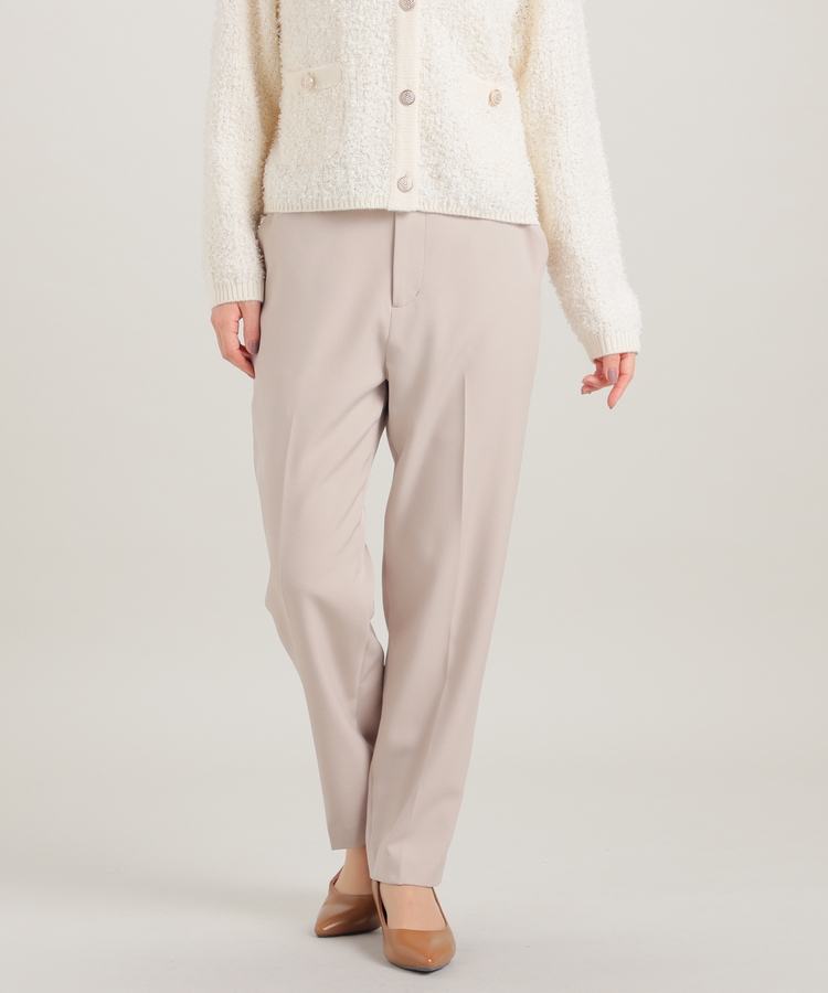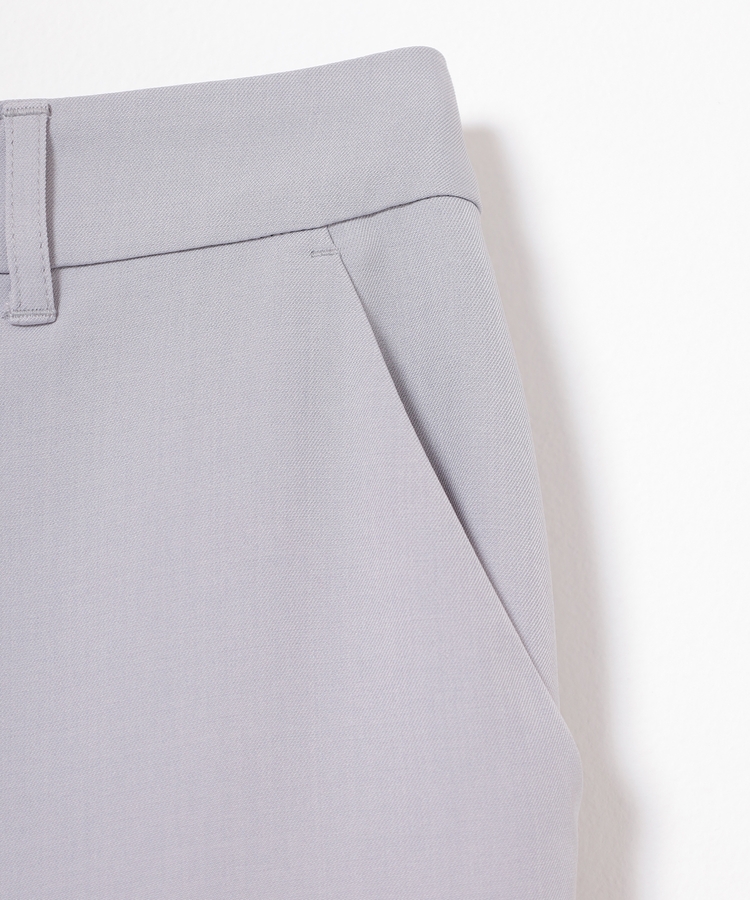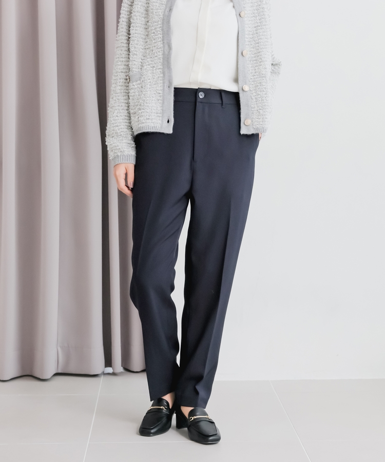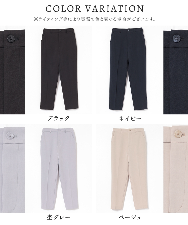 縦ラインを強調するセンタープレスと、腰回りのラインにこだわった、裾に向かって細くなるすっきりとしたシルエットで美脚効果抜群のデザイン。