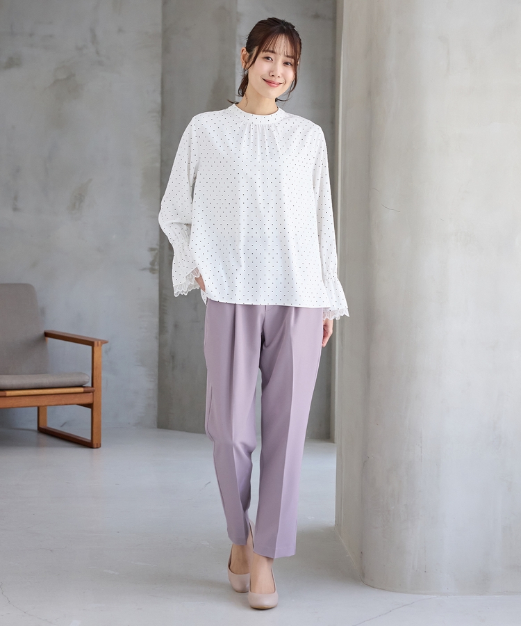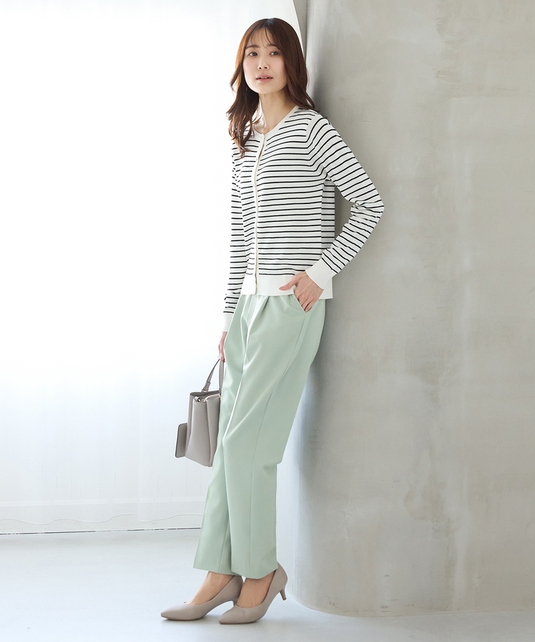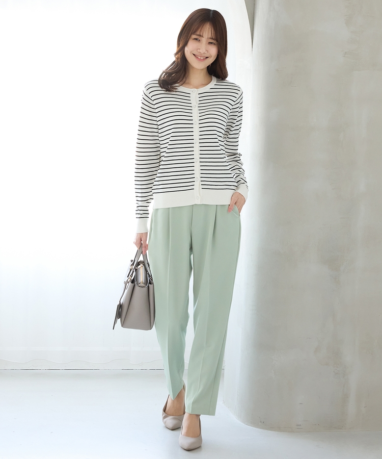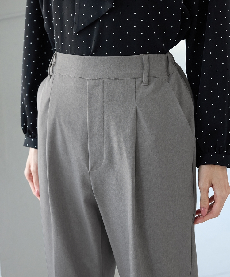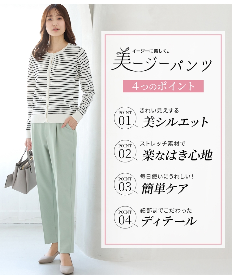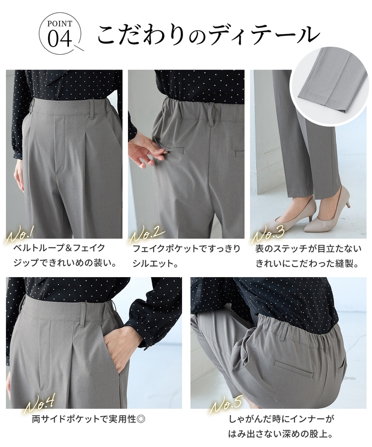 きちんと感のあるセンタープレスと、腰回りのラインにこだわった、裾に向かって細くなる美しいシルエットで美脚効果も抜群。