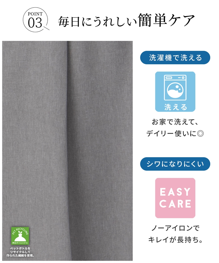 洗濯機で洗える『マシンウォッシャブル』と、シワになりにくい『イージーケア』の機能付き。