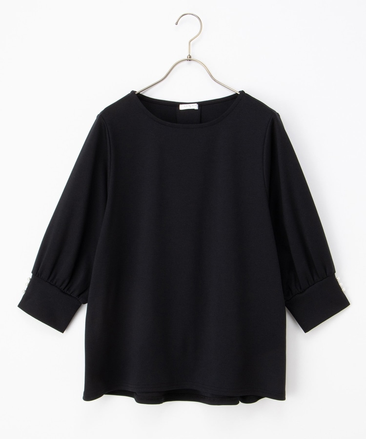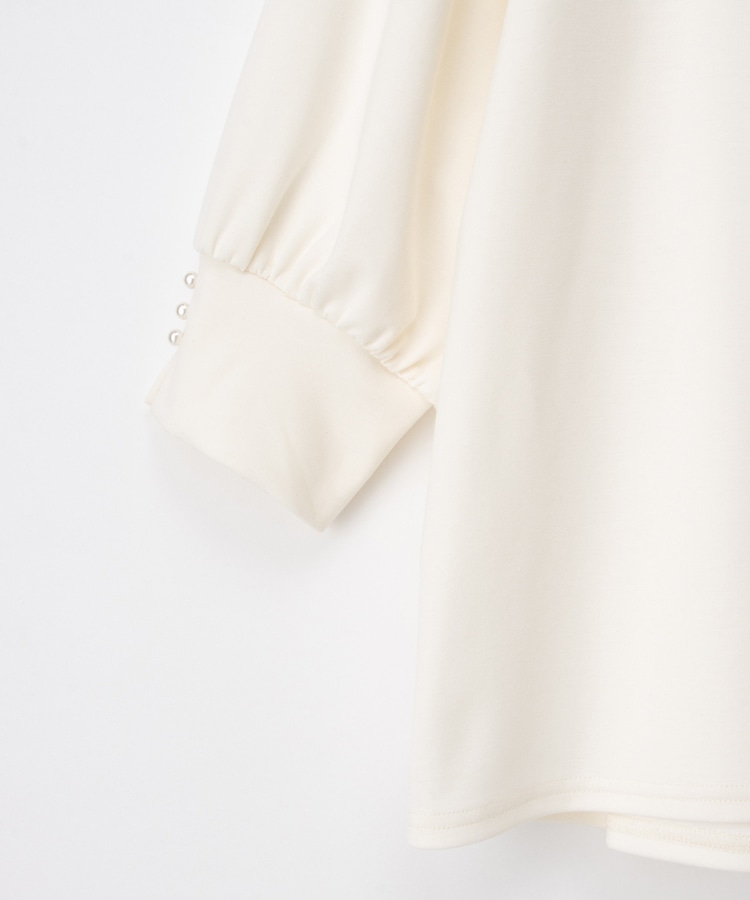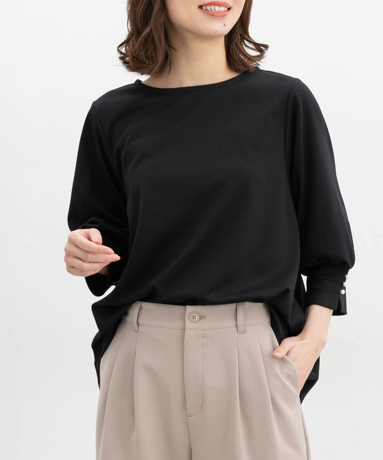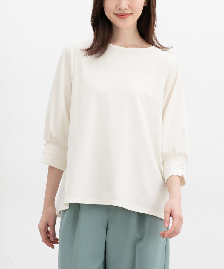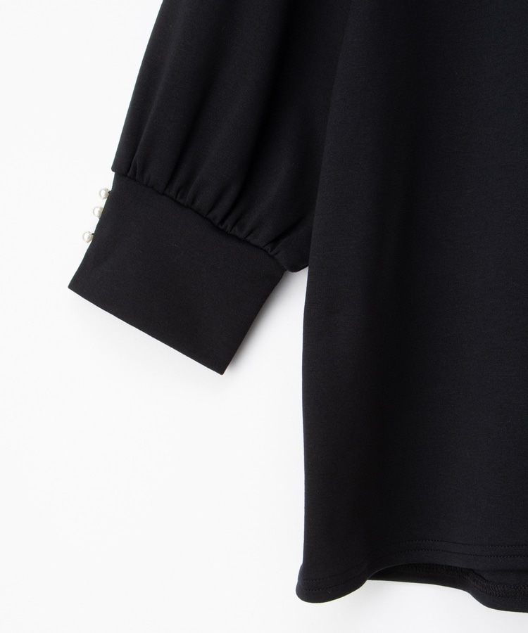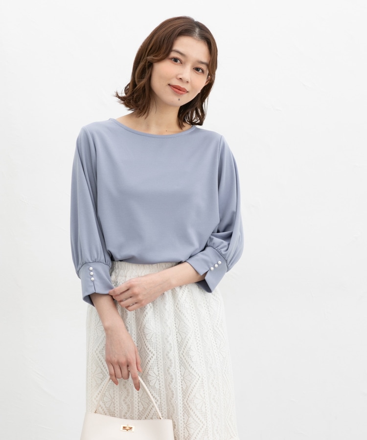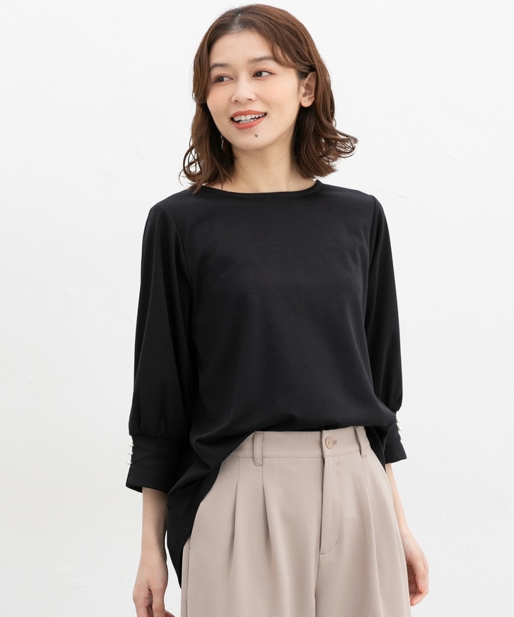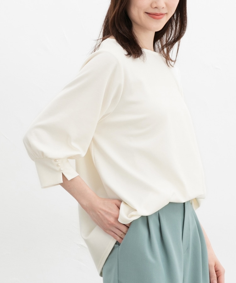 手首をすっきり細く見せるスリット入りの袖口には、パールも付いてさりげなく華やかに。