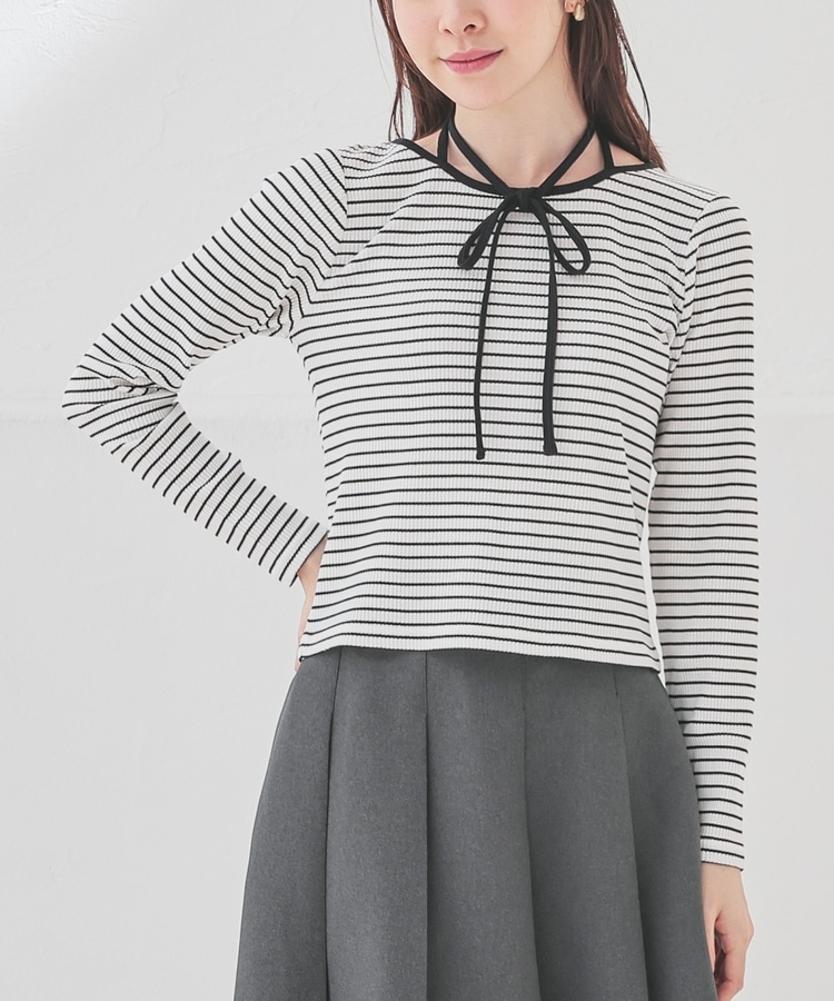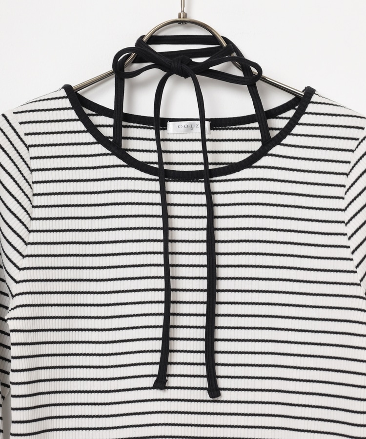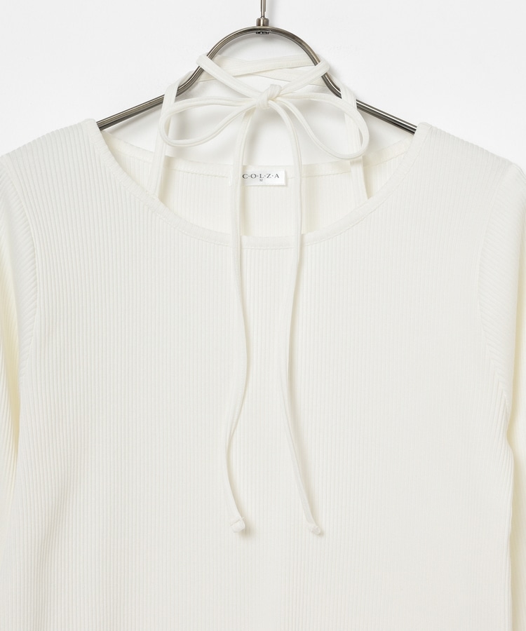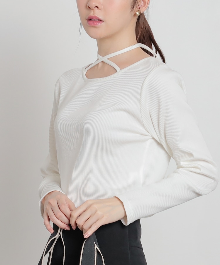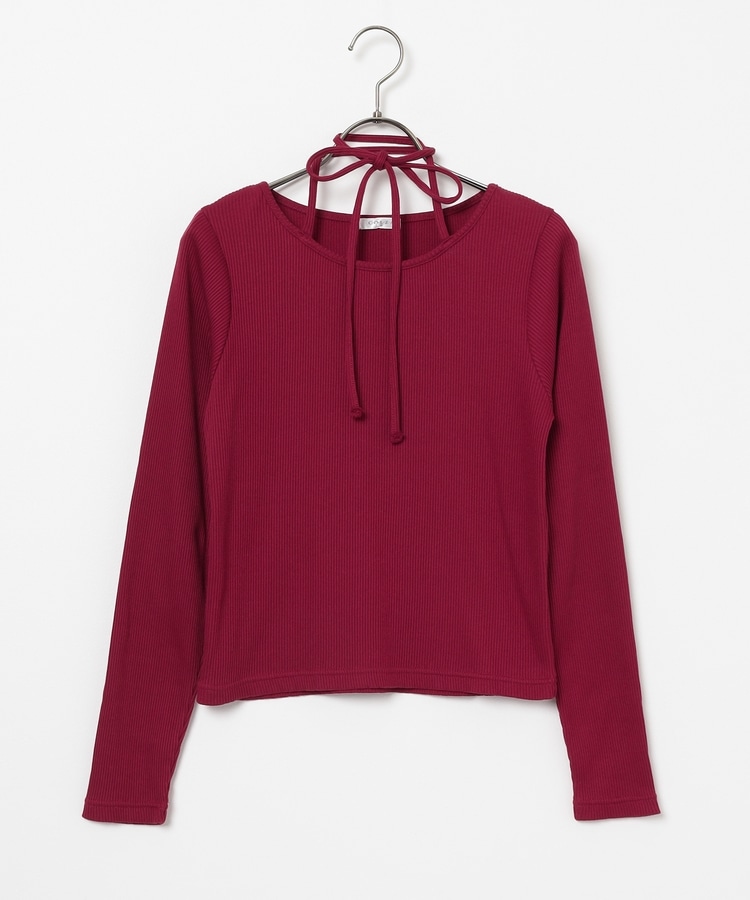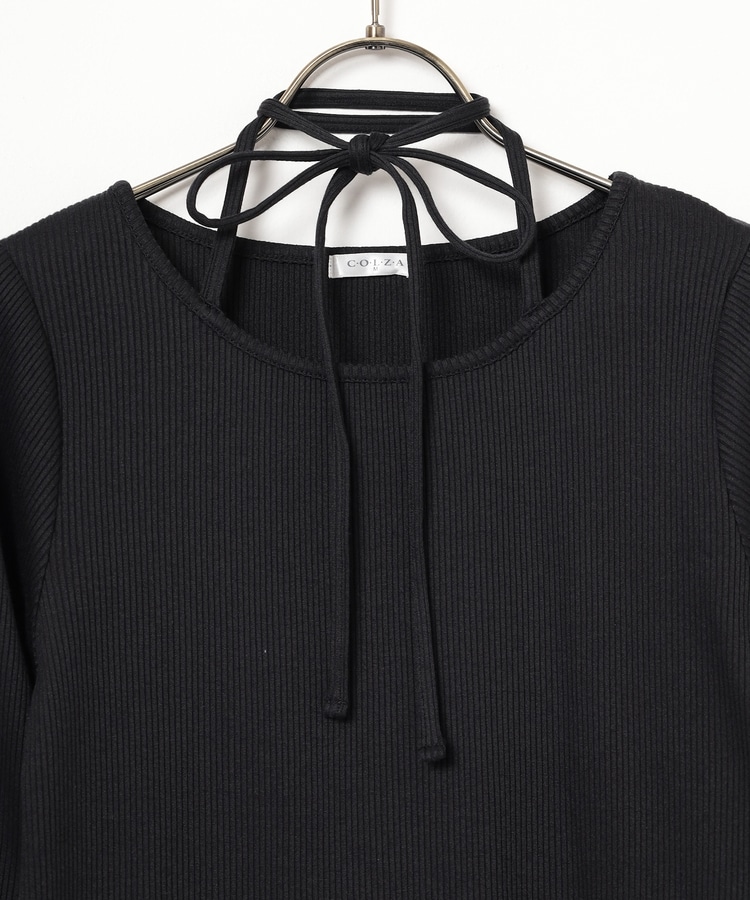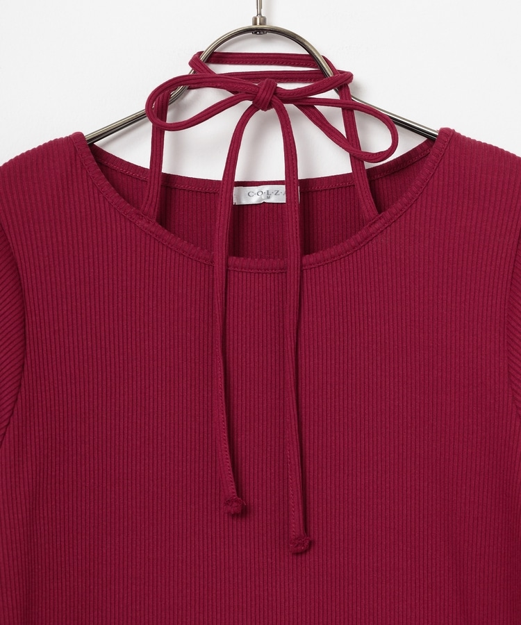 ホルターネックとして後ろで結んでも、チョーカー風に前で結んでも使えるリボン付きのシンプルデザイン。