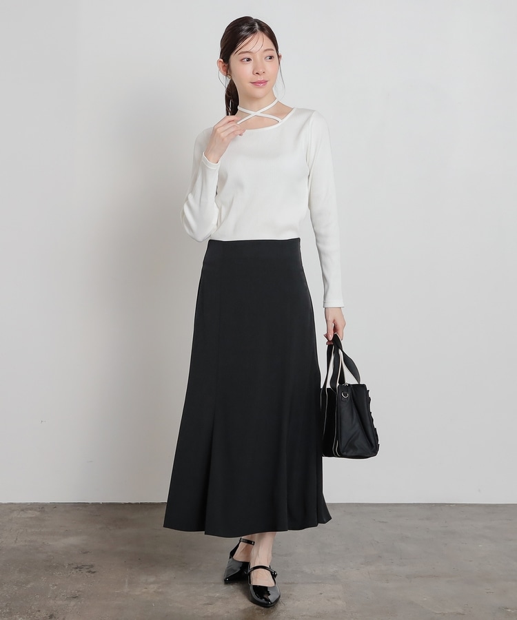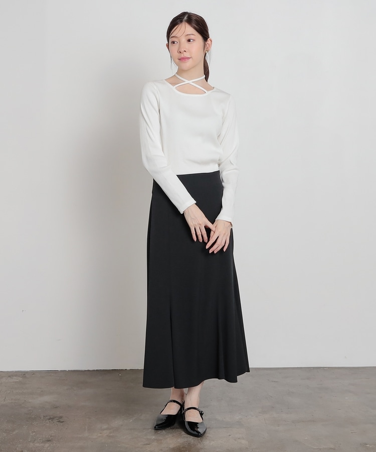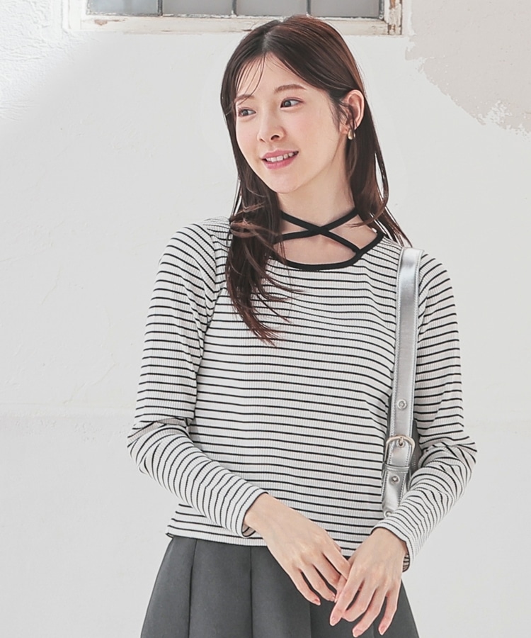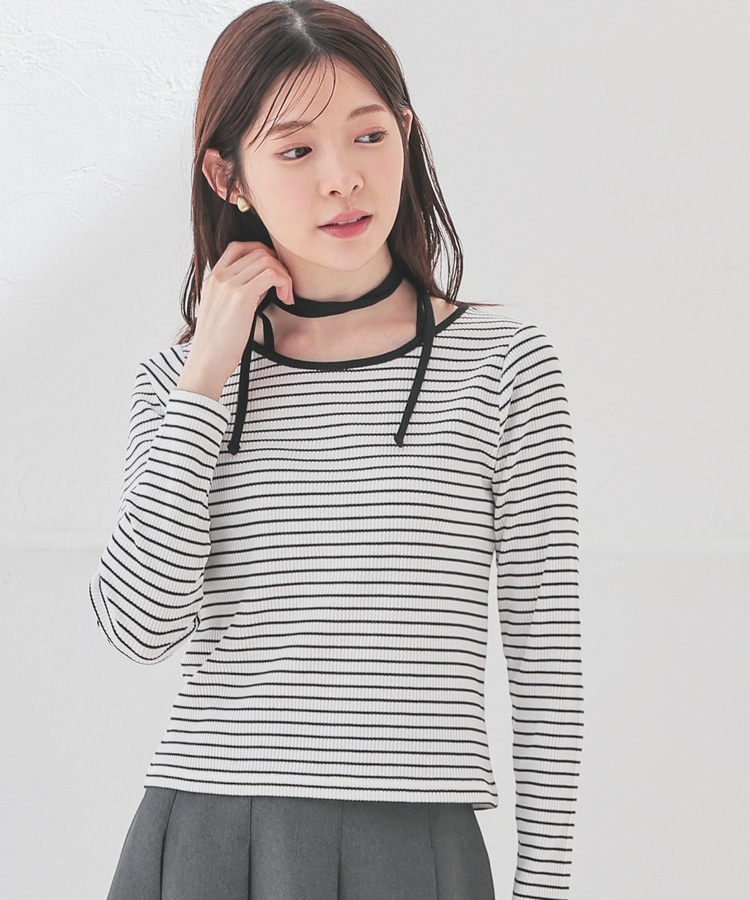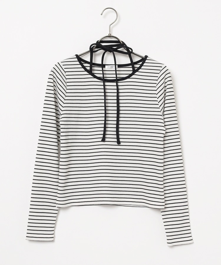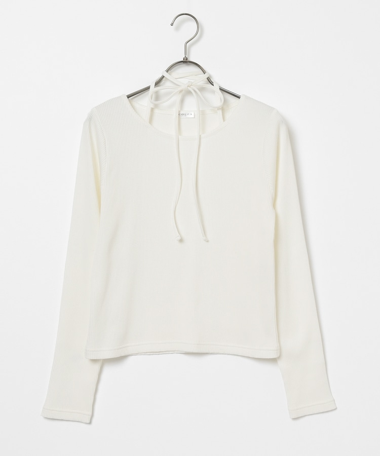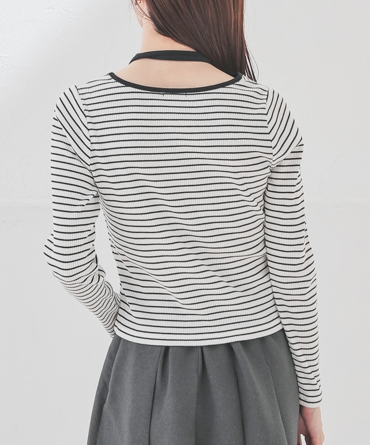 ホルターネックとして後ろで結んでも、チョーカー風に前で結んでも使えるリボン付きのシンプルデザイン。