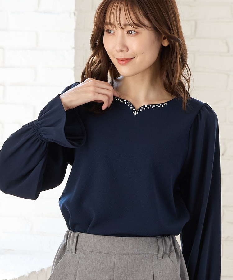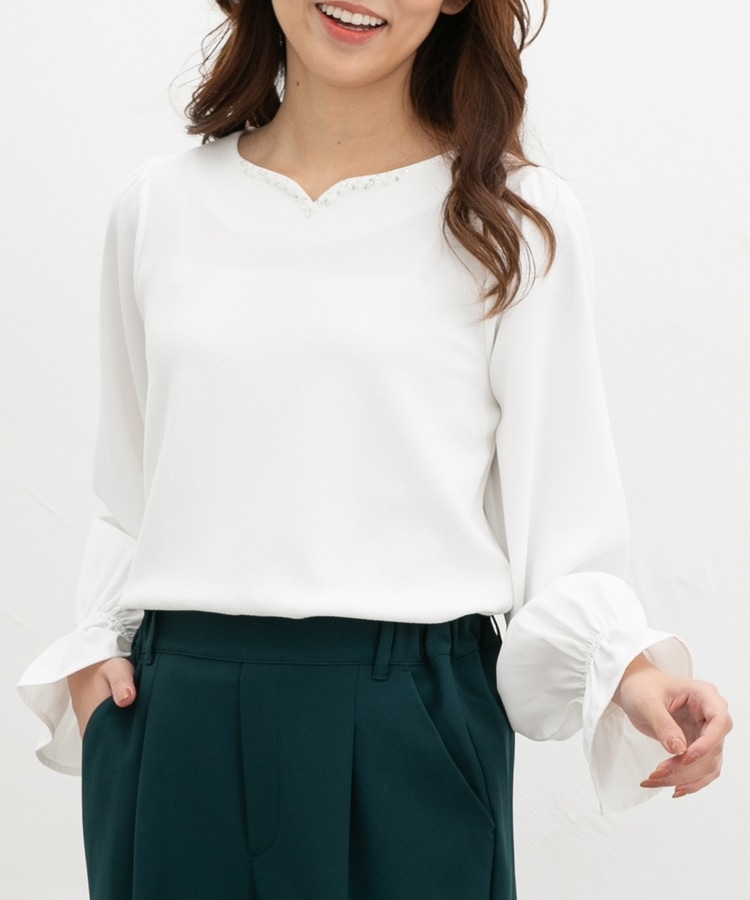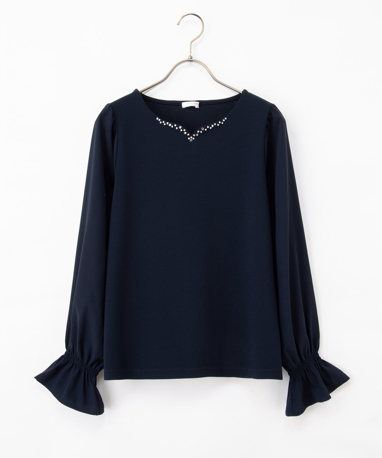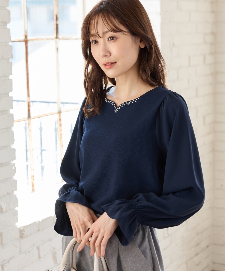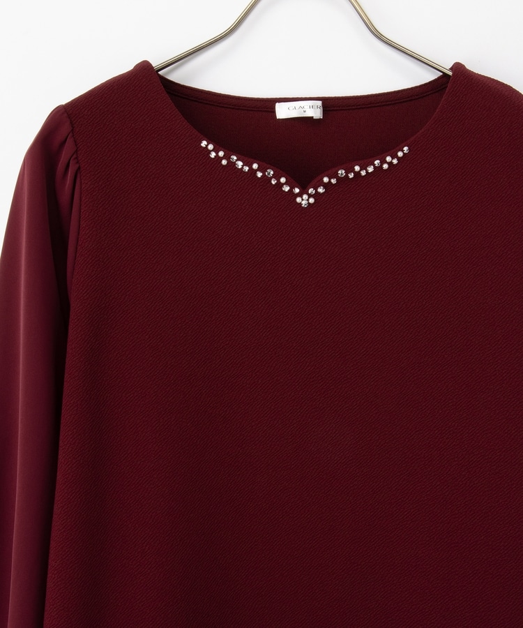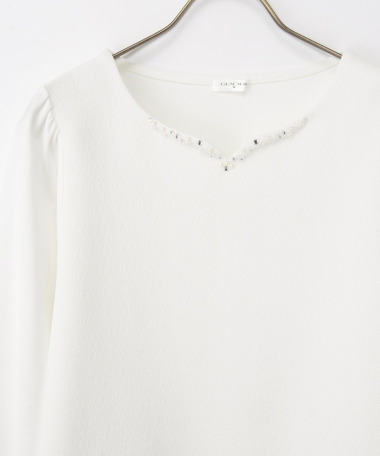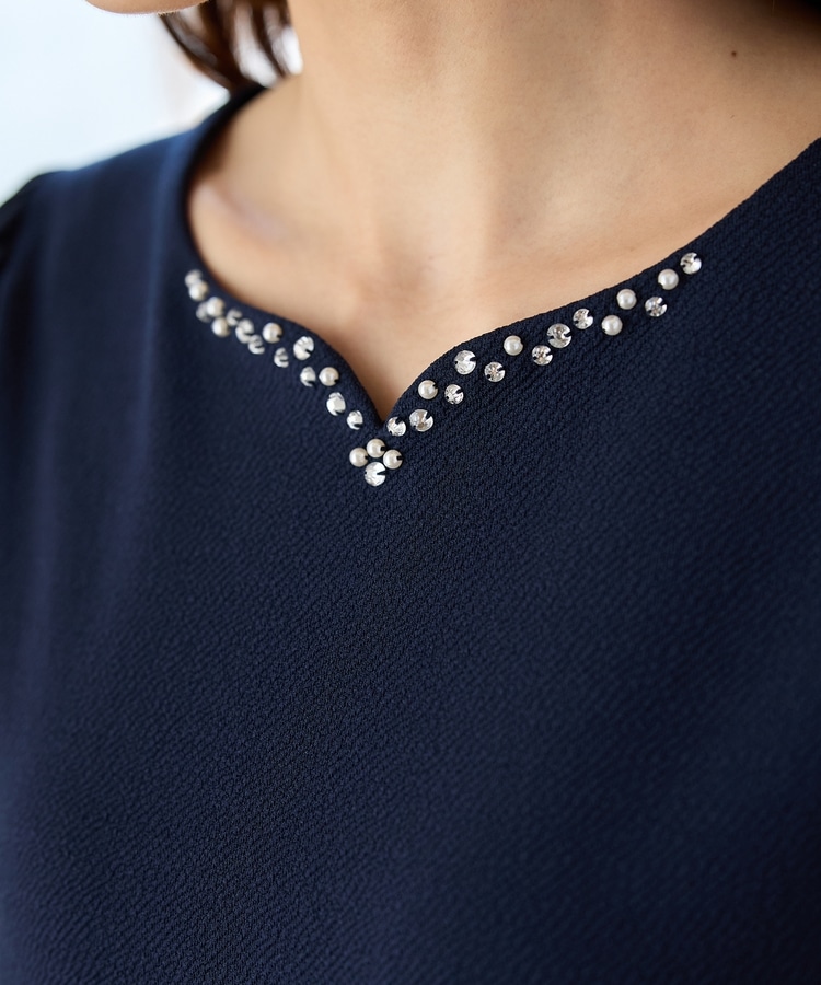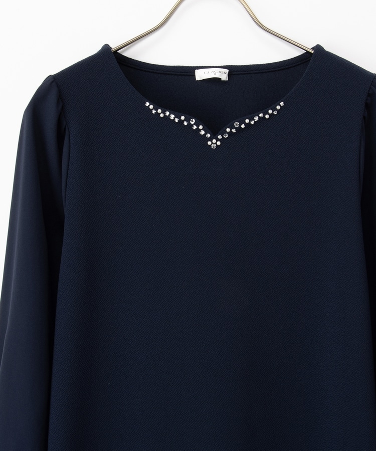 ハートネックと衿ぐりのビジュー使いが華やかで上品なデザイン。