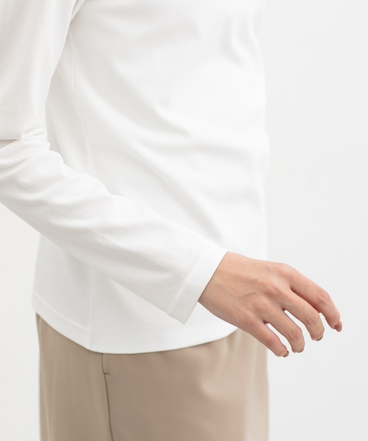 ステッチをなくした広すぎないクルーネックで、高見えが叶う上品デザイン。