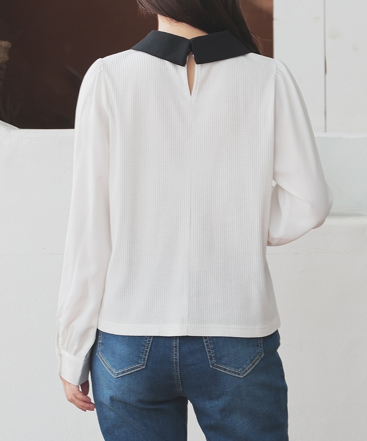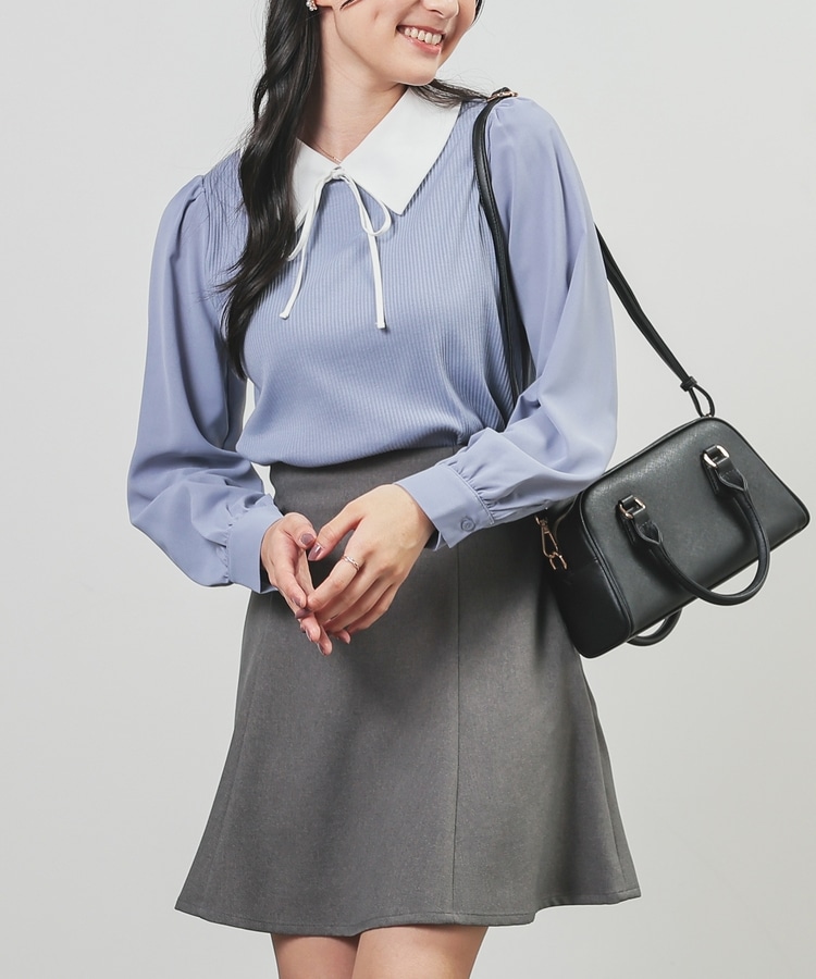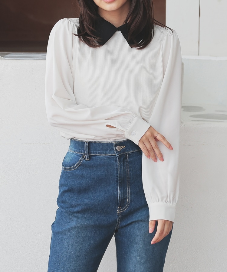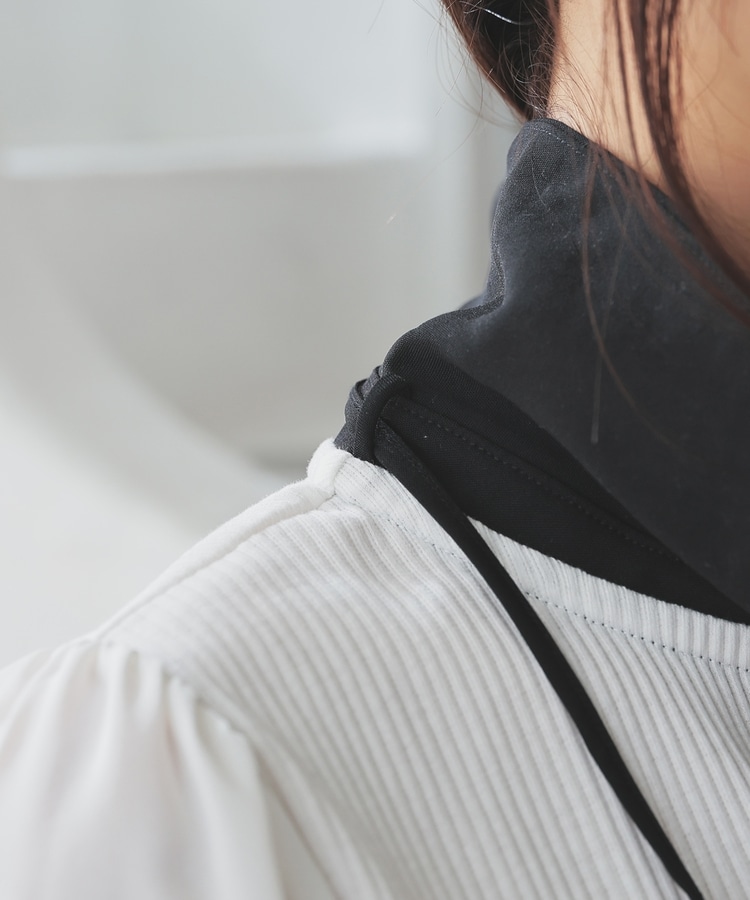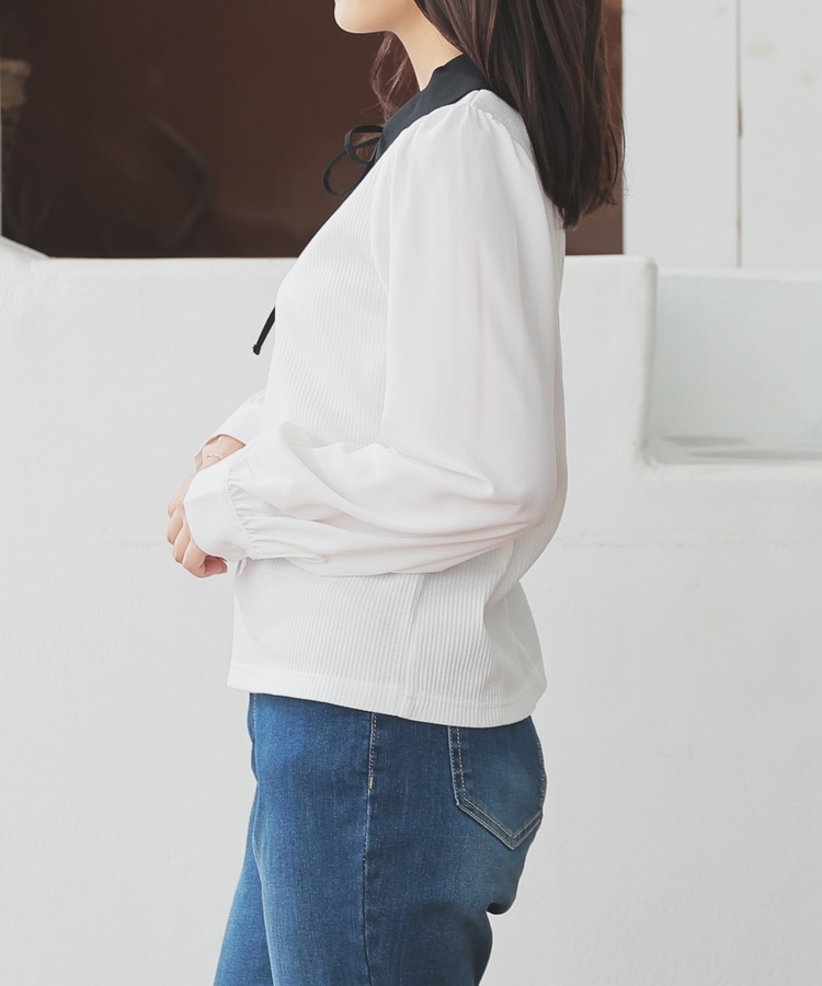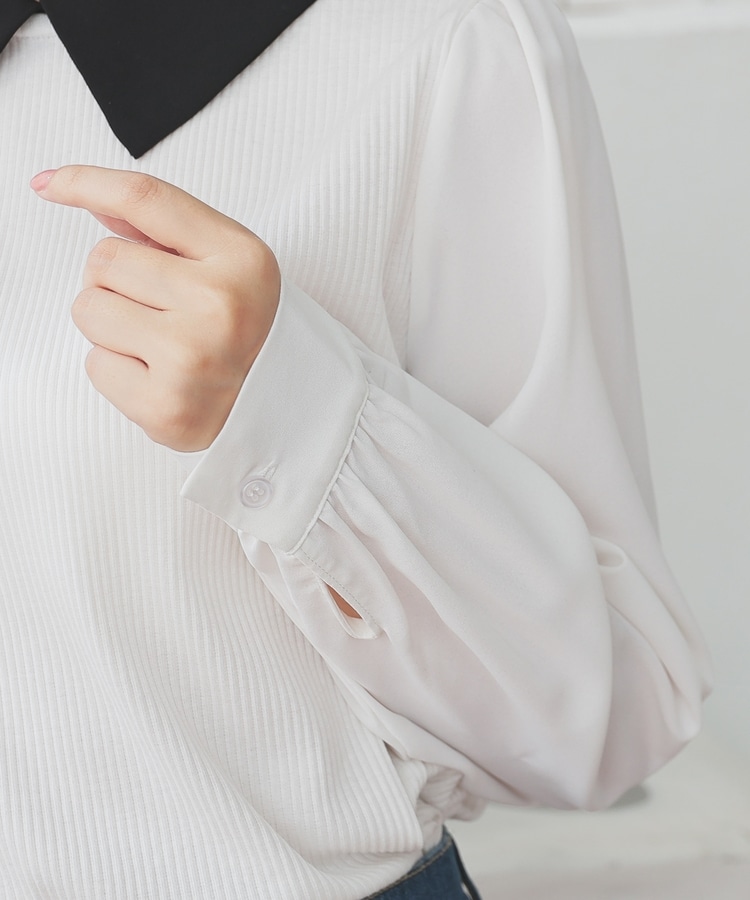 肩と袖口にギャザーを入れた、異素材使いのふんわり袖で、さり気なく二の腕をカバー。