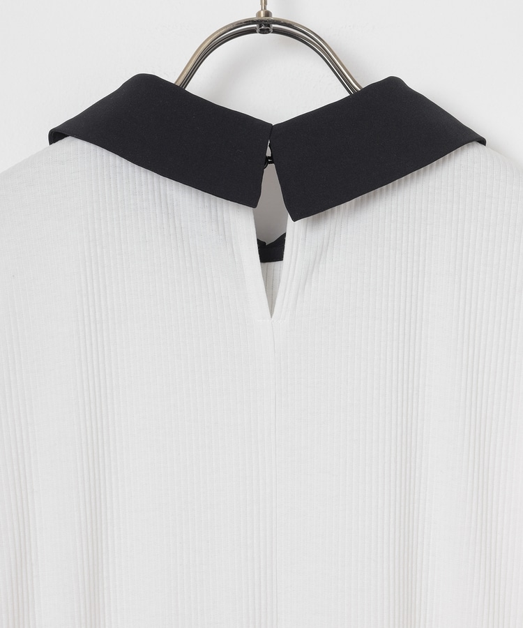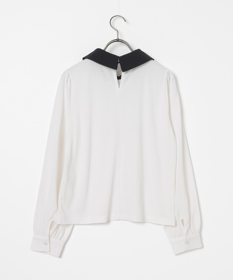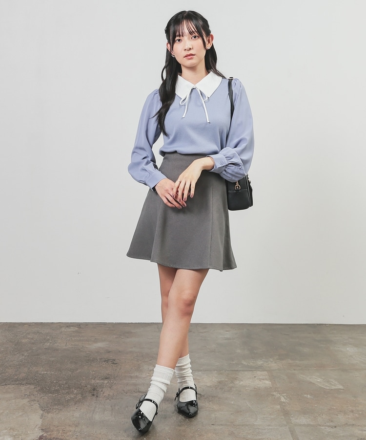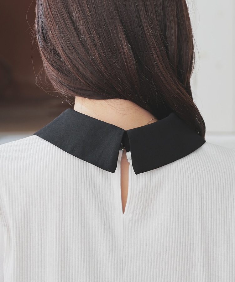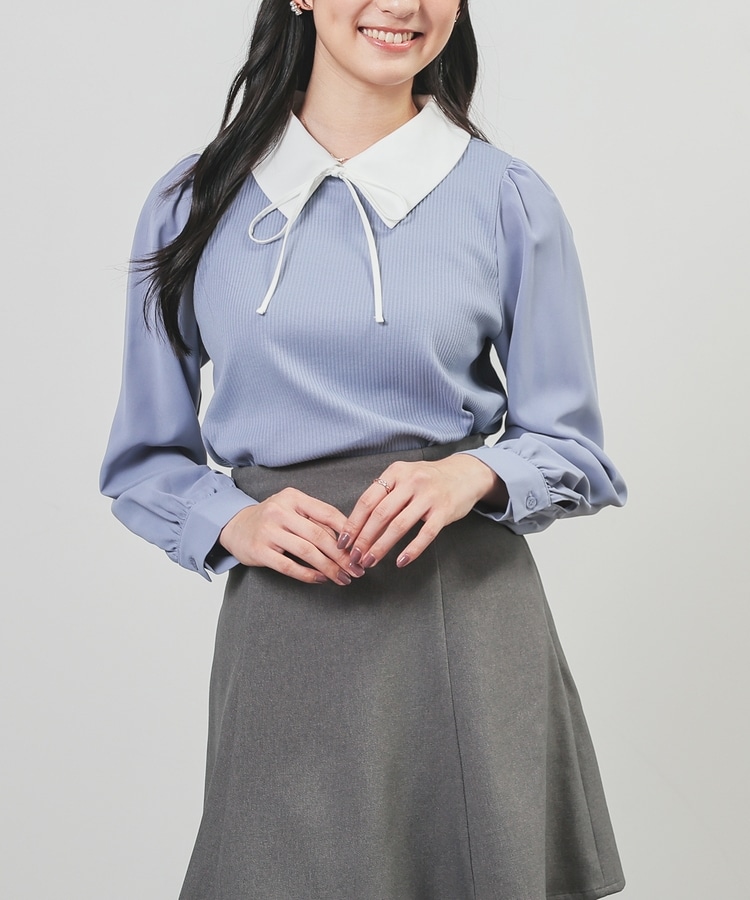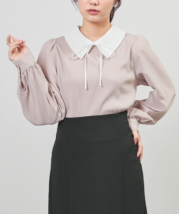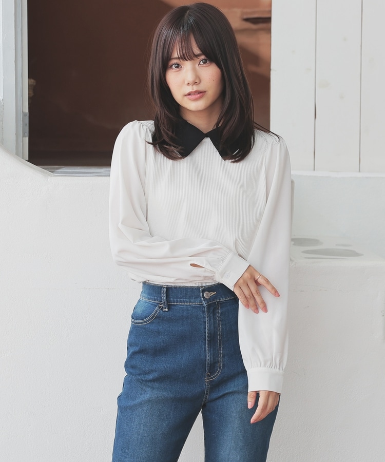 肩と袖口にギャザーを入れた、異素材使いのふんわり袖で、さり気なく二の腕をカバー。
