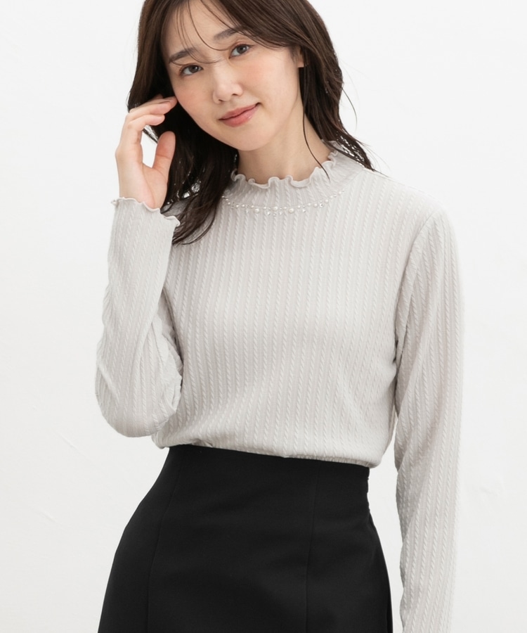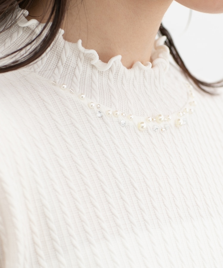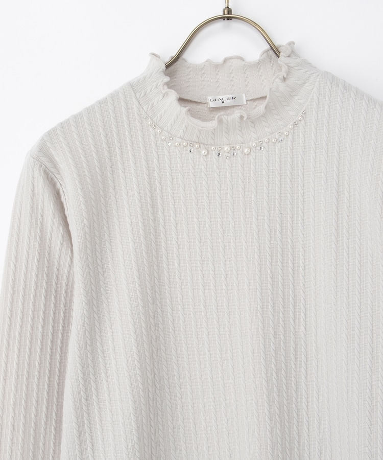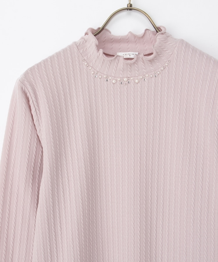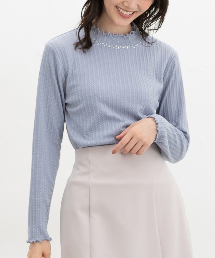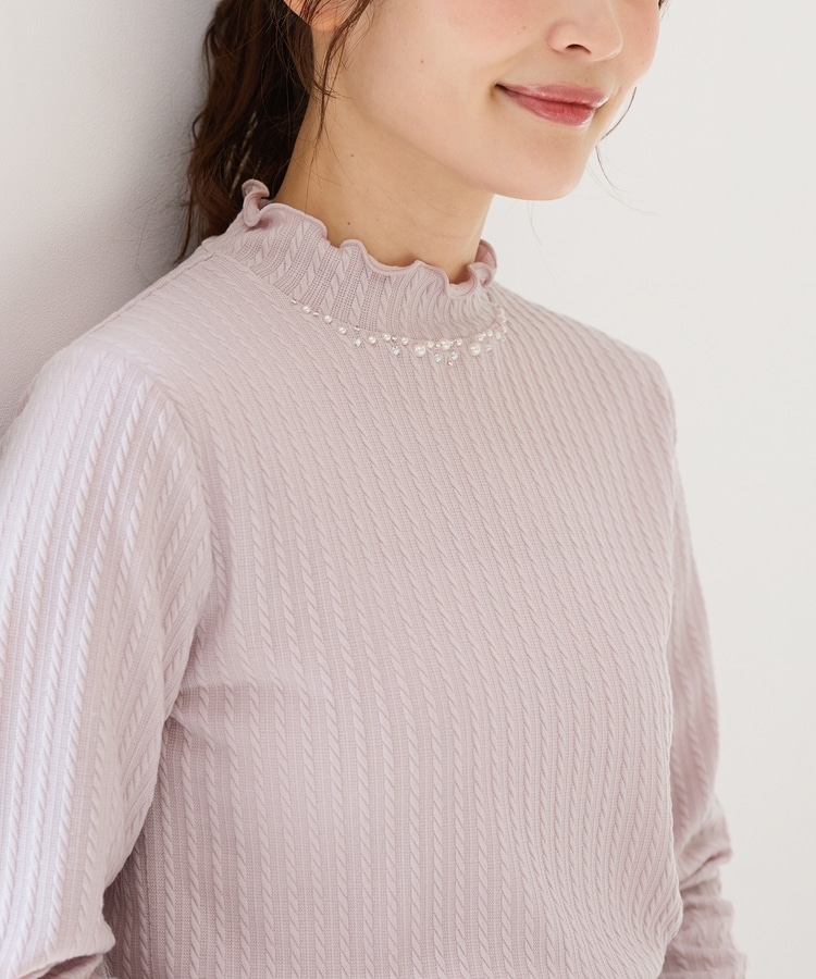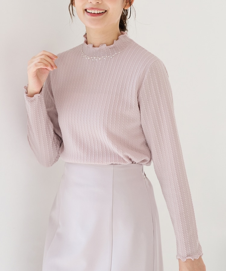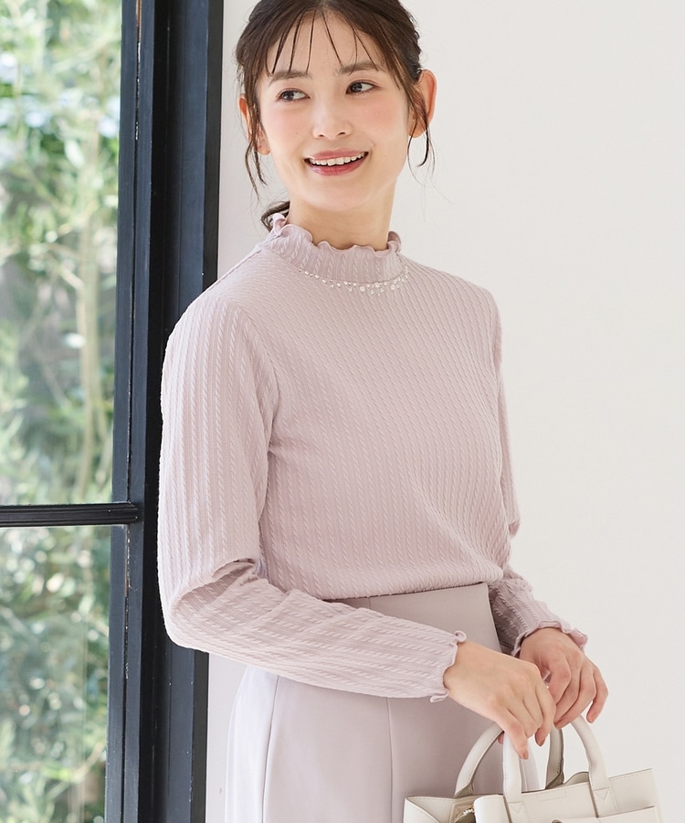 衿ぐり・袖口のメローと衿元のビジューがフェミニンなデザイン。