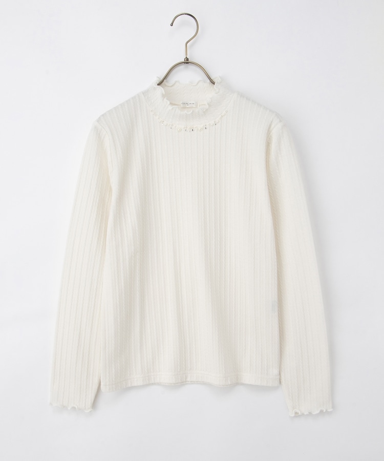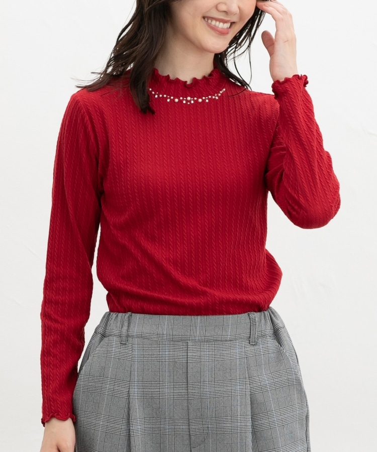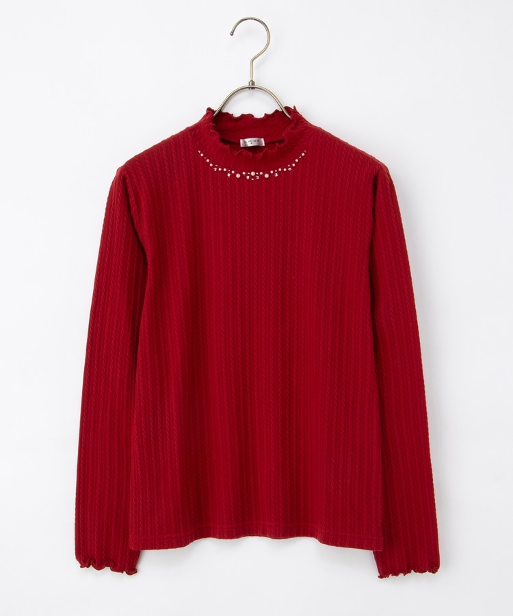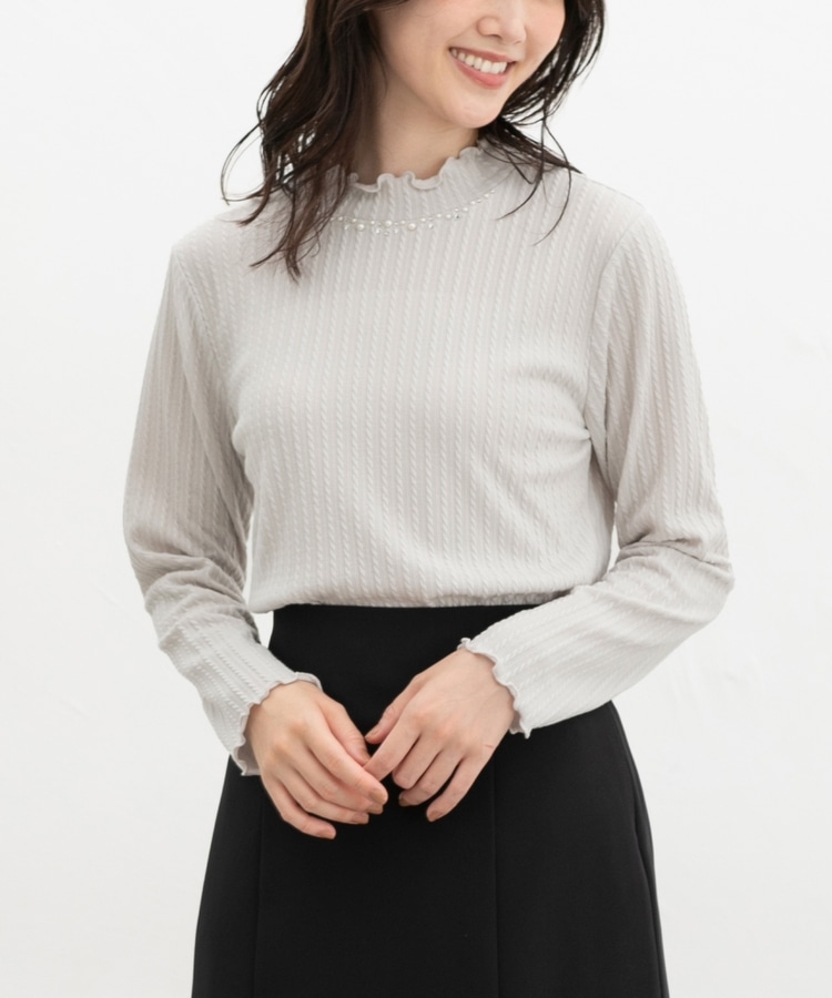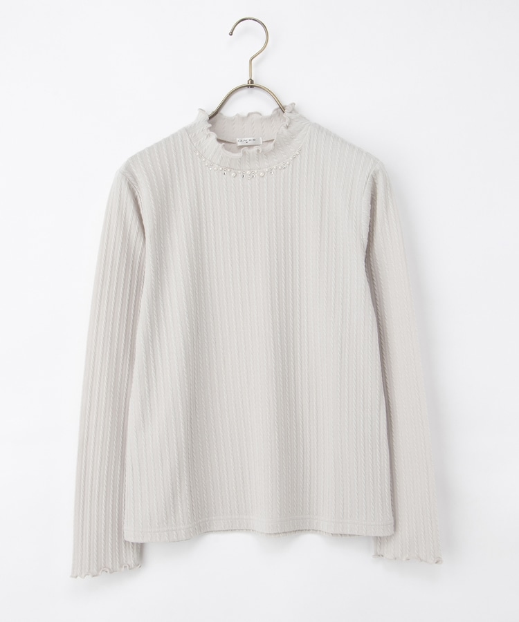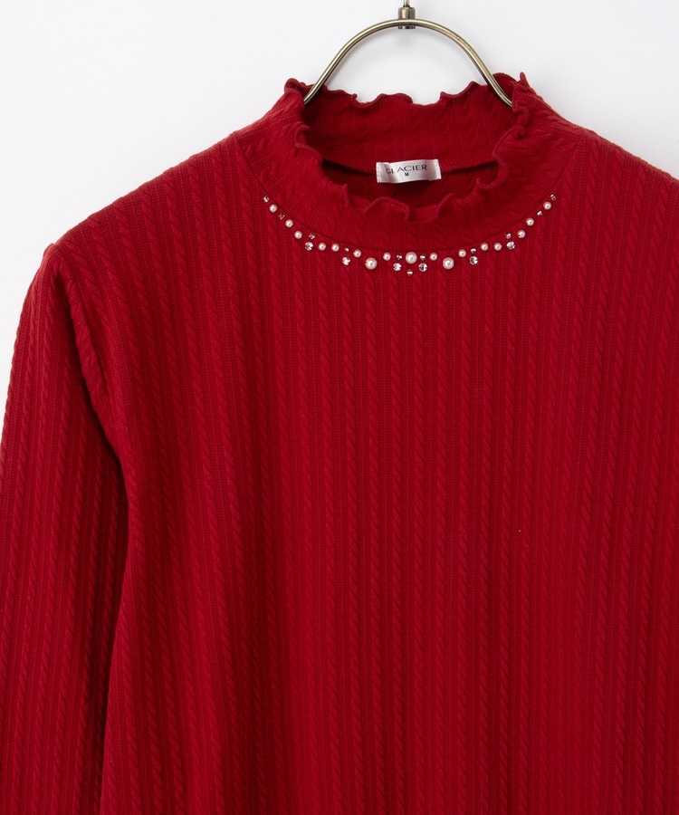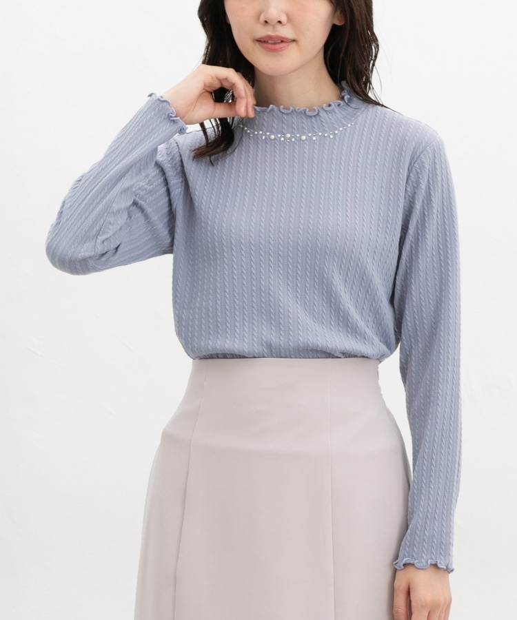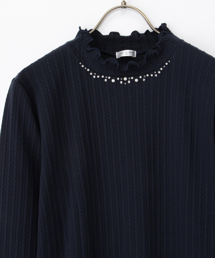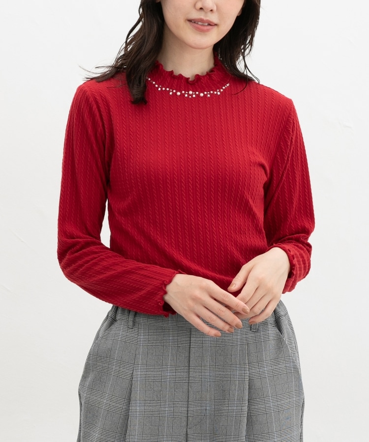 衿ぐり・袖口のメローと衿元のビジューがフェミニンなデザイン。