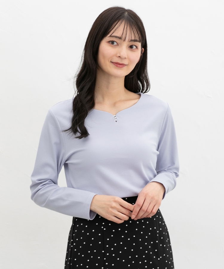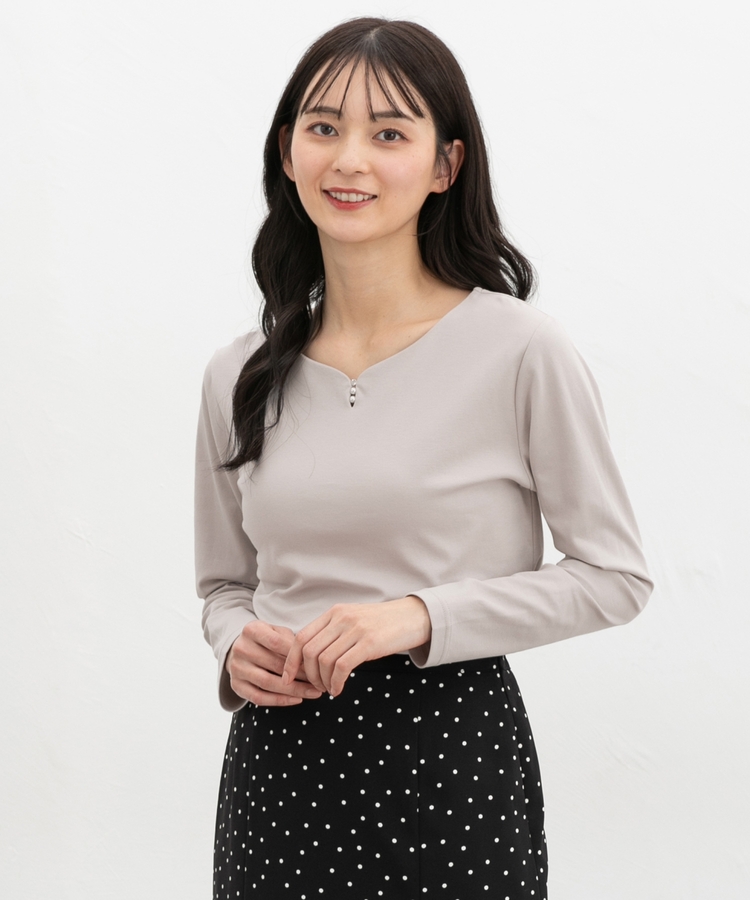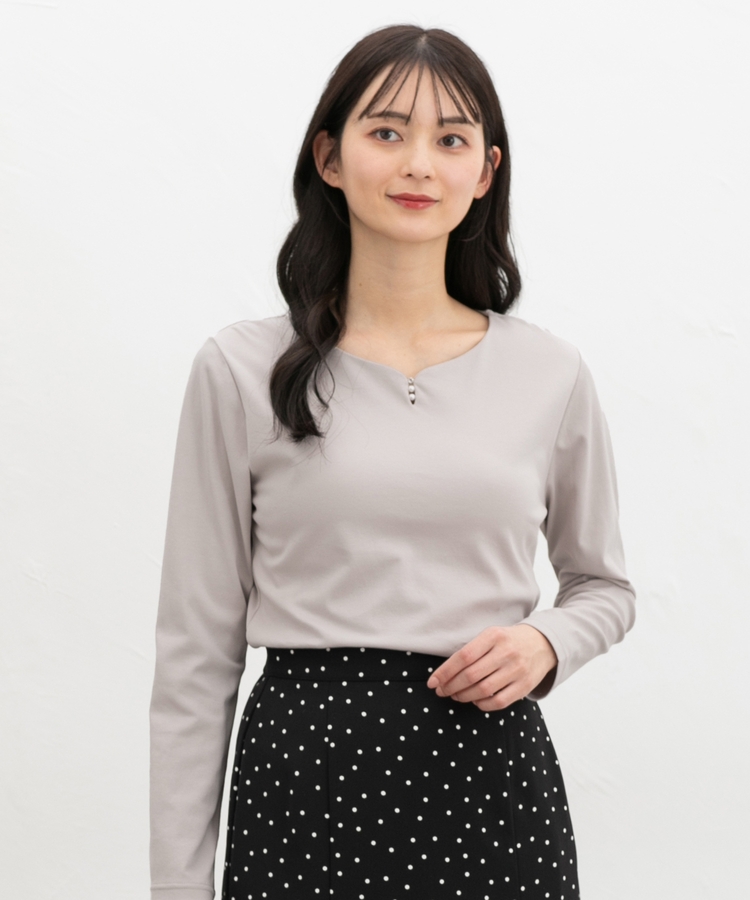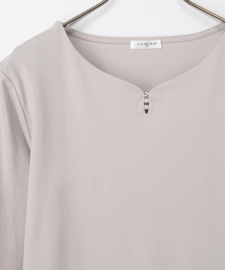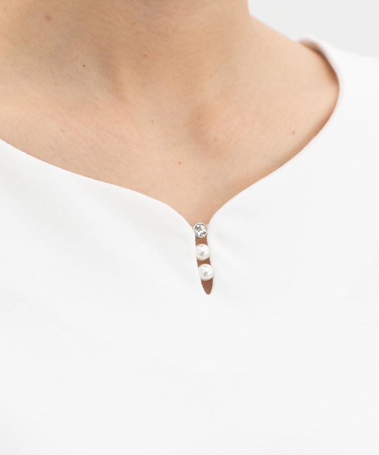 首元がすっきり見えるキーネックに、パール風ビーズやラインストーンを添えた、華やかで上品なデザイン。