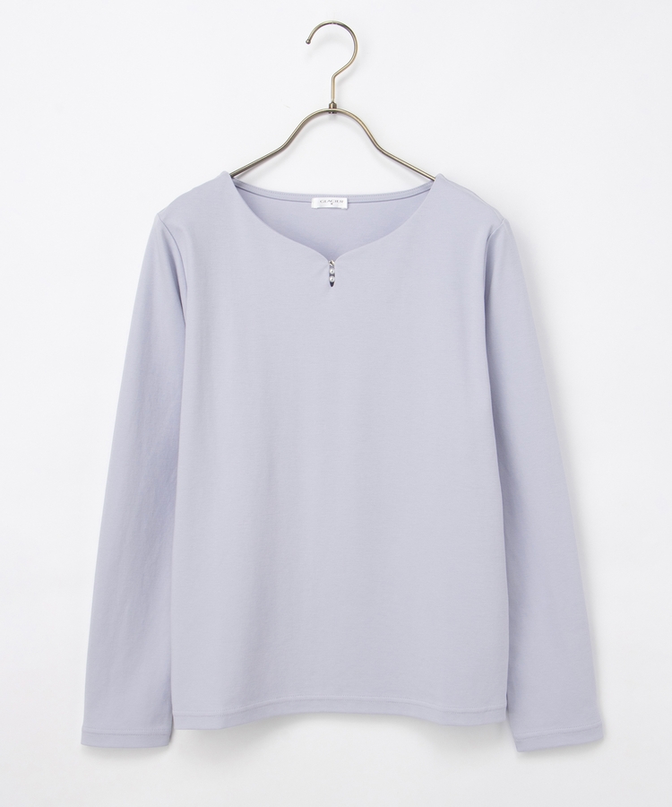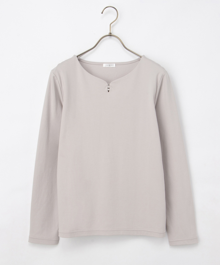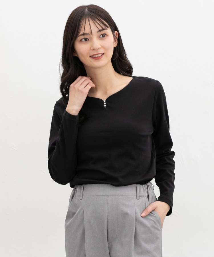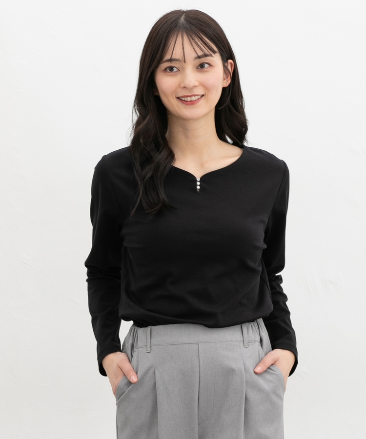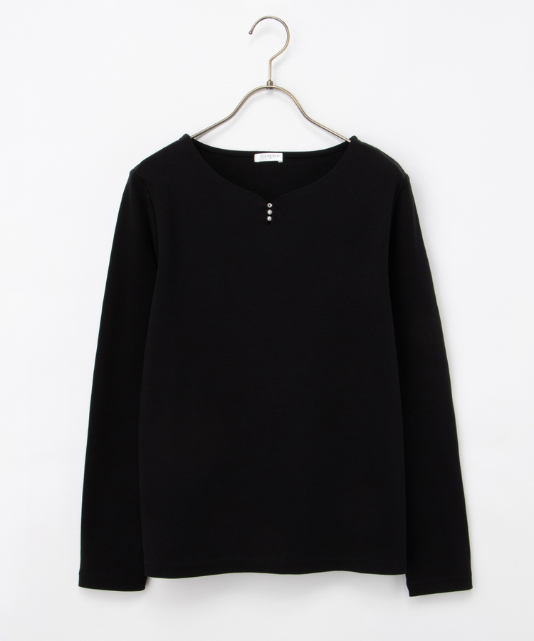 首元がすっきり見えるキーネックに、パール風ビーズやラインストーンを添えた、華やかで上品なデザイン。