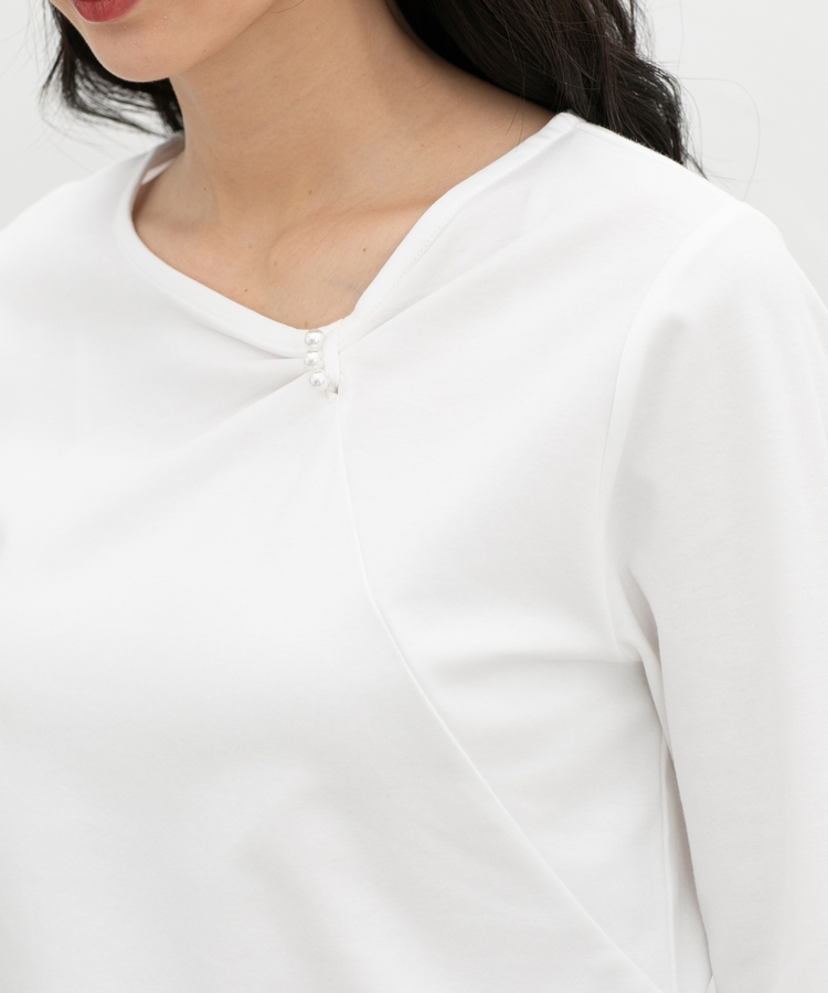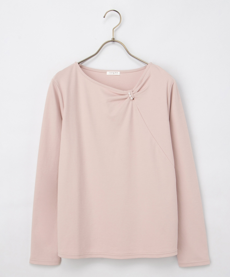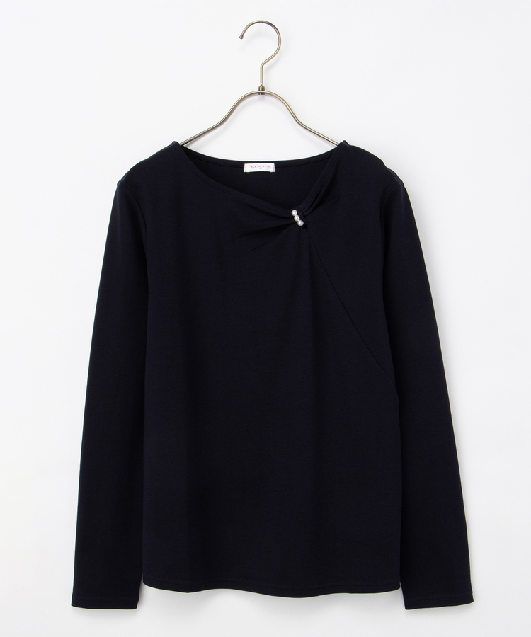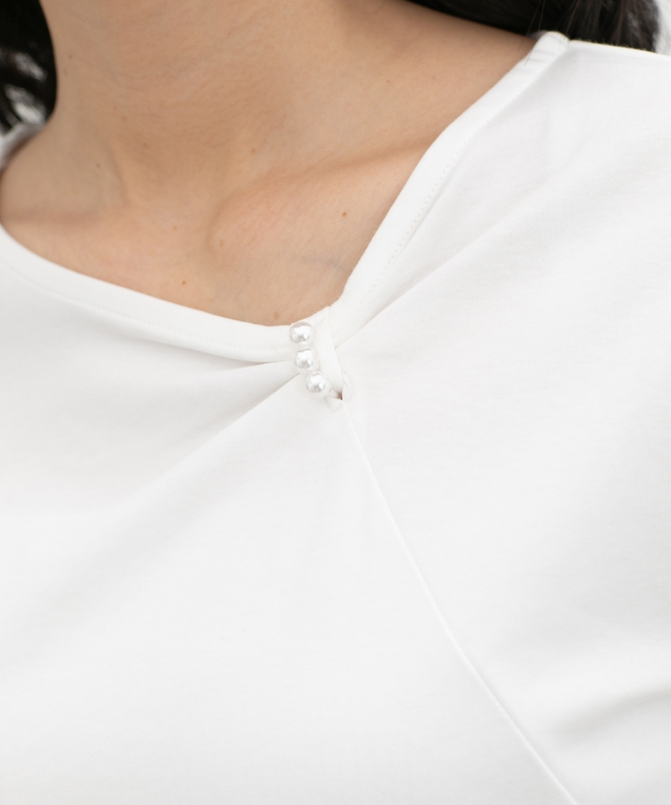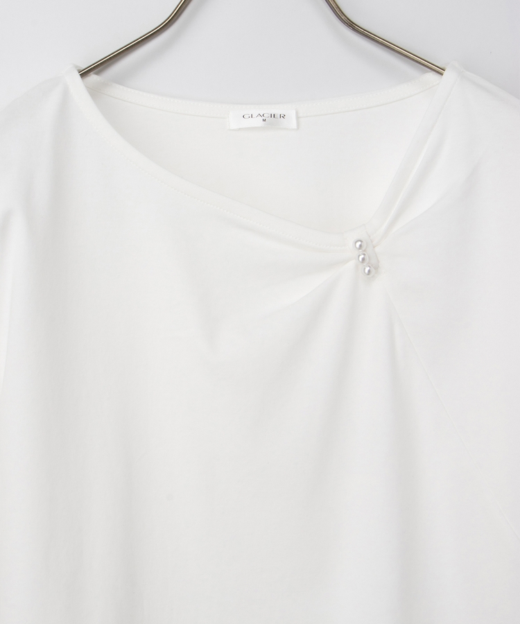 アシンメトリーなリボンディテールにパール風ビーズを添えた華やかで上品なデザイン。