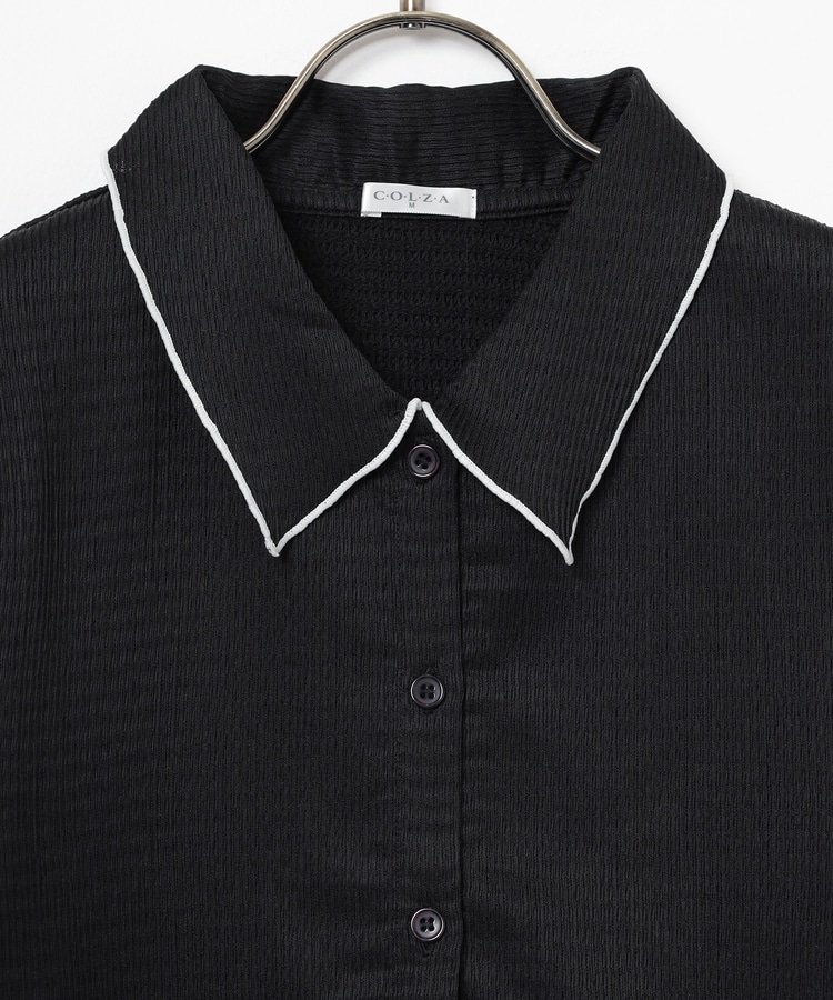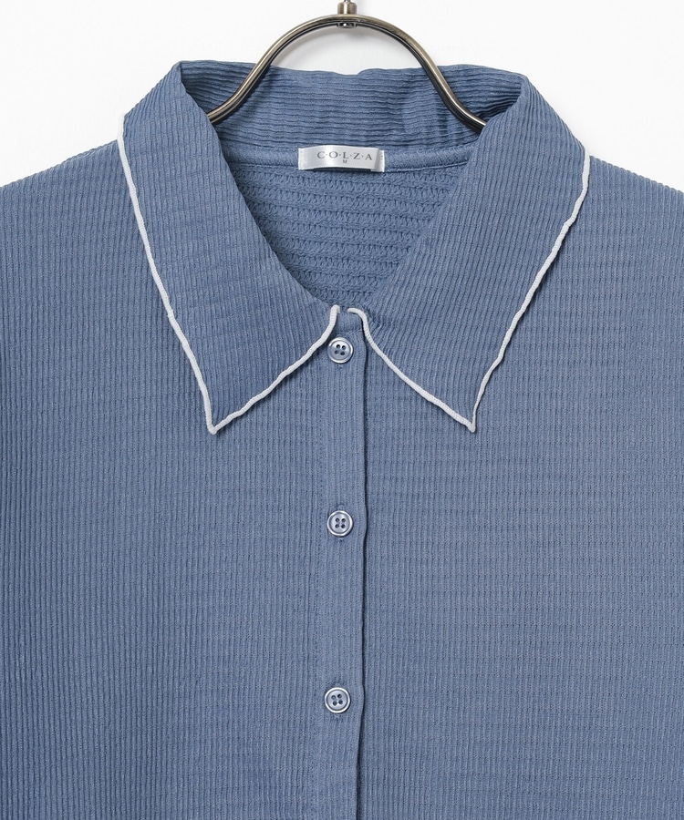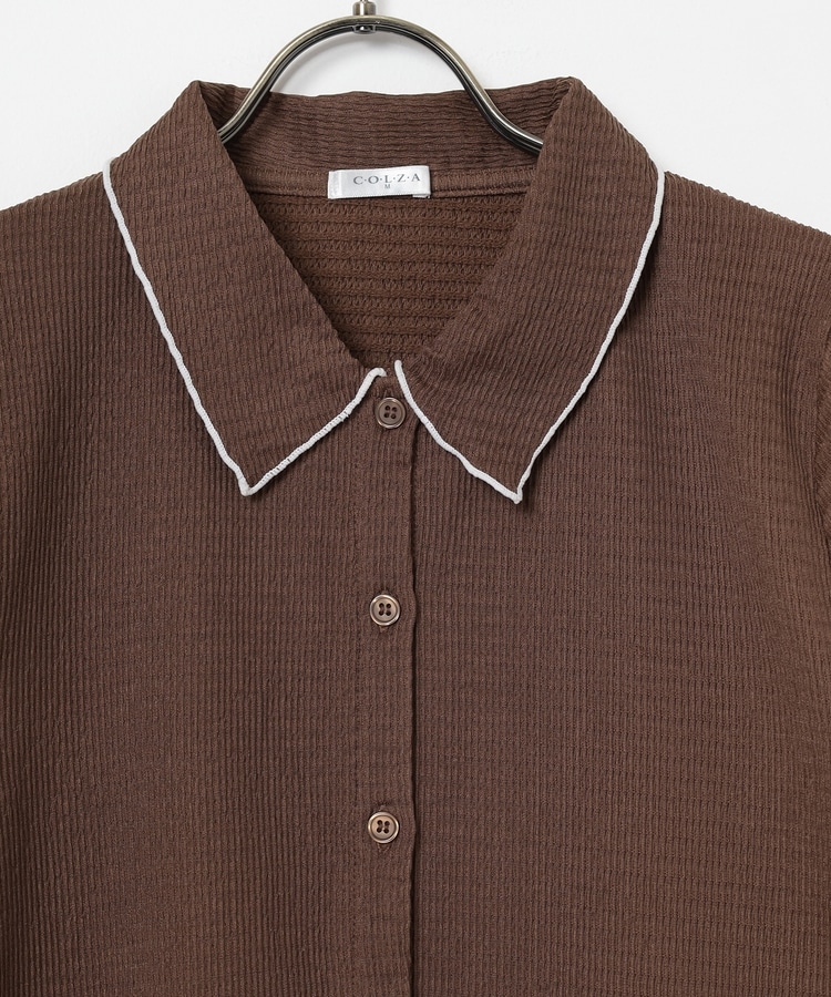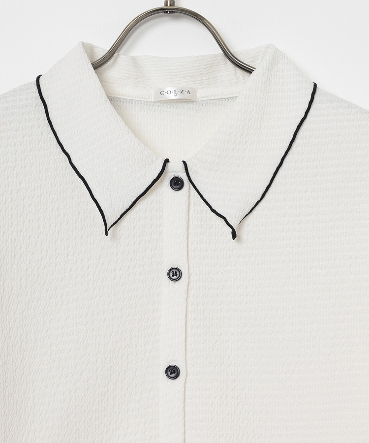 シンプルながら、衿周りや袖口、裾のメロー使いがアクセントになるデザイン。