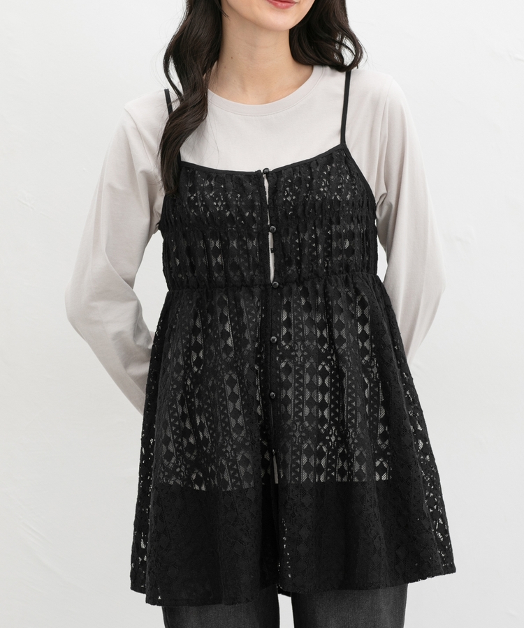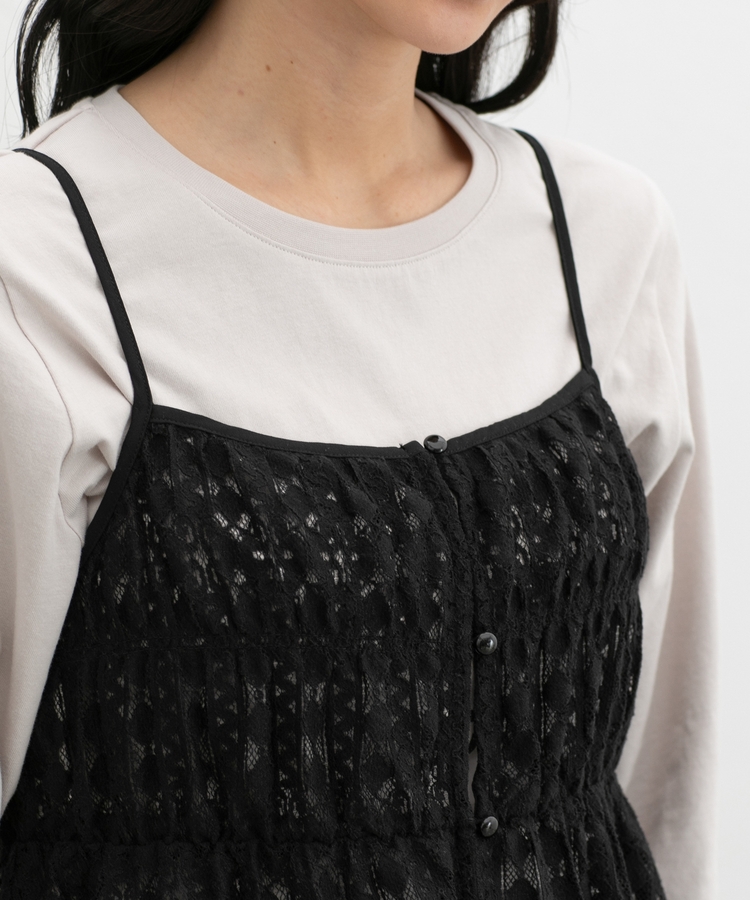 総レース×シャーリングの、華やかでフェミニンなデザイン。