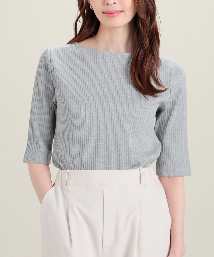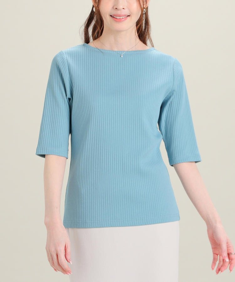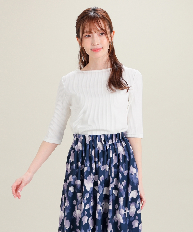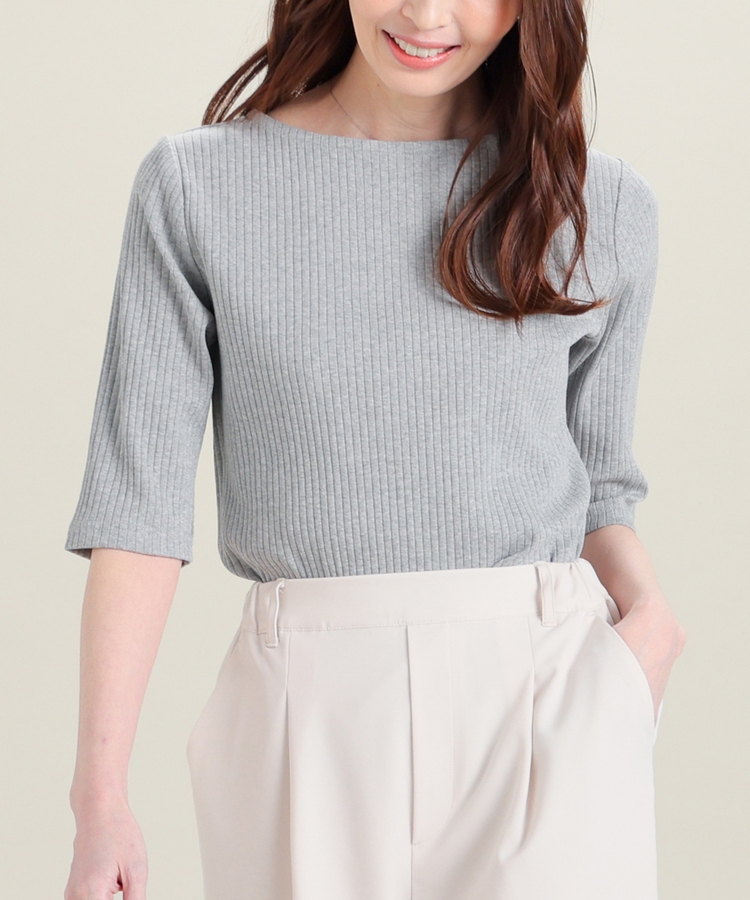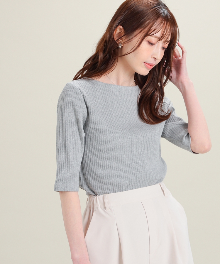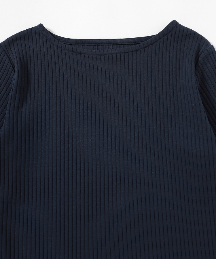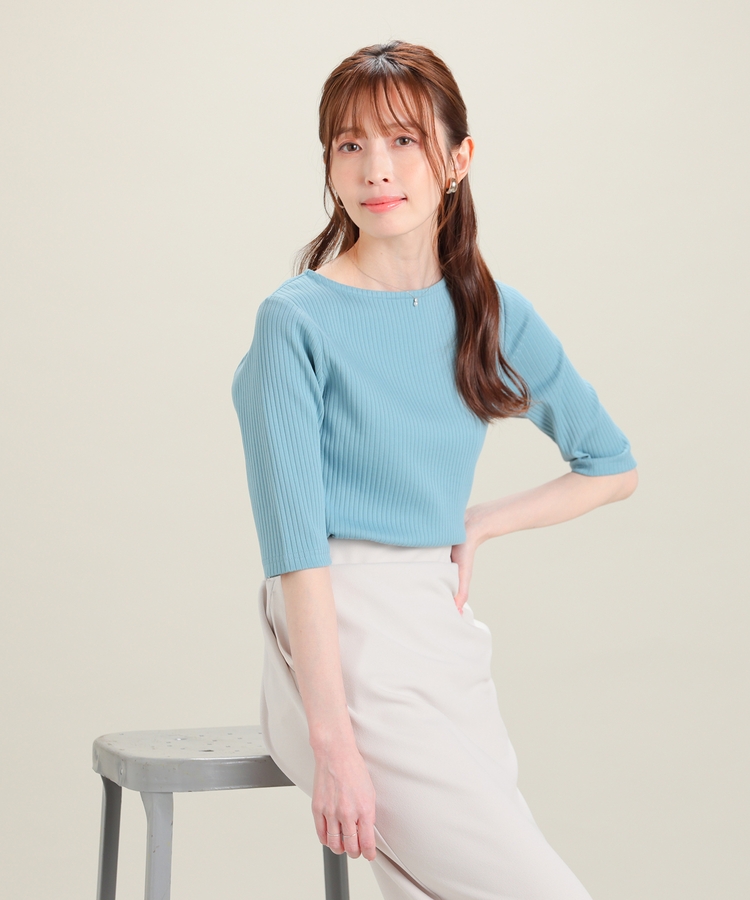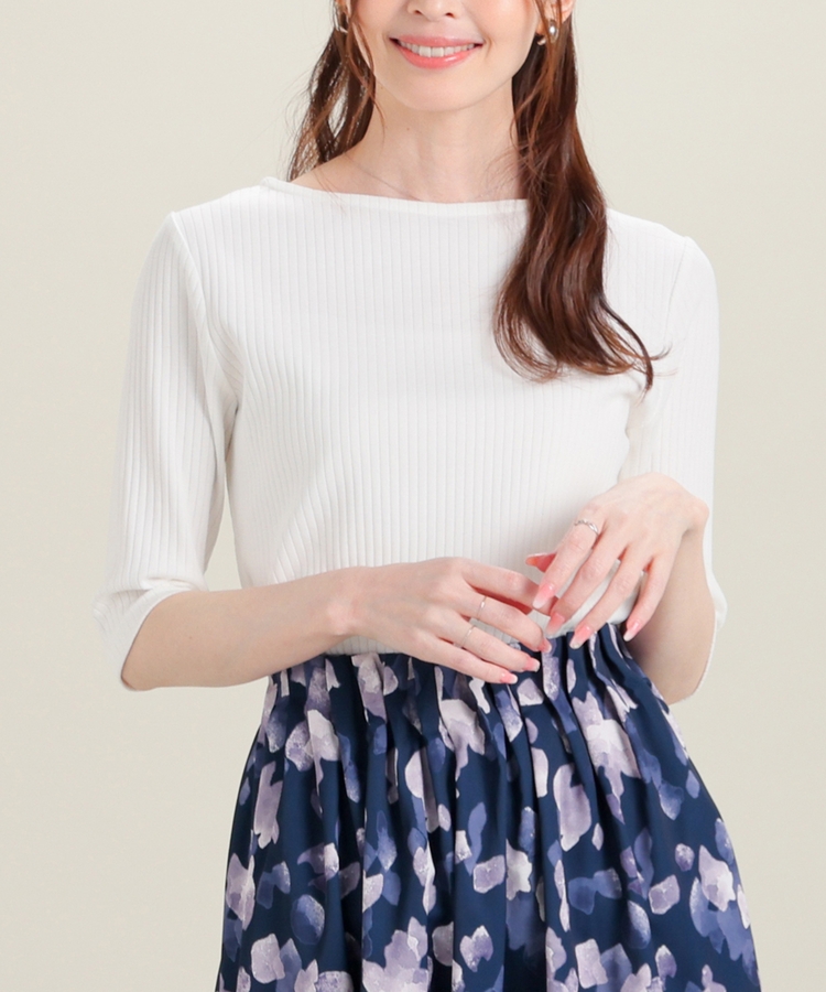 デコルテの露出を抑えたボートネックの、シンプルで上品なデザイン。