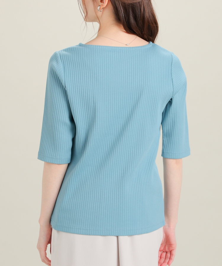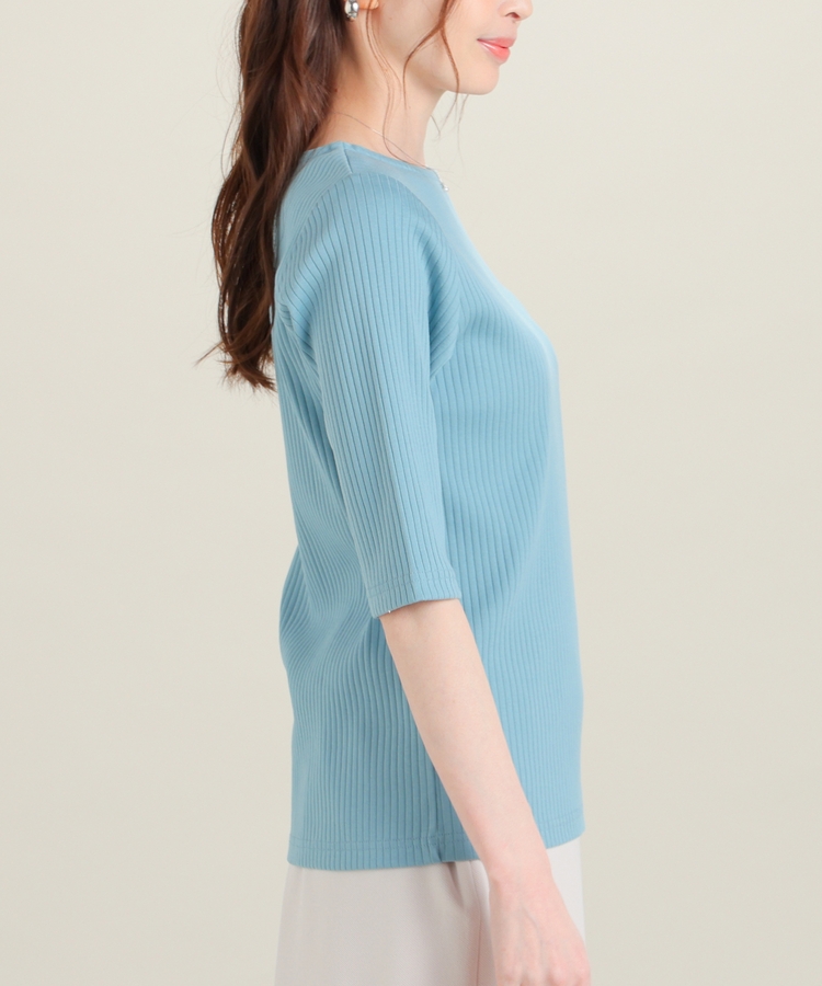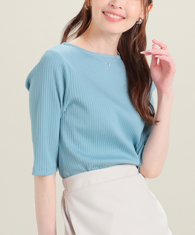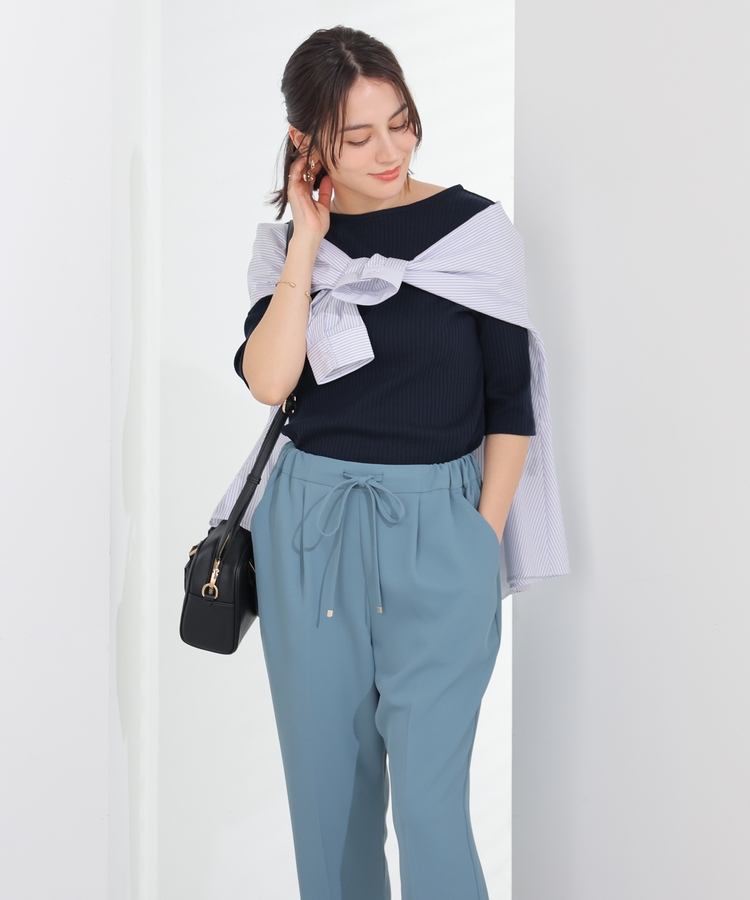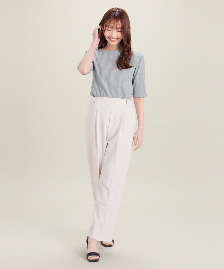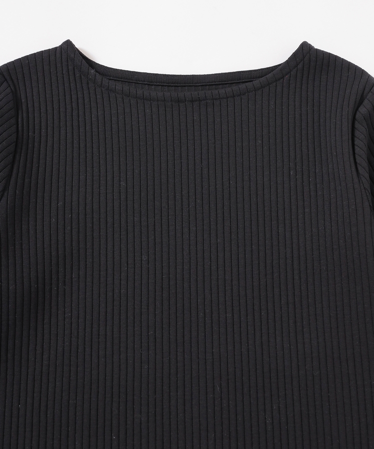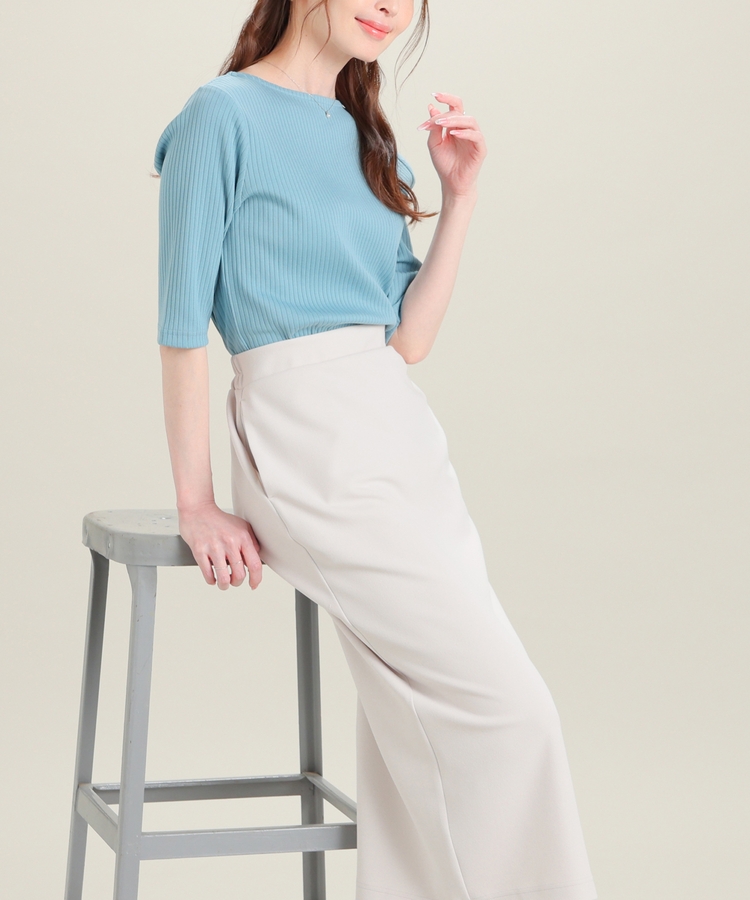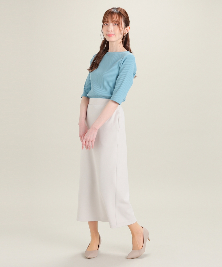 デコルテの露出を抑えたボートネックの、シンプルで上品なデザイン。