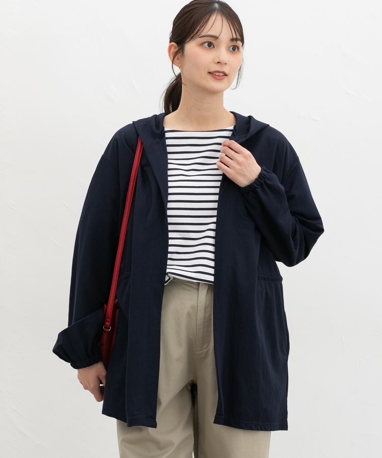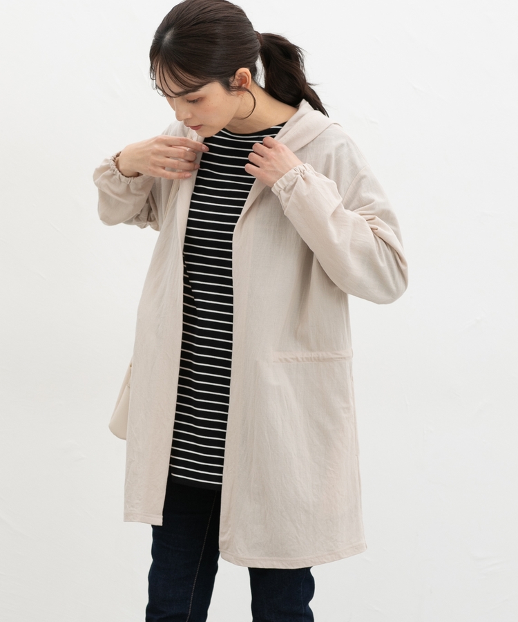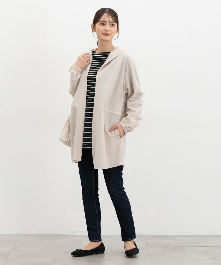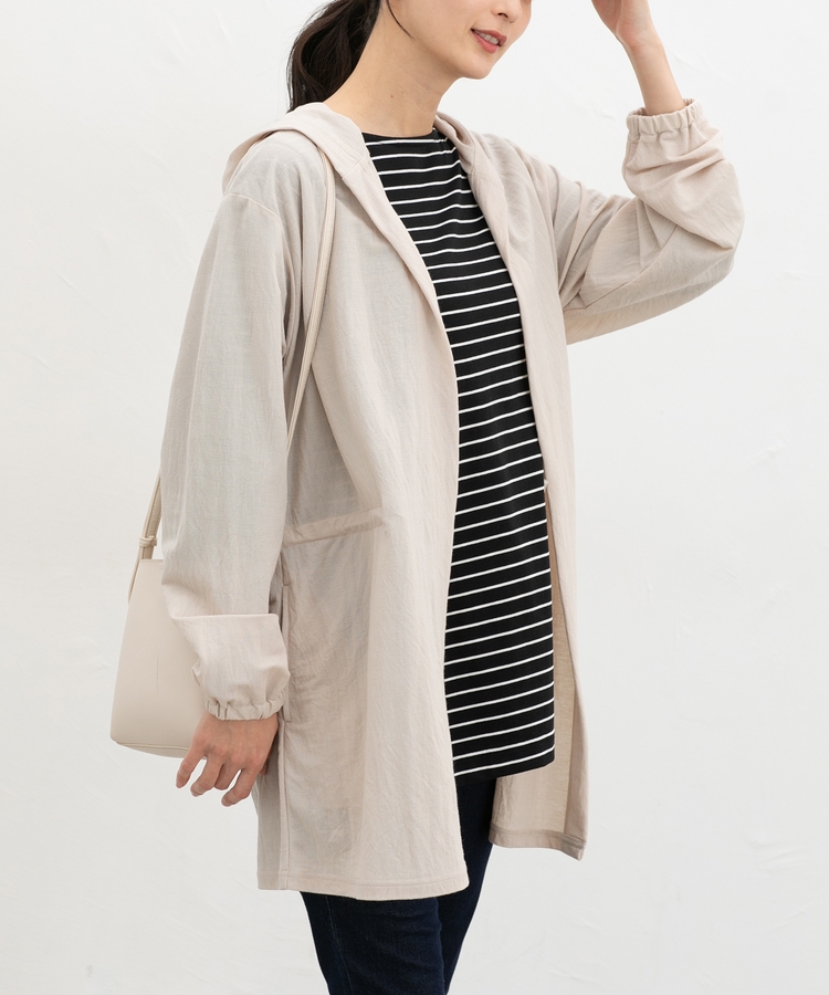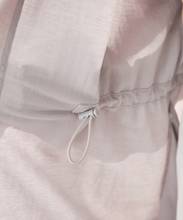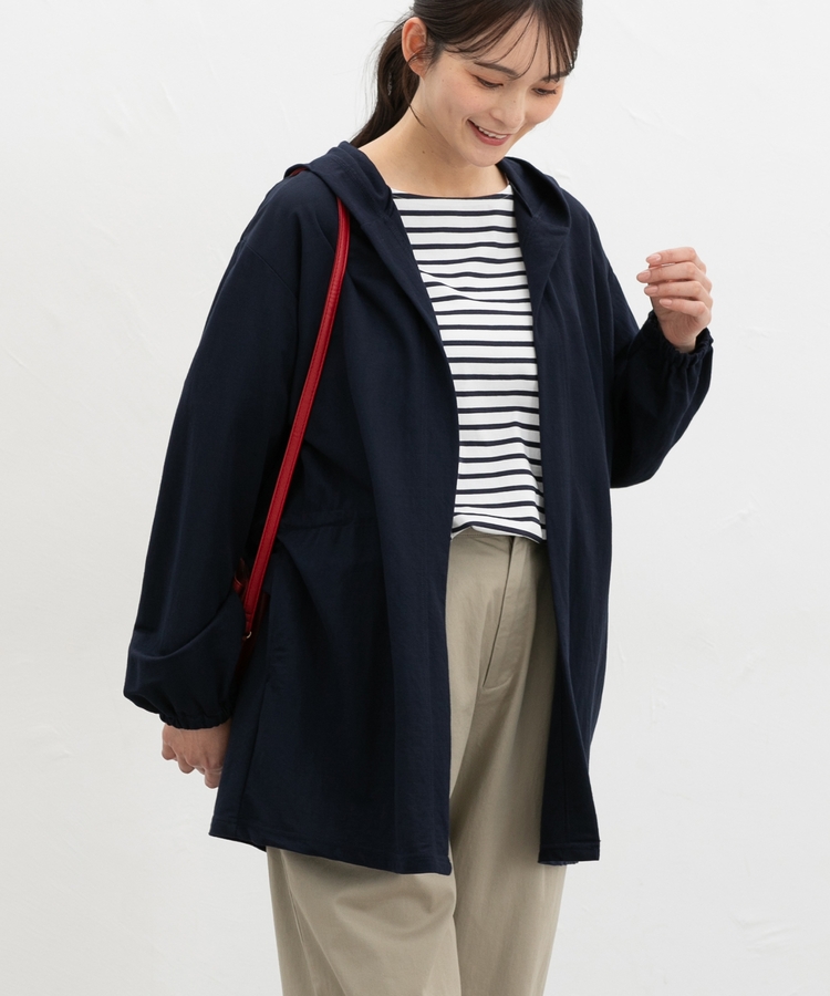 さっと手軽に羽織れるボタンレスで、ウエスト内側のドロストを絞ってシルエットチェンジも楽しめるデザイン。