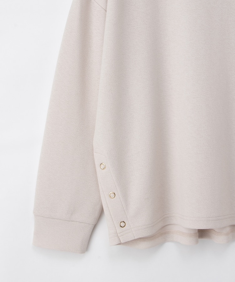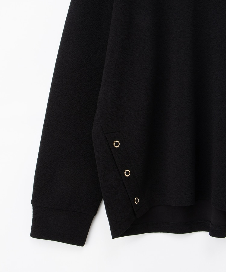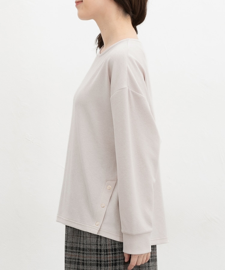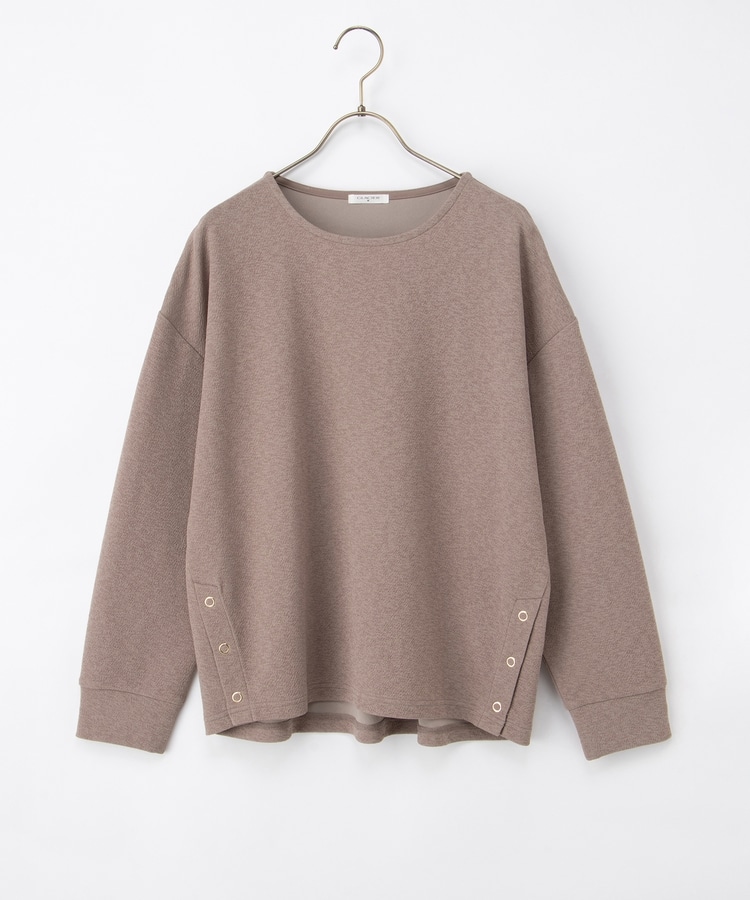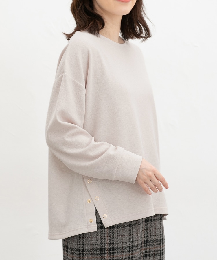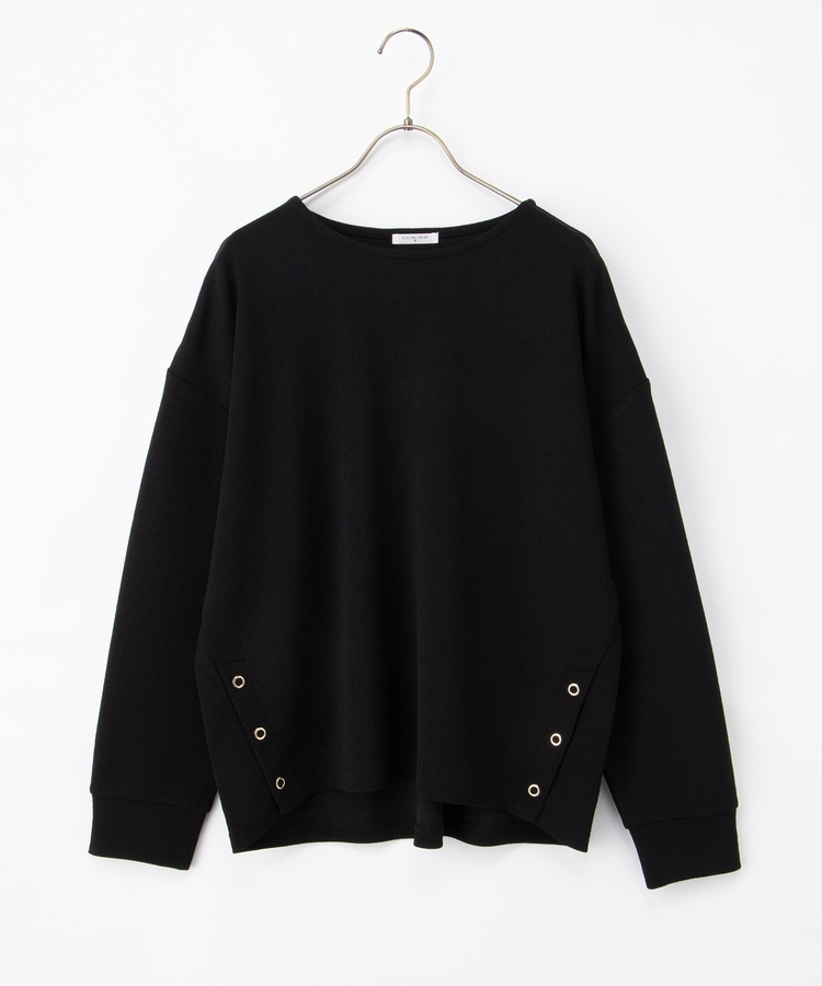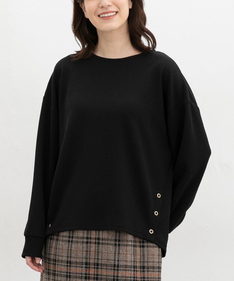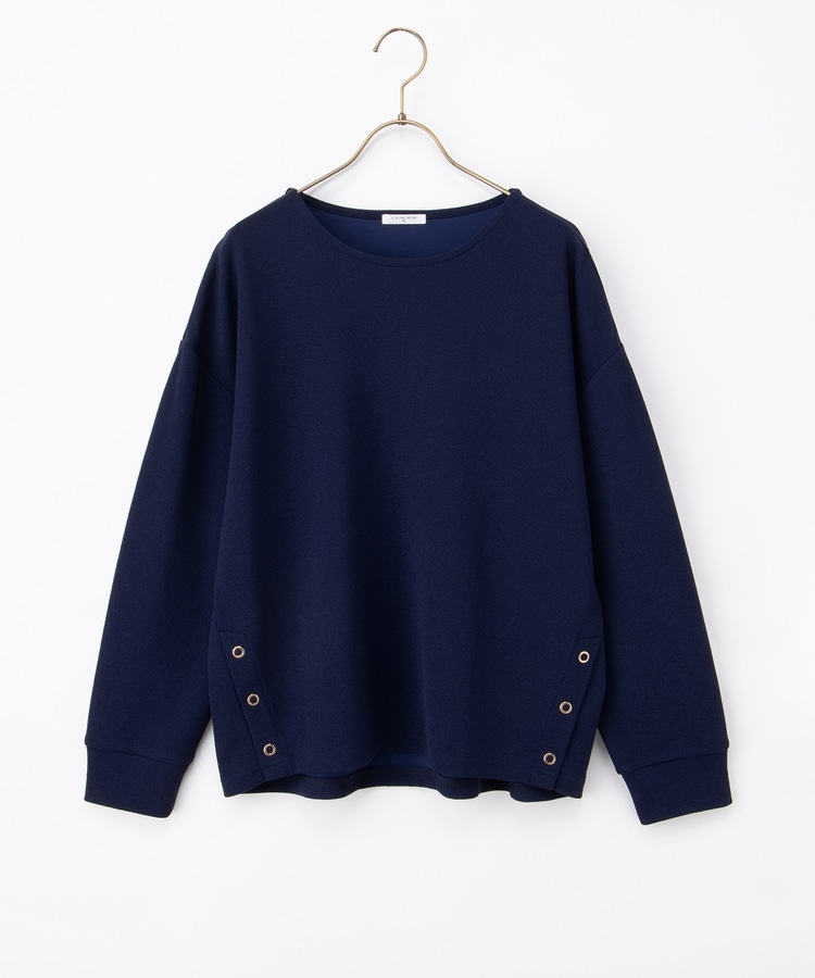 シンプルなクルーネックトップスに、両サイドのリングドットボタンがお洒落なアクセント。