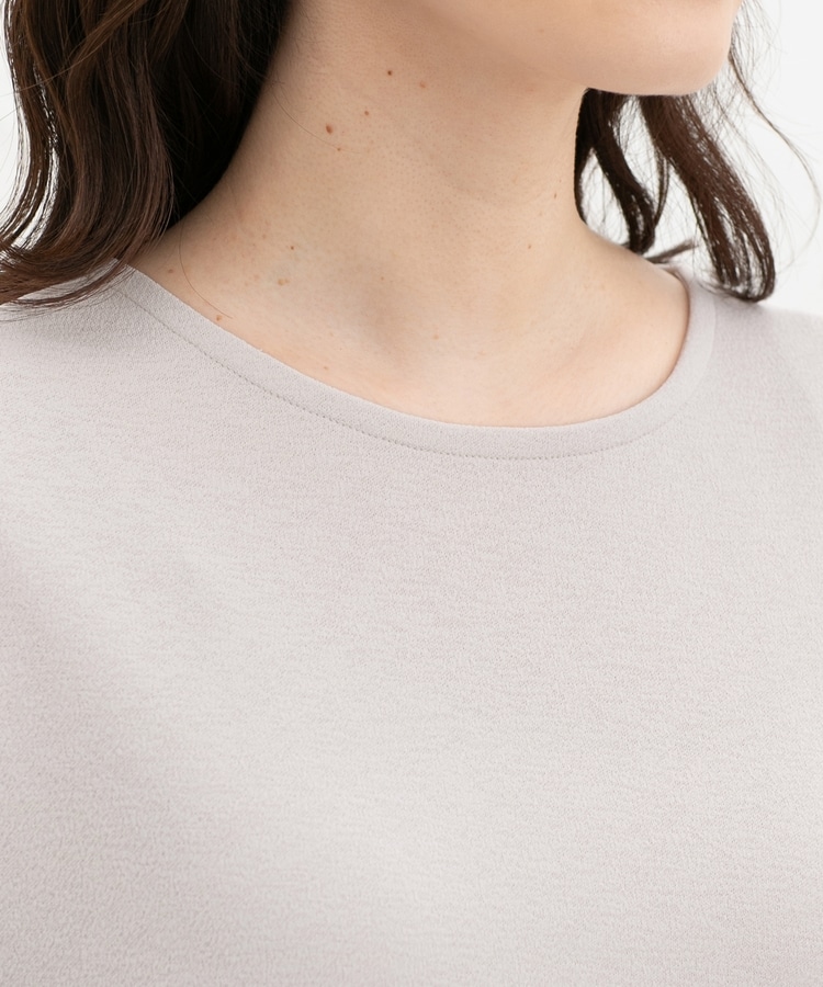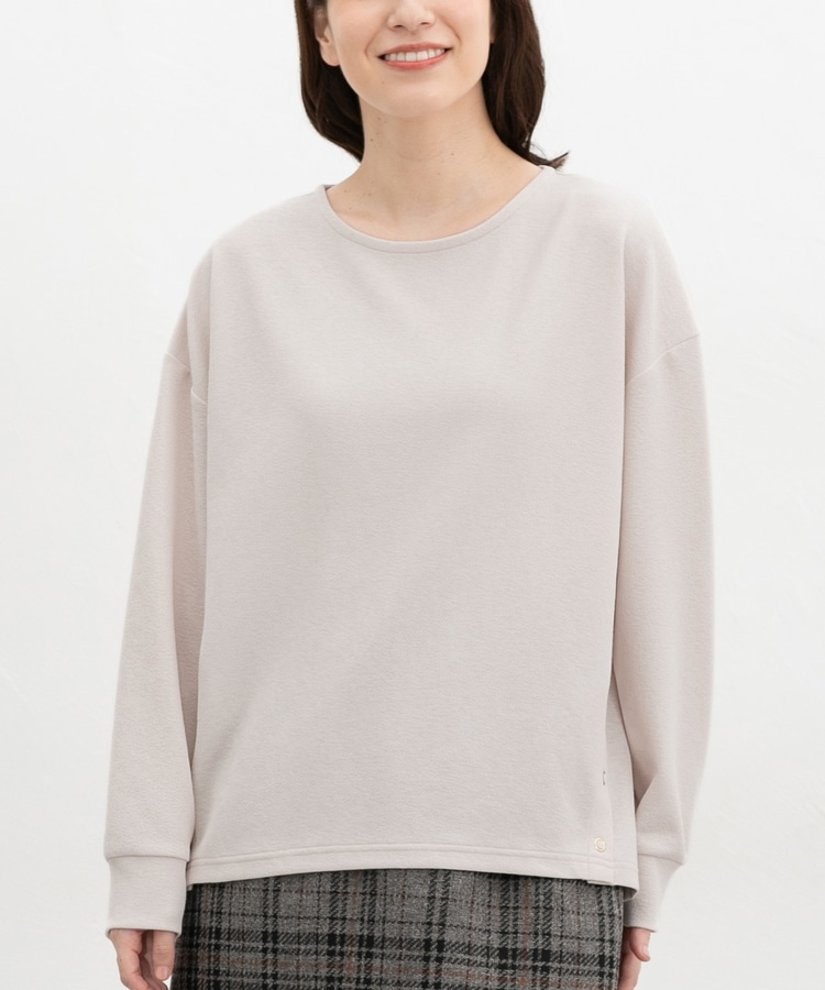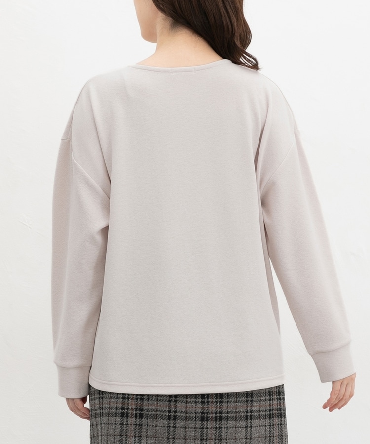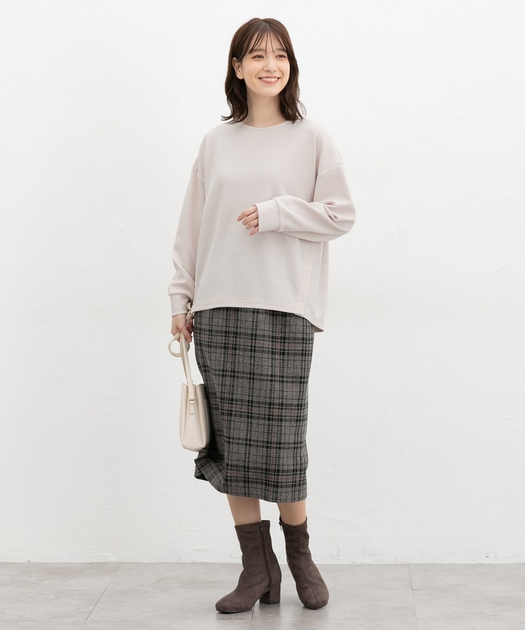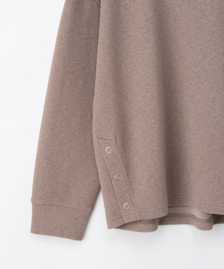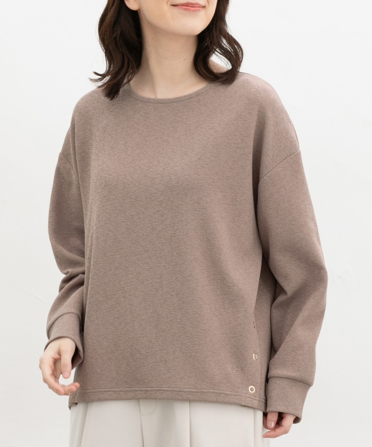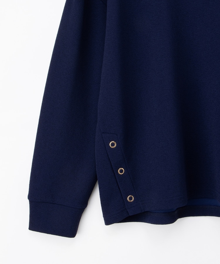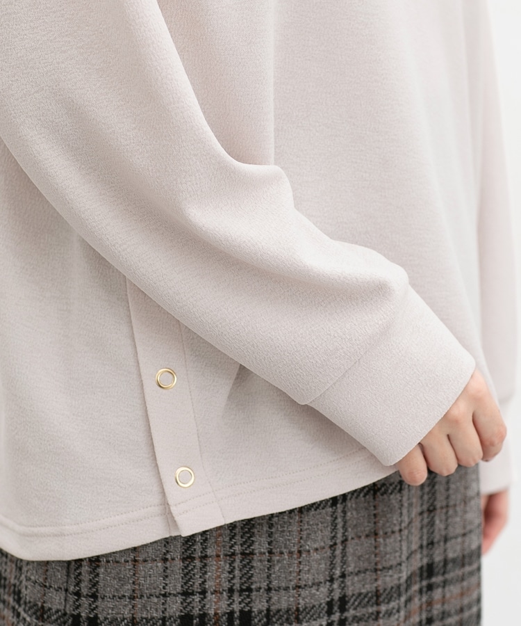 シンプルなクルーネックトップスに、両サイドのリングドットボタンがお洒落なアクセント。