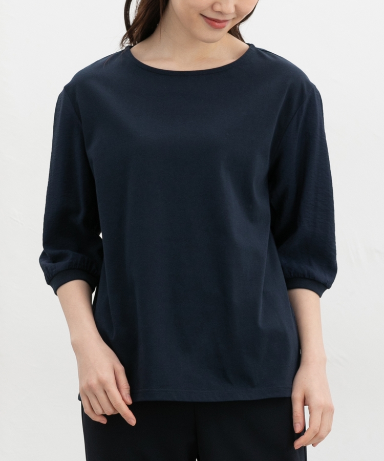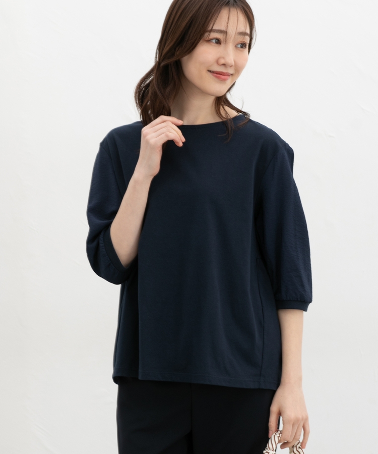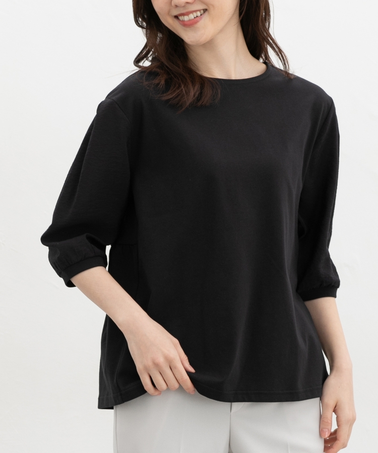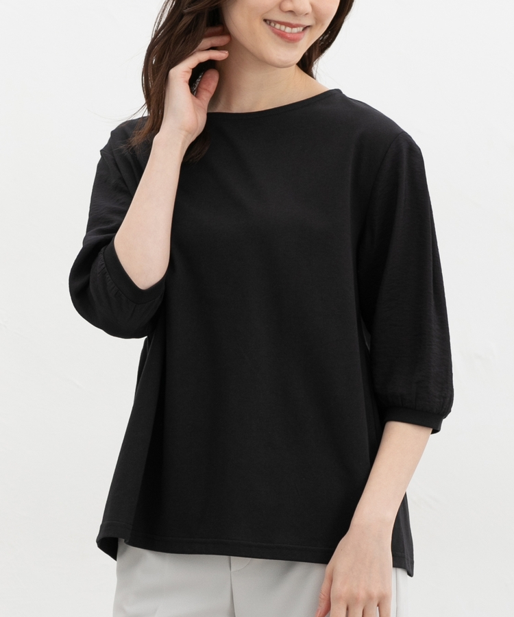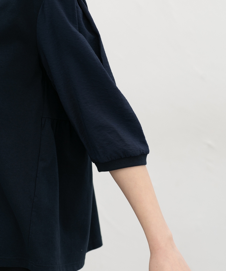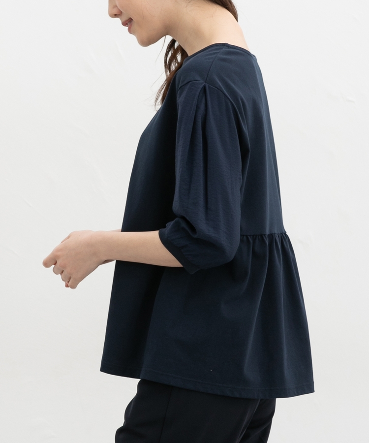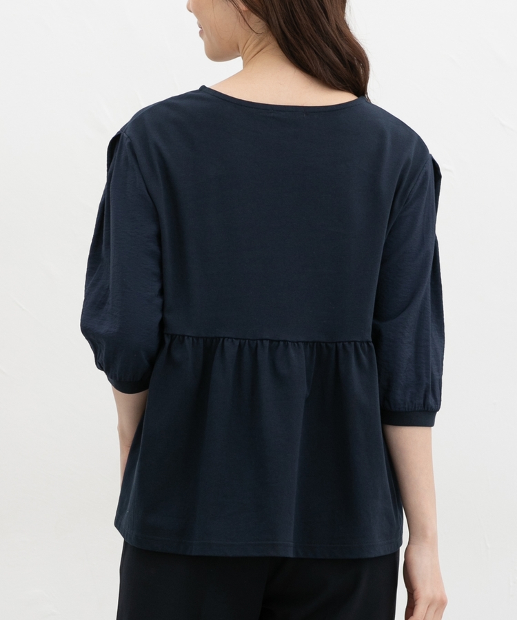 ほどよい透け感のふんわり袖とたっぷりギャザーのバック切り替えが大人可愛いデザイン。